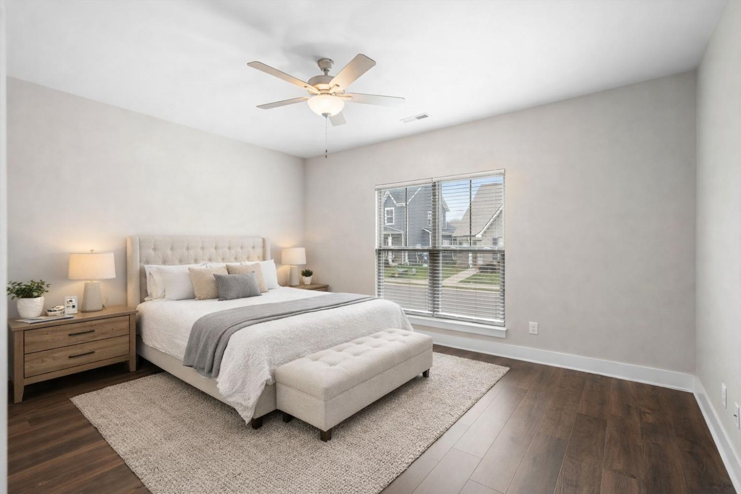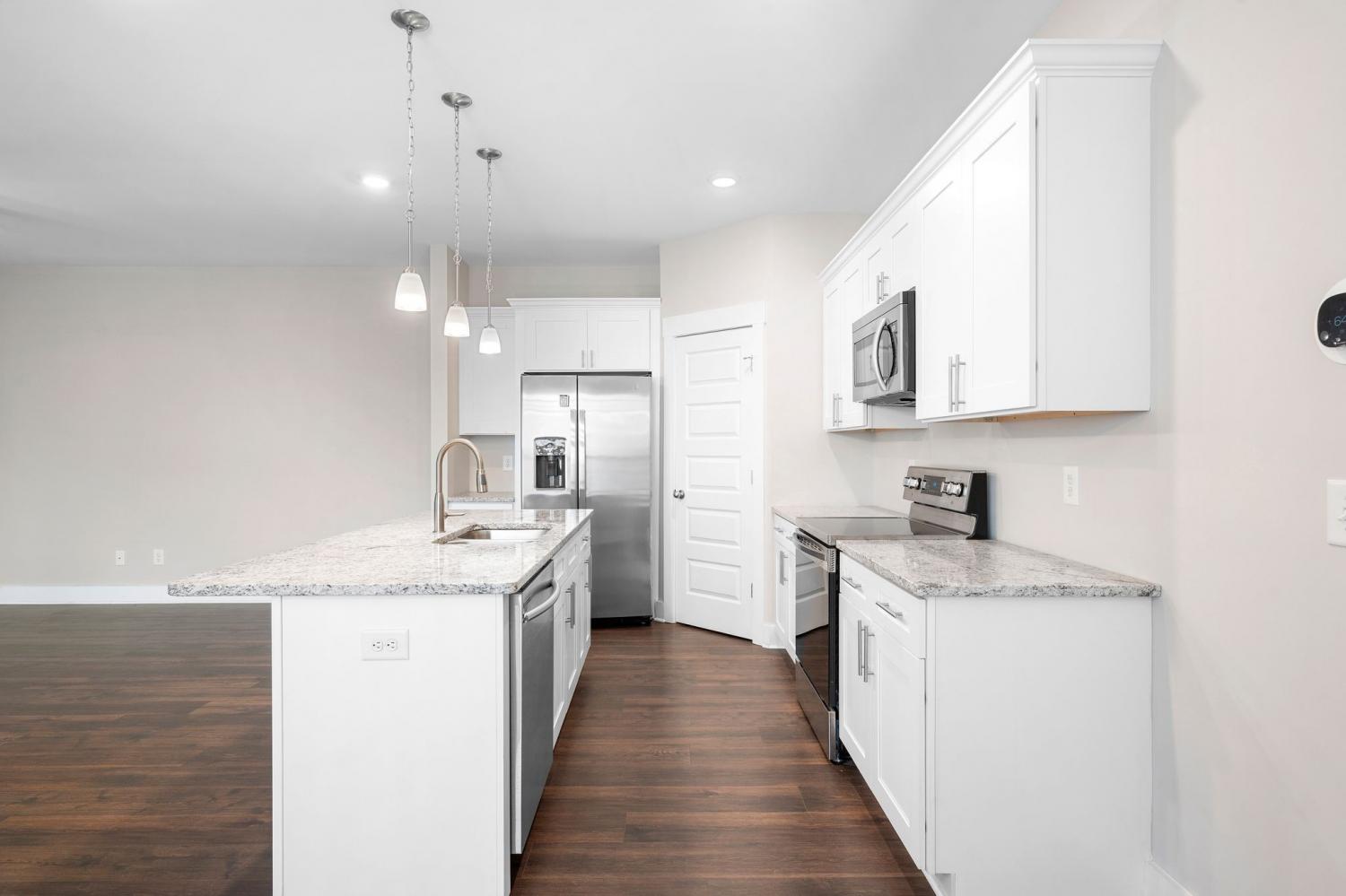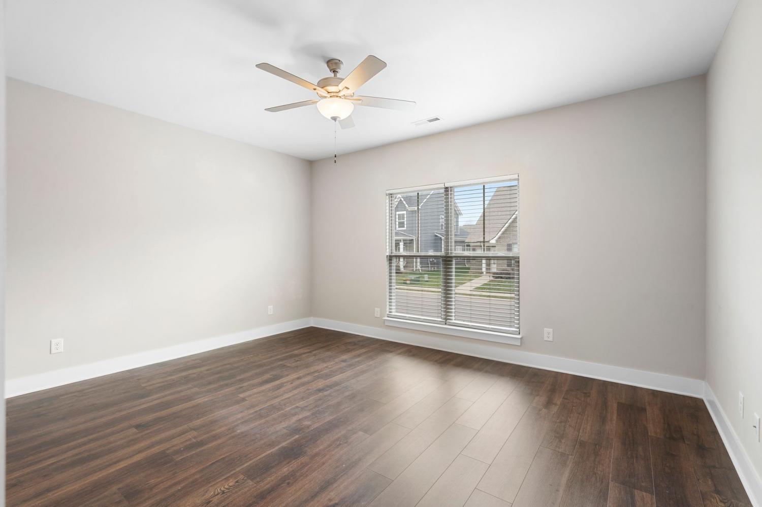 Beautiful newer construction end-unit duplex located on a quiet street in a prime Murfreesboro location. This home offers an open-concept layout with durable laminate flooring throughout and stunning white cabinetry that brightens the entire space. The kitchen features granite countertops, a spacious pantry, and includes the refrigerator. It flows seamlessly into the main living area, creating an ideal space for entertaining or everyday living. Both bedrooms are located on the main level, along with two full bathrooms and a convenient powder bath for guests. The primary suite includes a tiled shower and generous closet space. The washer and dryer are also included and are near new models. Enjoy a covered porch perfect for relaxing, along with a two-car garage providing ample storage and parking. All landscaping and lawn care are maintained by the HOA, offering low-maintenance living. Just minutes from The Avenue and Medical Center Parkway shopping, dining, and everyday conveniences. Ideal for first-time home buyers or those looking to downsize, this home offers true one-level living with an expandable upstairs area already in place and ready to be built out for additional space if desired. Move-in ready with room to grow in one of Murfreesboro’s most convenient locations.