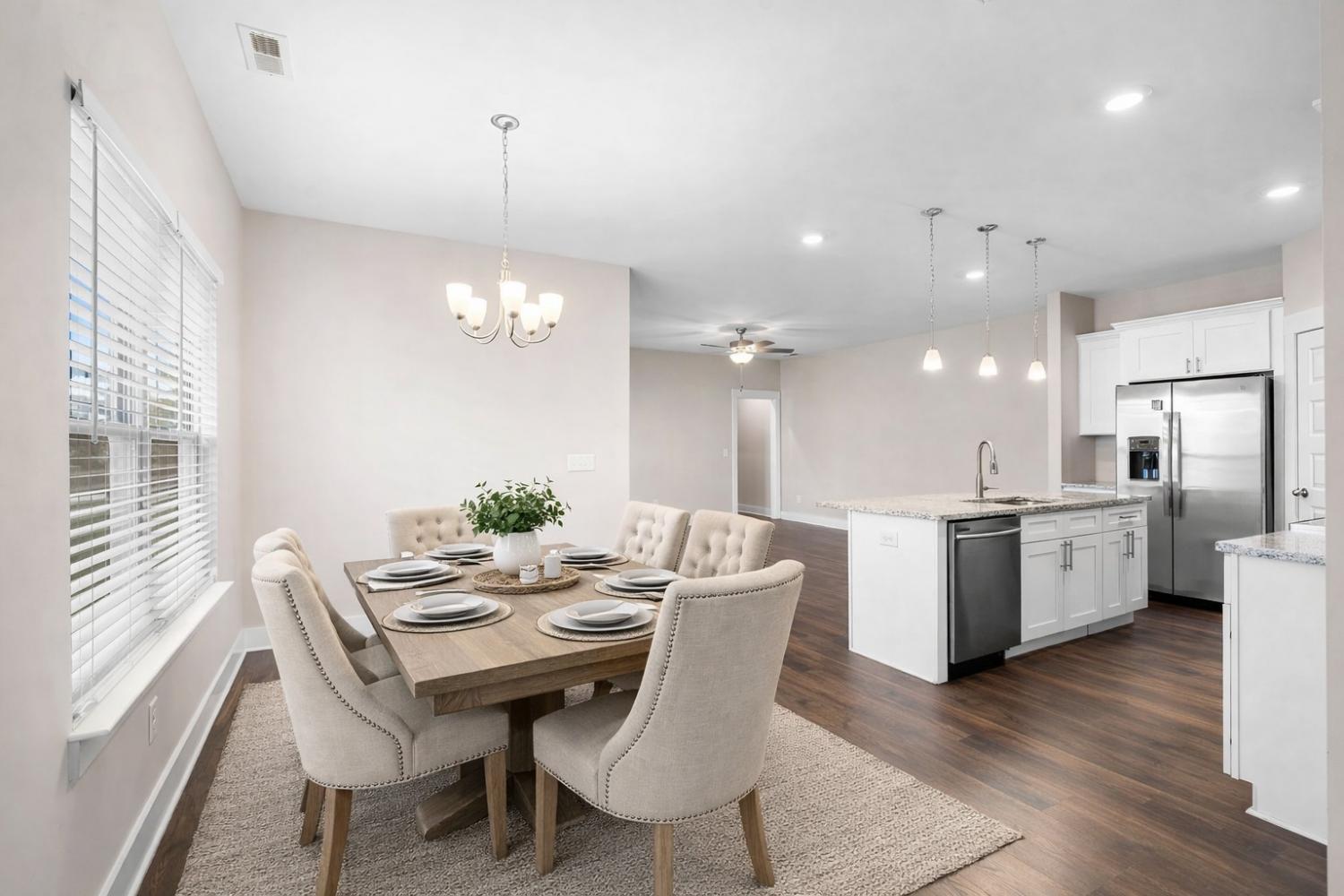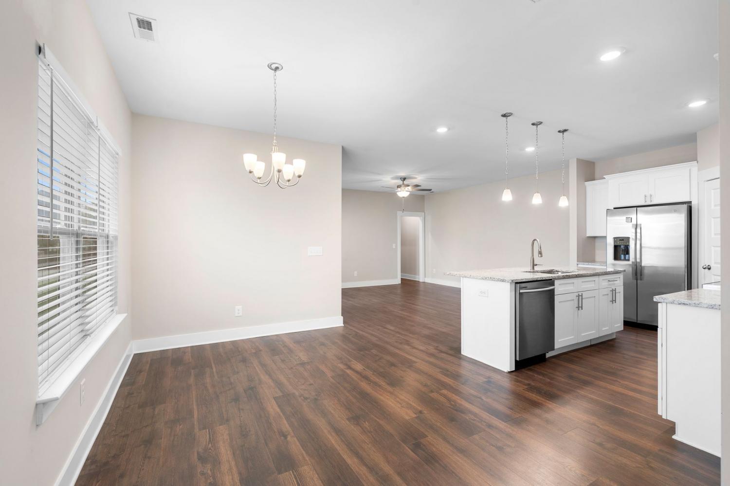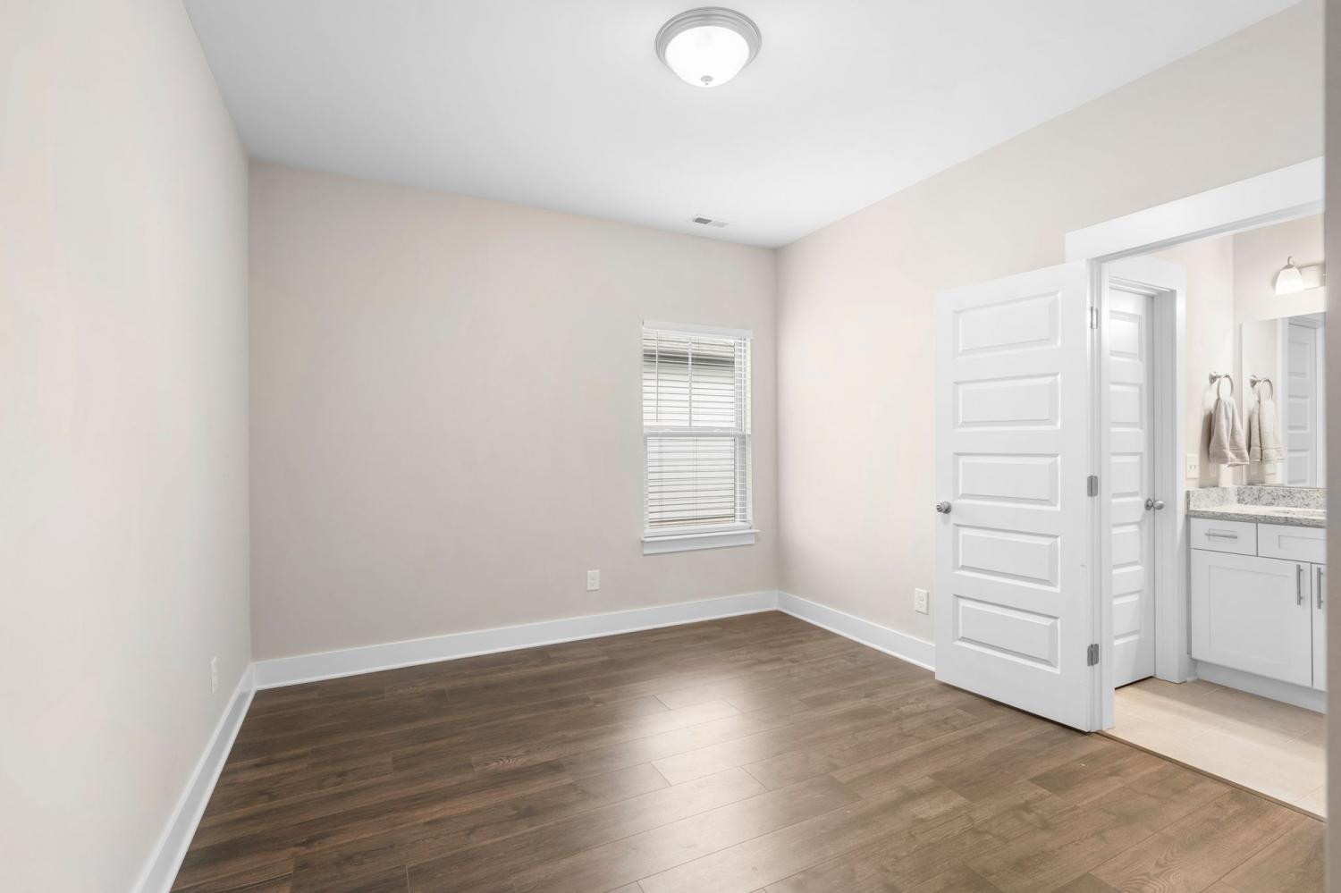 Beautiful newer construction end-unit duplex located on a quiet street in a prime Murfreesboro location. This home offers an open-concept layout with durable laminate flooring throughout and stunning white cabinetry that brightens the entire space. The kitchen features granite countertops, a spacious pantry, and includes the refrigerator. It flows seamlessly into the main living area, creating an ideal space for entertaining or everyday living. Both bedrooms are located on the main level, along with two full bathrooms and a convenient powder bath for guests. The primary suite includes a tiled shower and generous closet space. The washer and dryer are also included and are near new models. Enjoy a covered porch perfect for relaxing, along with a two-car garage providing ample storage and parking. All landscaping and lawn care are maintained by the HOA, offering low-maintenance living. Just minutes from The Avenue and Medical Center Parkway shopping, dining, and everyday conveniences. Ideal for first-time home buyers or those looking to downsize, this home offers true one-level living with an expandable upstairs area already in place and ready to be built out for additional space if desired. Move-in ready with room to grow in one of Murfreesboro’s most convenient locations.