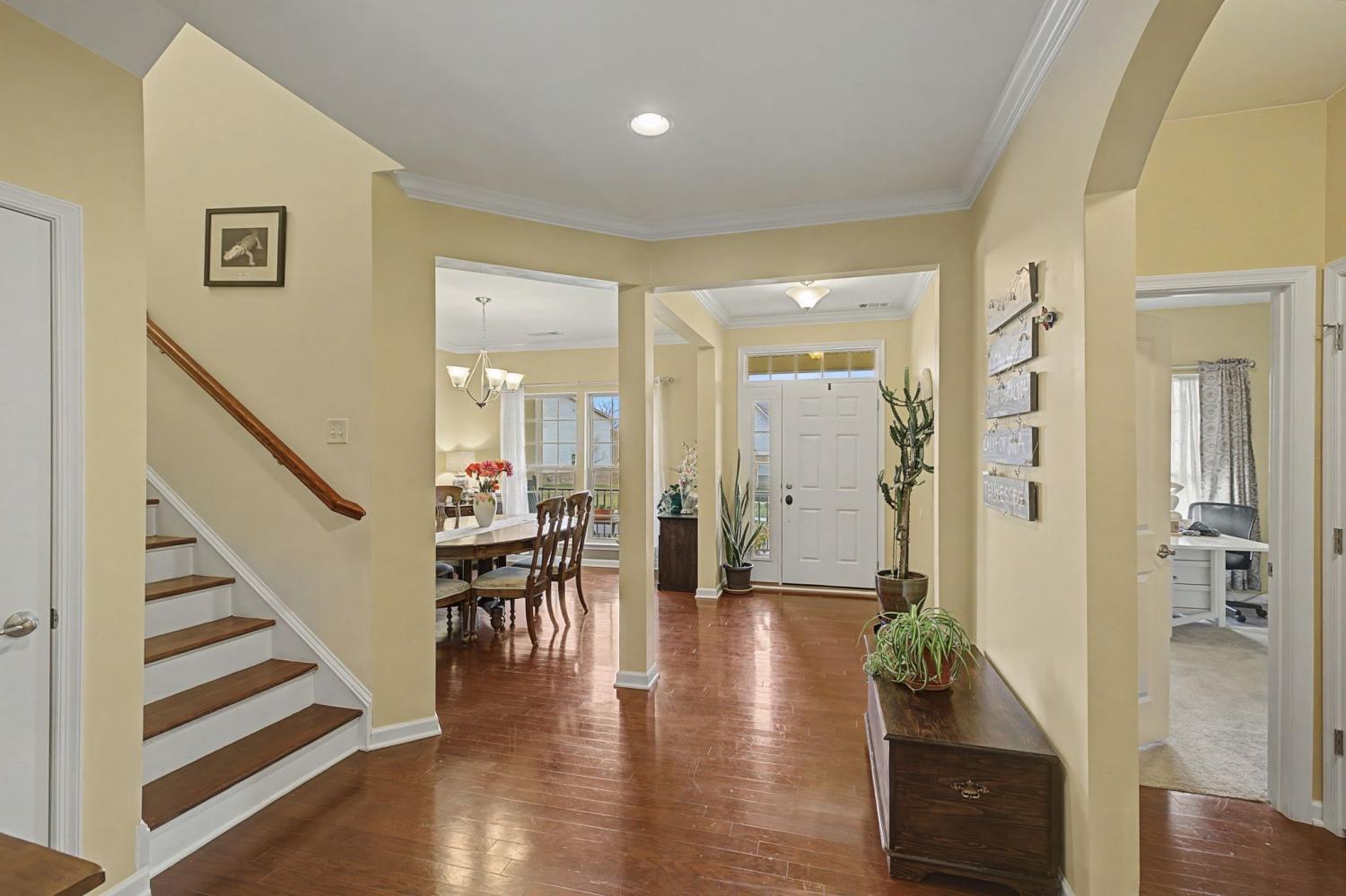 Welcome to Falls Grove, nestled in the rolling hills above College Grove, just fifteen minutes south of Franklin, with easy access to I-840/65. This spacious, well-maintained home has 2,736 square feet of well-designed, open-plan living space, featuring four bedrooms, three full baths, and a spacious office that could also be developed into a self-contained second-floor living area. The home is designed with comfort and serenity in mind. The private, sunny, fenced-in backyard adjoins mature woodland and is a beautiful, nature-filled garden with trees, shrubs, and flower beds on a gently undulating, south-facing slope. Enjoy sunrise over the trees in the backyard, or sunset from the front porch. The Falls Grove community suits people of all ages, and offers walking paths, well-maintained green space, a modern clubhouse and fully equipped gym, a resort-style pool, putting green, and tennis and basketball courts.