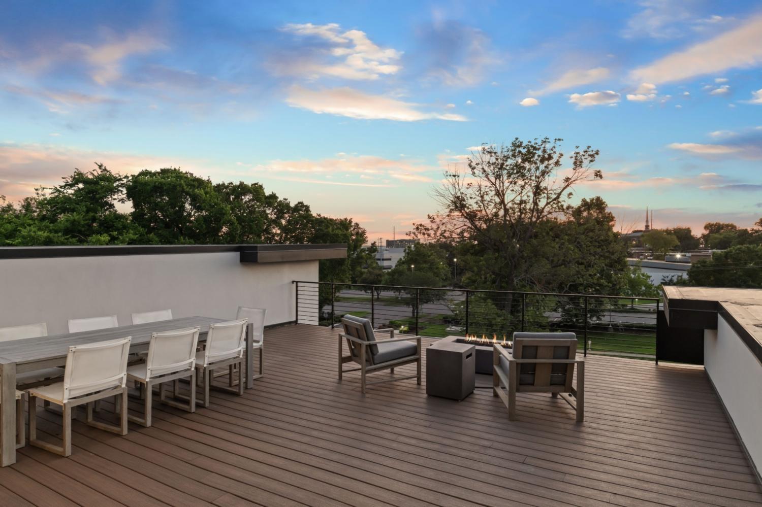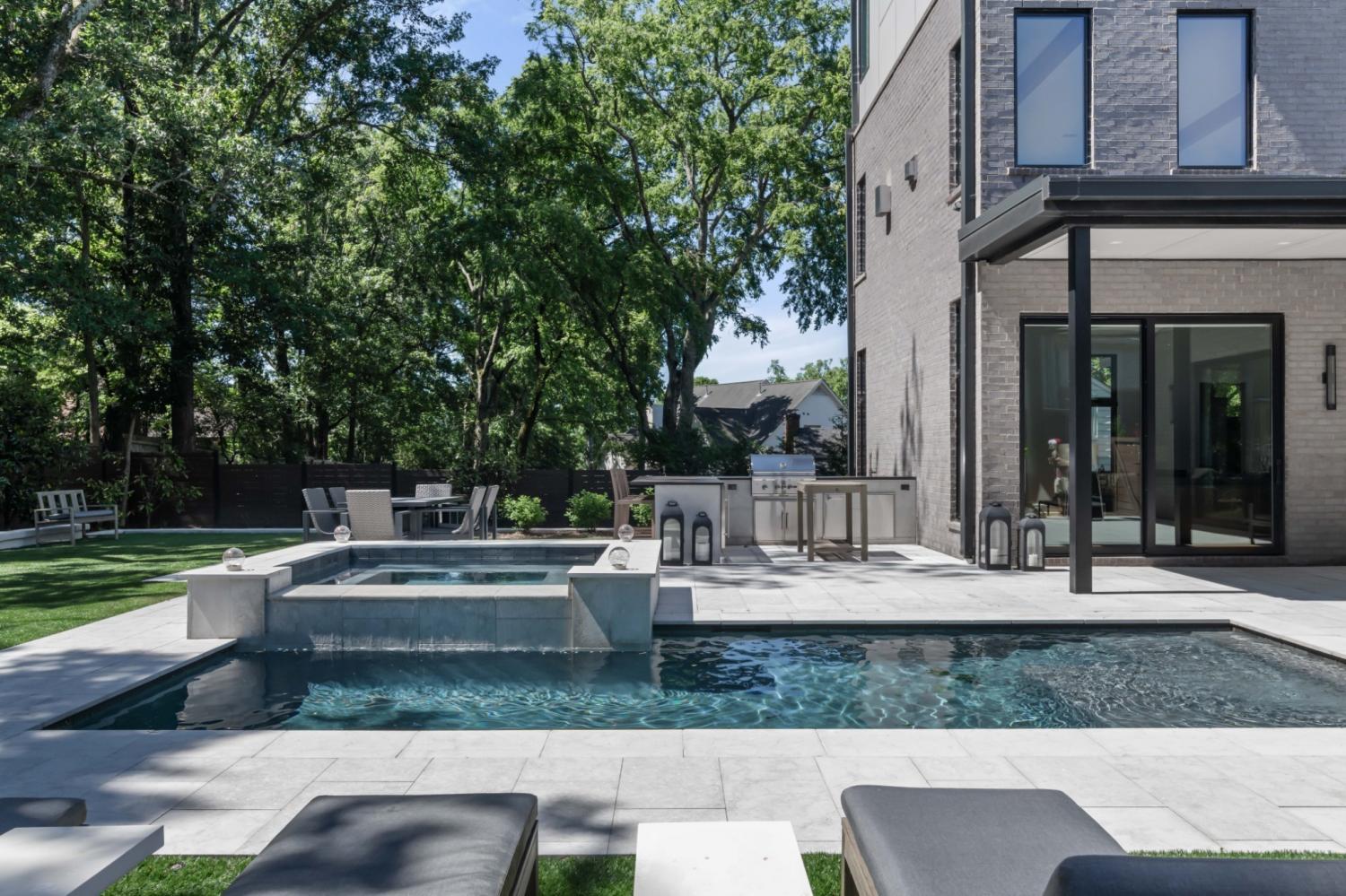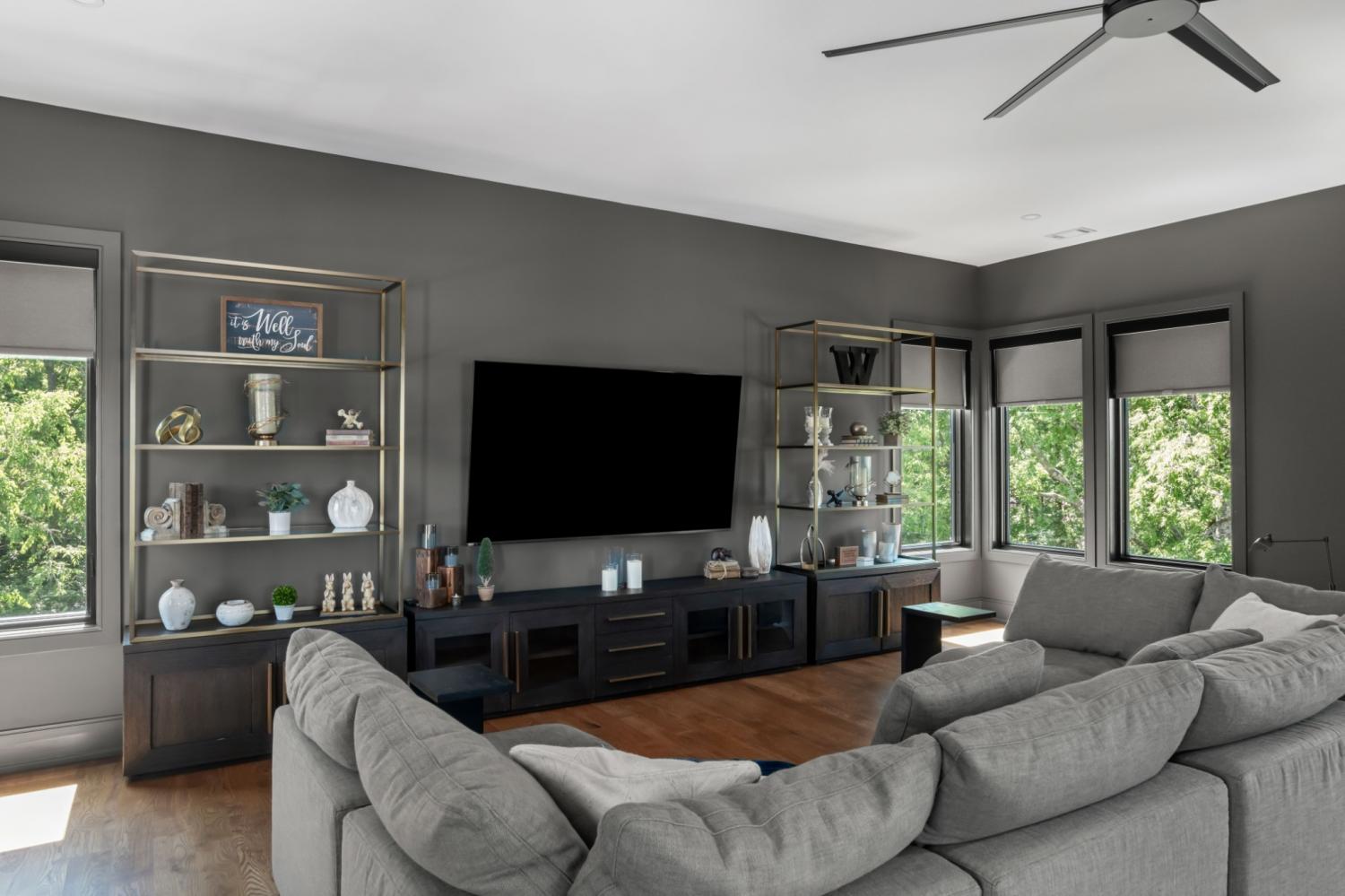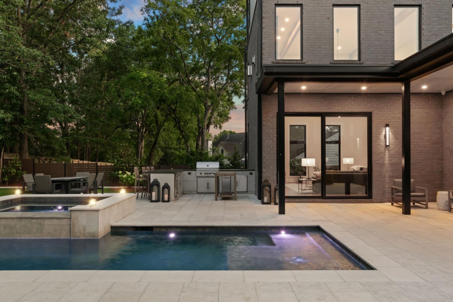 This show-stopping warm modern home in walkable Green Hills features elevated, contemporary design and dynamic indoor-outdoor living with a pool, outdoor kitchen, and private rooftop terrace overlooking the rolling hills of south Nashville. The impressive foyer is wrapped in wood planking, with vaulted ceilings and tons of natural light. The primary suite features direct access to the pool, and there is an additional guest suite or office on the main floor, with a junior suite on the second level. The kitchen and working pantry are the heart of the home, and bars with built-in wine and beverage center refrigerators are adjacent to the kitchen/dining rooms and the top floor media den/bonus room. An elevator serves all 3 levels, and at the top leads to a huge bonus room/media den and wet bar opening to an expansive roof deck. The whole third floor offers incredible, multi-directional views over the rolling hills and beautiful homes of Green Hills. And perfect for Tennessee summers, the fenced, private back yard features impressive mature landscaping and extensive turfing, a heated pool with hot tub, tons of entertaining space with an outdoor kitchen and dining area. Control4 smart home automation, security cameras, and more features top off the fully functional, effortless living afforded by this pitch perfect modern home!