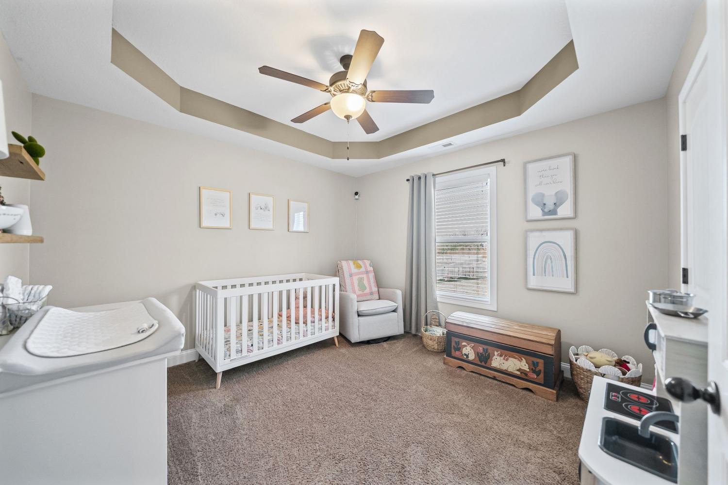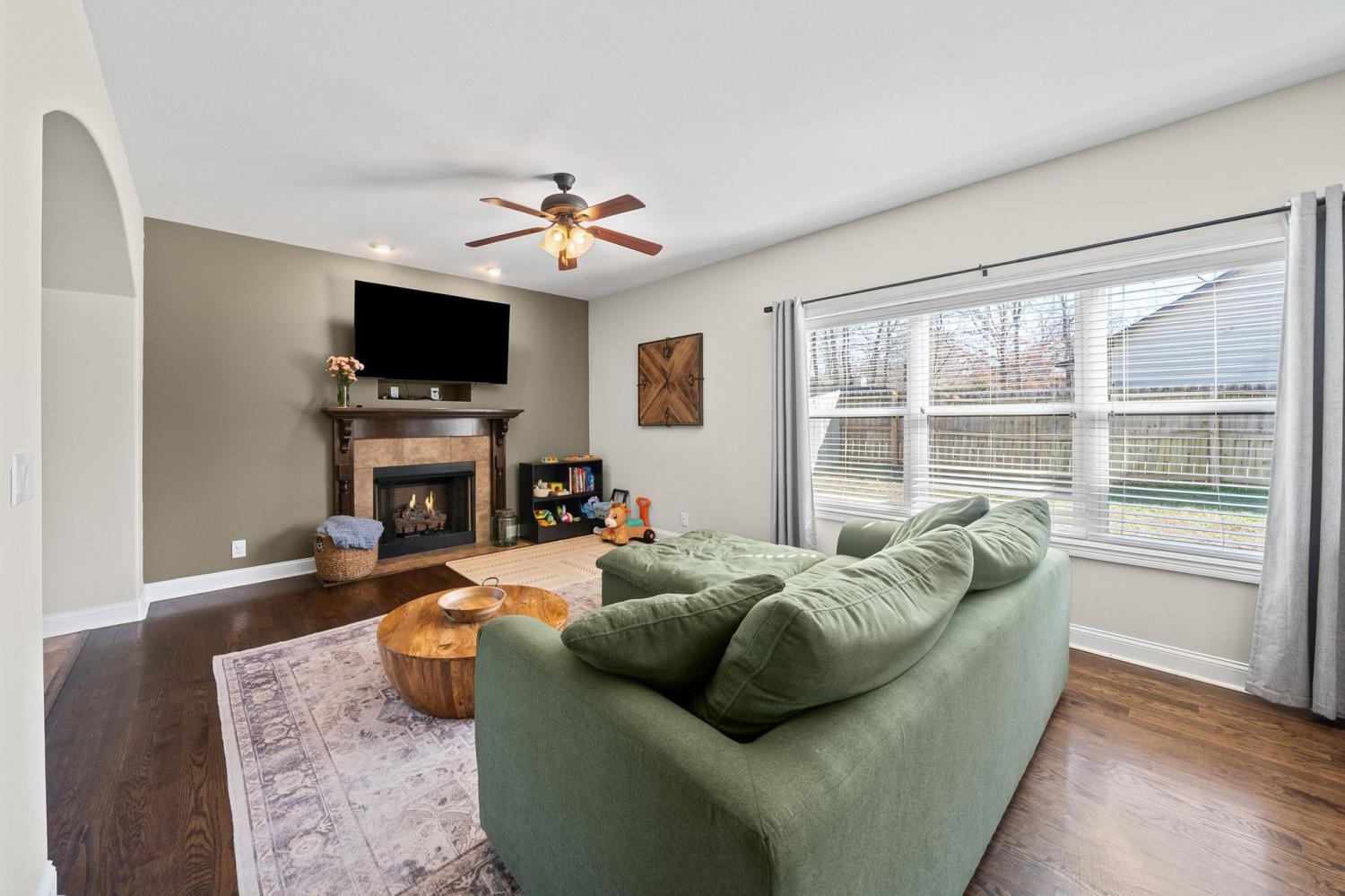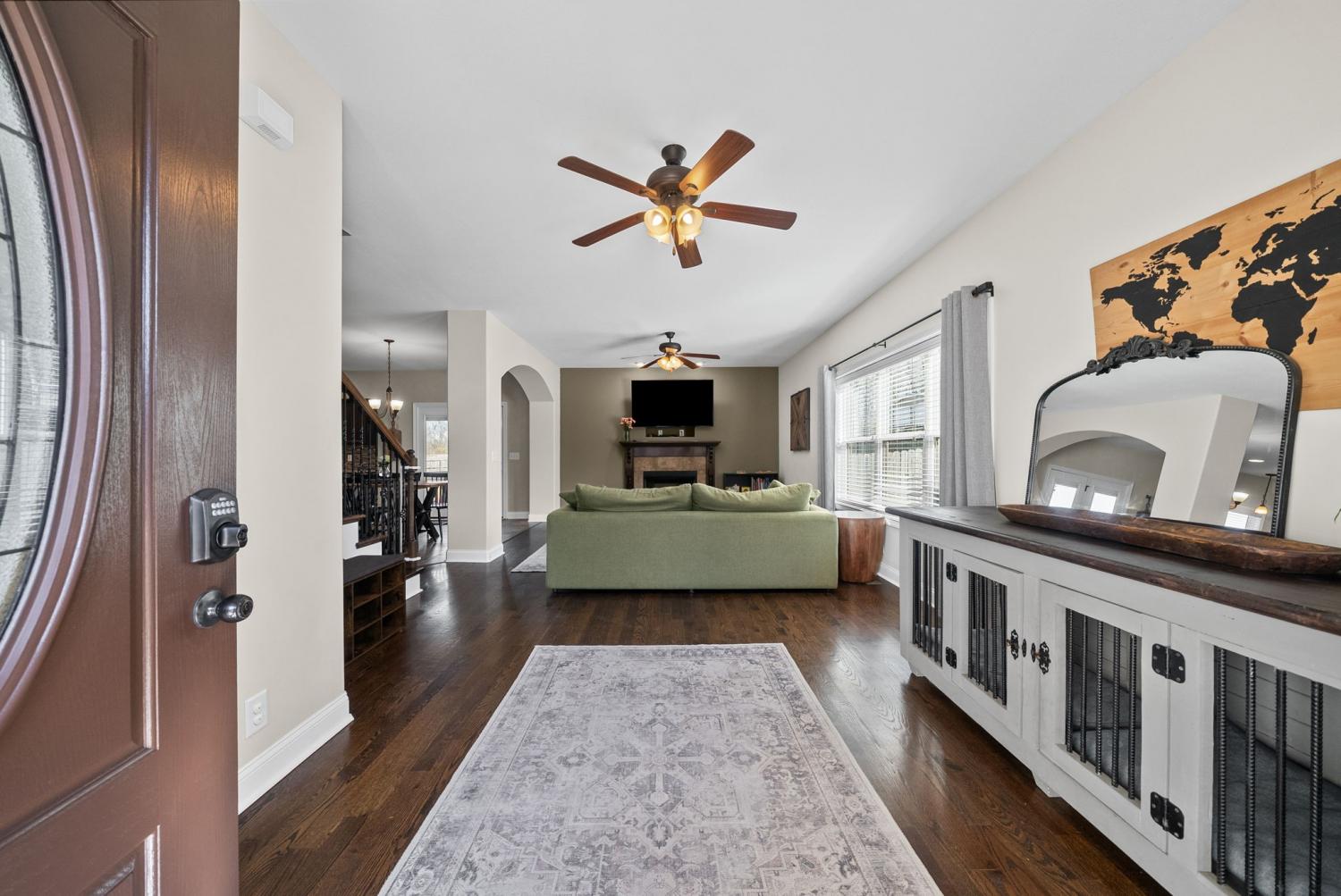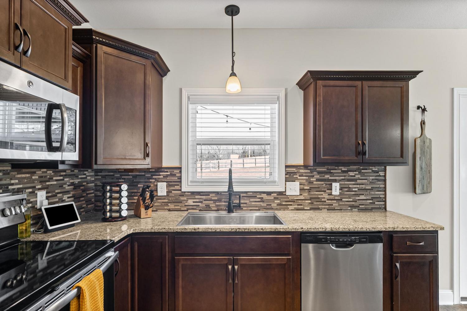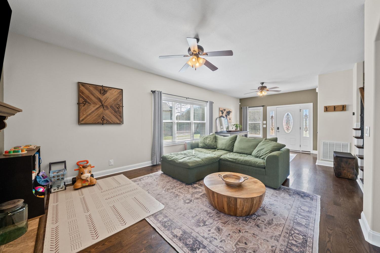 Beautiful home with plenty of space (1.5 acres) and no backyard neighbors! Home is located in a great location that is a short drive to Fort Campbell and Clarksville! Hardwood floors welcome you into the entryway and flow through the main floor. The spacious living room features a decorative fireplace mantel and large windows that bring in lots of natural light. The country kitchen boasts an island, granite countertops, large deep sink, backsplash, an eat-in space, and a pantry. The main level also features an extra-large laundry/utility room and a half bath. Upstairs, the oversized primary bedroom features a double tray ceiling, a walk-in closet and an accent wall. The spa-like primary bathroom has it all! A jetted bathtub, a separate tiled shower and a double vanity. Two large bedrooms, both with decorative tray ceilings, and a full bathroom complete the main wing of the second floor. Across the landing of the stairs is a giant bonus room with two large walk-in closets that provide plenty of storage and a convenient half bathroom. The bonus room could technically be used as a giant fourth bedroom since the septic system is rated for a four-bedroom home. The 22’x20’ garage provides even more storage area with its size, tall ceilings, and built-in shelving. Relax on the large wrap around front porch or out on the covered back porch. Grill and entertain on the giant concrete patio that has a sunshade installed as well as a fire pit area. A large portion of the back yard is fully fenced in for added privacy. The fence features a back gate used to access the remainder of the acreage. Behind the gate and towards the middle of the property you will find a playset for children and a gravel storage area. Driveway extension was installed to help make turning around easy. New HVAC unit for upstairs installed in June (2025).