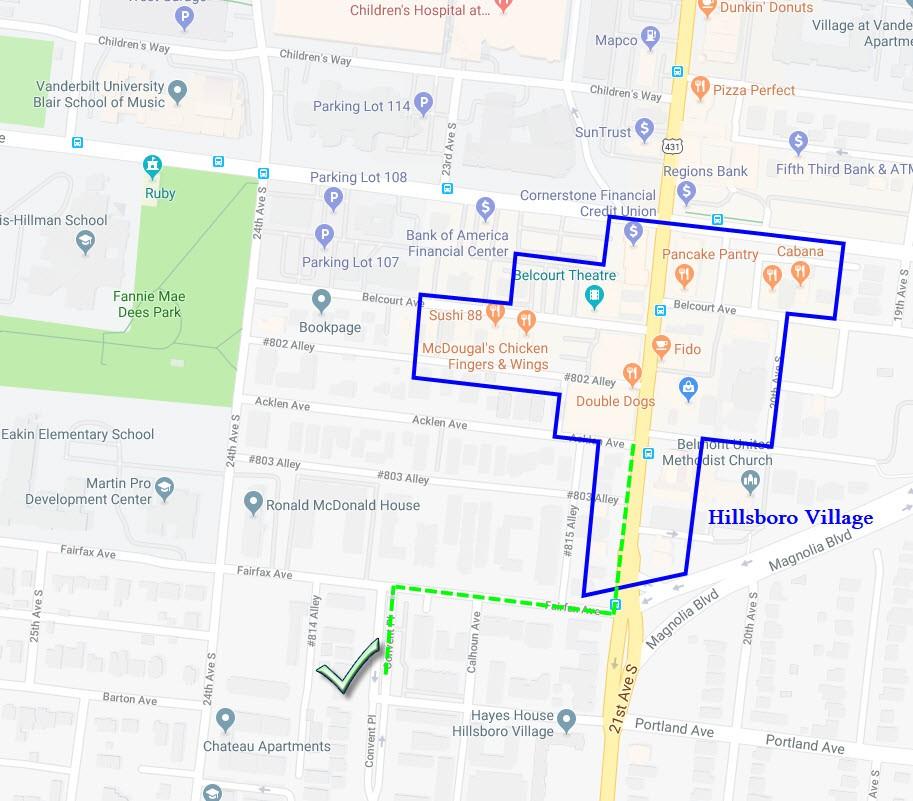 From Vanderbilt Campus: South on 21st Ave through Hillsboro Village to first RIGHT on Fairfax Ave to first LEFT on Convent Place.