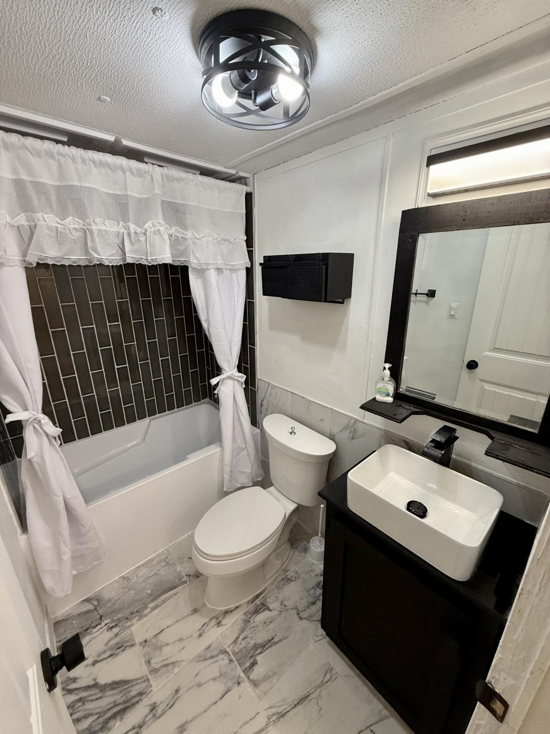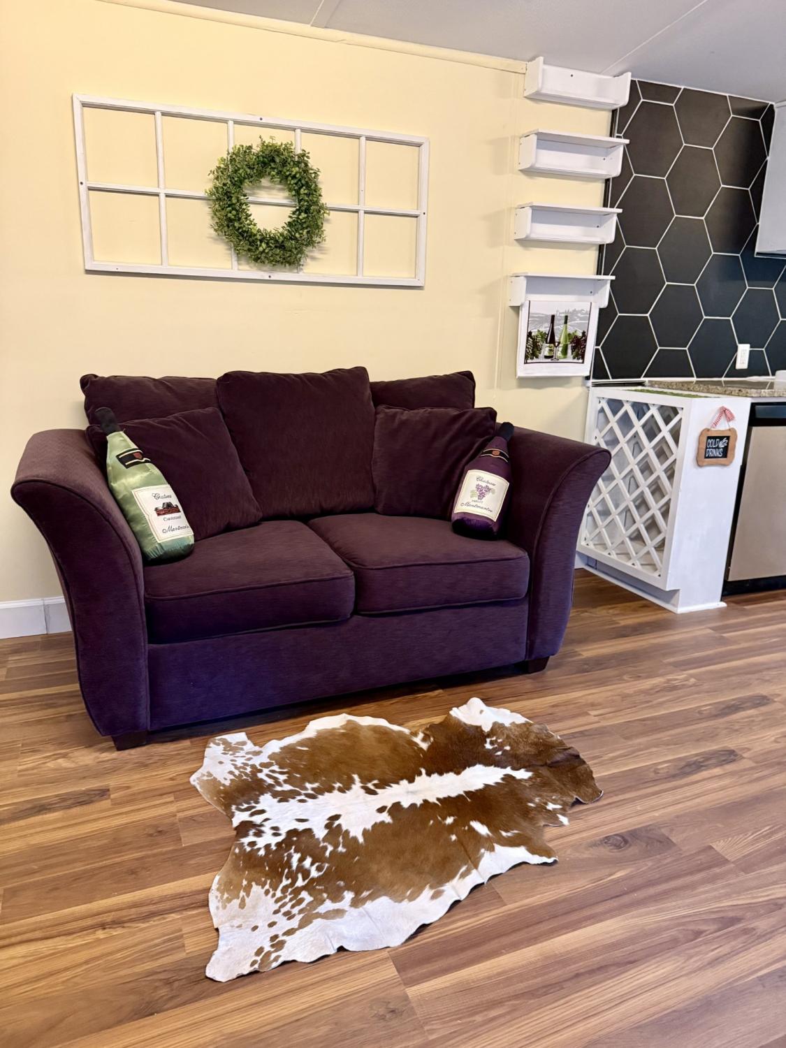 Experience modern, move-in ready living in this fully renovated 700 sq ft home, ideally situated within walking distance of downtown Pulaski and UT Southern. Nearly every part of the interior has been updated, including brand-new flooring, upgraded windows, granite kitchen counters, and a 36-inch fireclay farmhouse sink. The kitchen and dining area feature a custom-built breakfast nook overlooking a large picture window, plus a dedicated coffee bar, built-in wine rack, and wine glass storage. The bathroom has been transformed into a spa-like retreat with a deep soaking tub, tiled shower surround, and matching tile flooring. The primary bedroom includes a stylish accent wall for added character. The open-concept living, dining, and kitchen area sits beneath a vaulted ceiling, creating a bright and spacious feel throughout. Additional improvements include a new oversized front deck, ac only unit with electric fireplace heat feature for the home, and a new water heater. This sale is truly turnkey—everything stays. That includes the trailer, the land, and all appliances, furniture, décor, and household items. Buyers and buyer’s agents should confirm all important details. Home is not on a permanent foundation and is not de-titled, so it will require a cash purchase; however, local creative financing options may be available—please reach out for lender contacts. Ideal as an investment property or a comfortable place to call home.