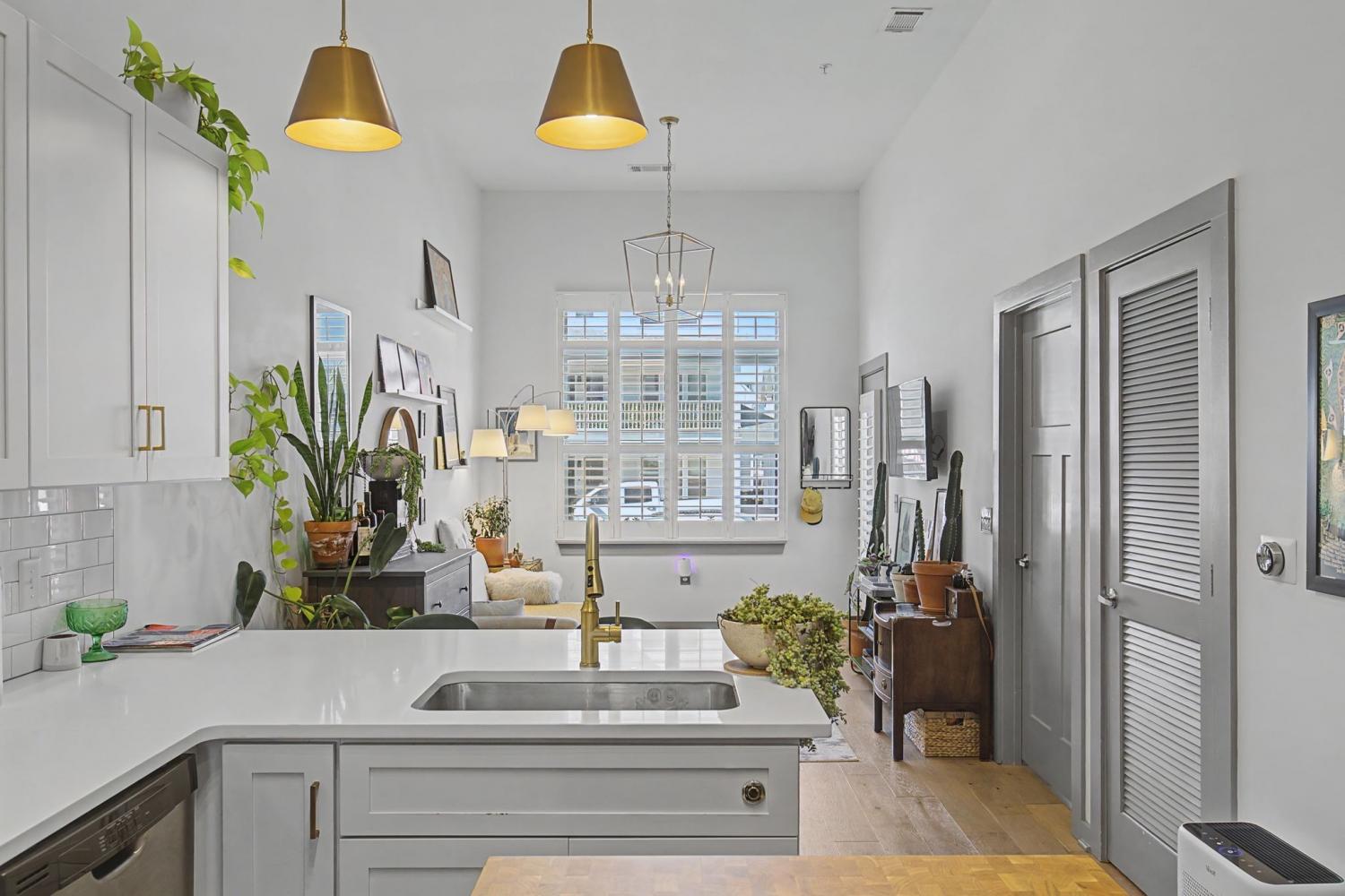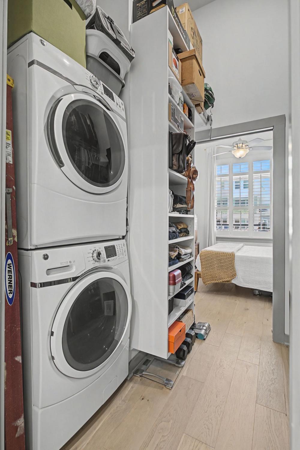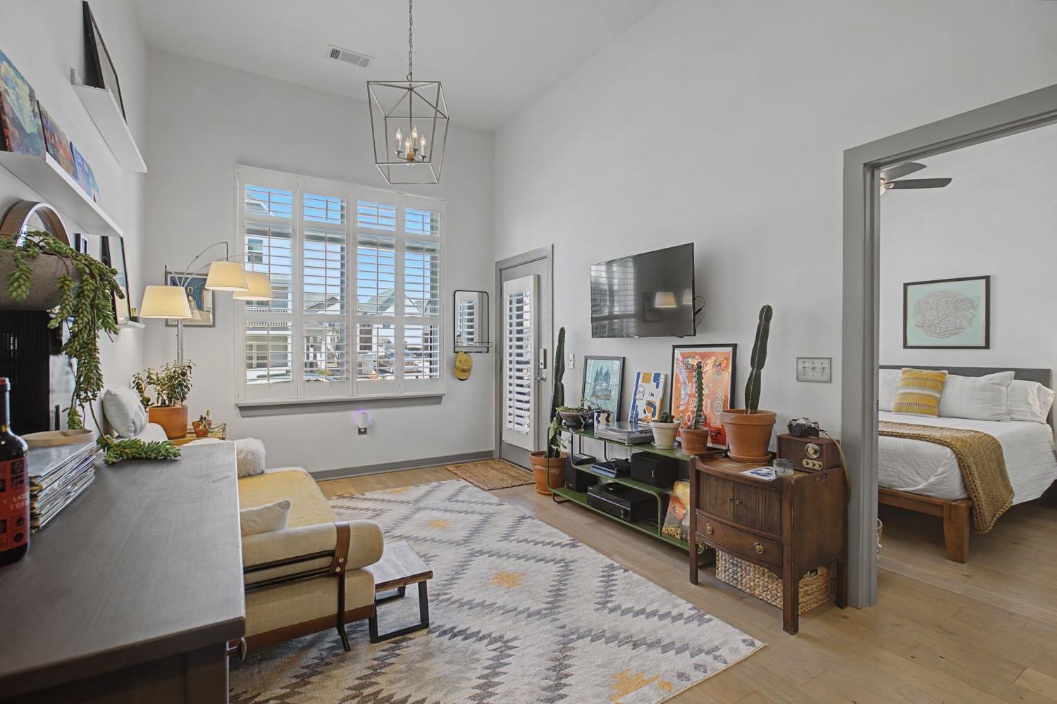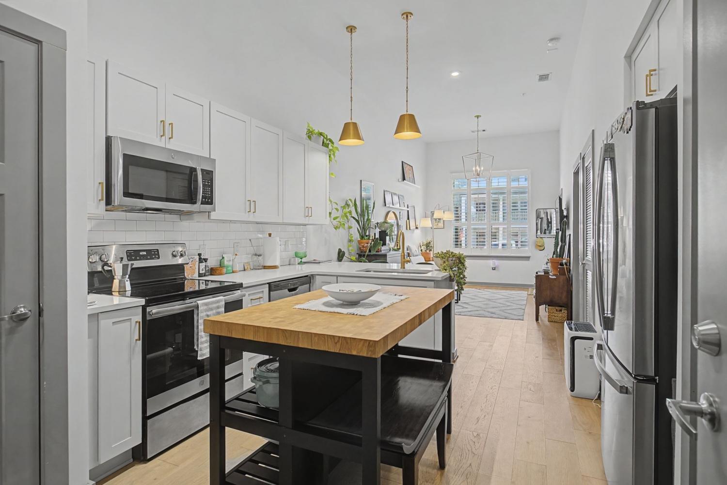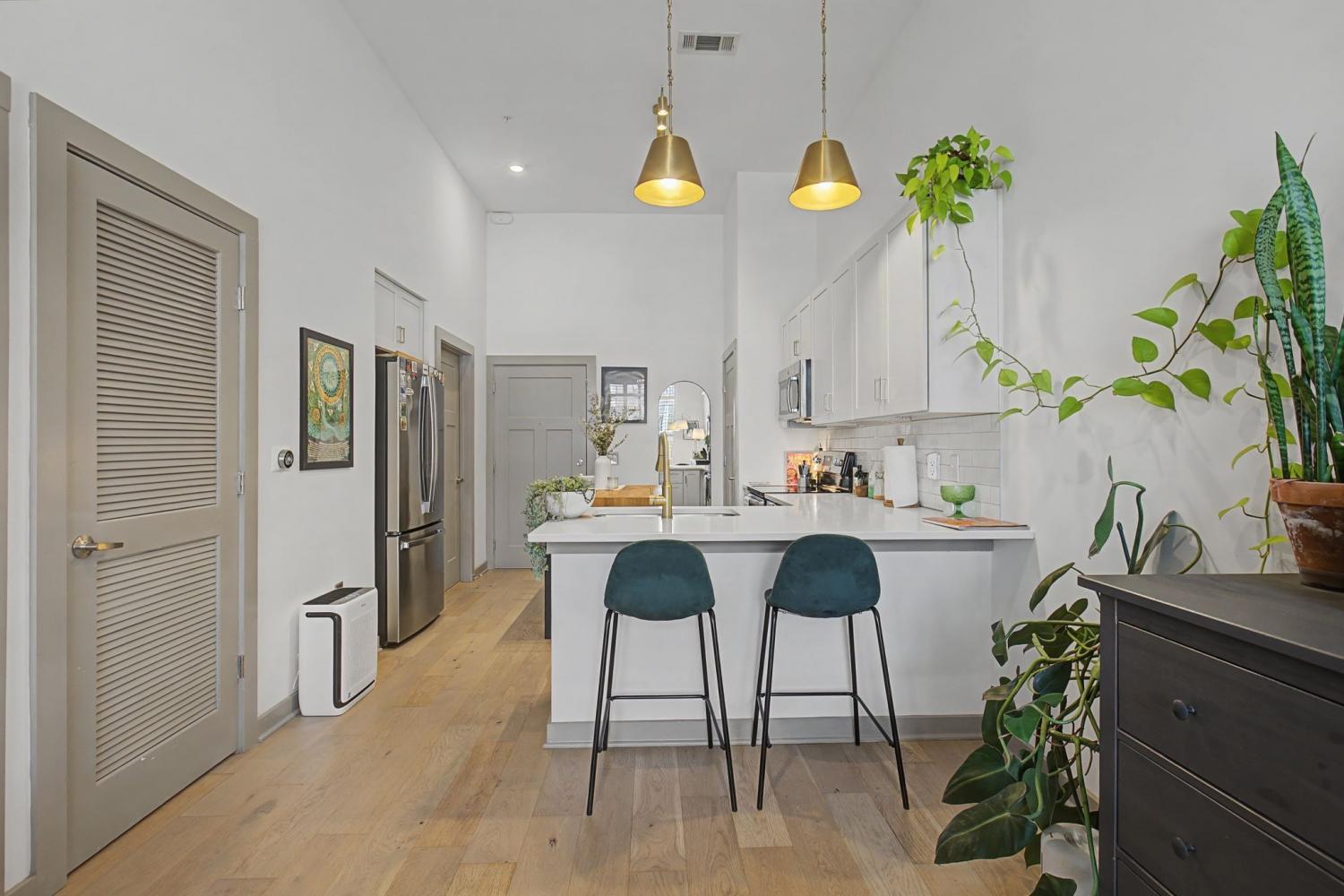 You'll love the upgrades in this trendy, upscale unit with 15 foot ceilings. From the closet, with custom built-ins, and plantation shutters to the new light fixtures and light oak flooring, this home is move-in ready! Because it's on the first floor, you'll have a front door and patio to enjoy. And the pool, grilling area and fitness center are an added bonus. Refrigerator, washer and dryer, and portable kitchen island stay.