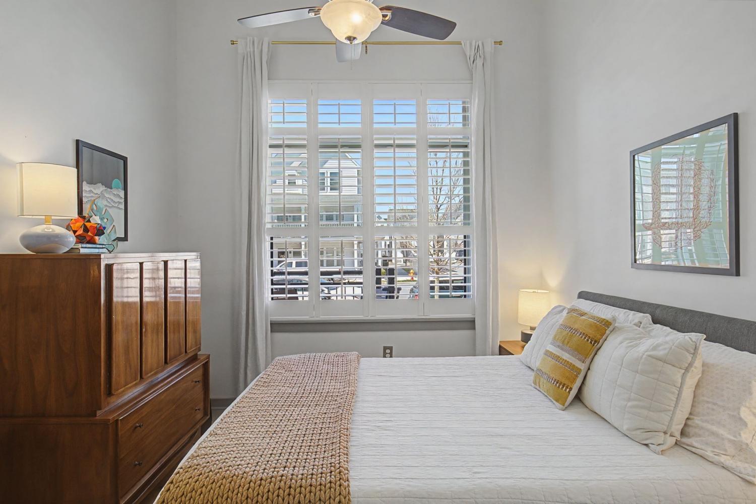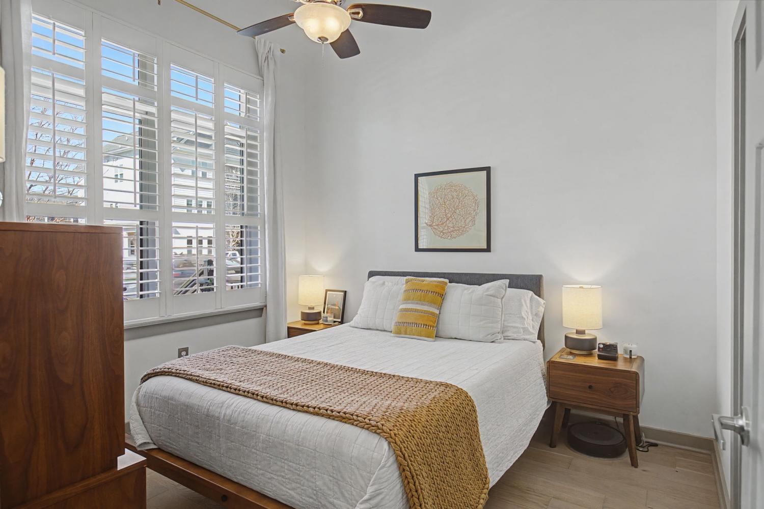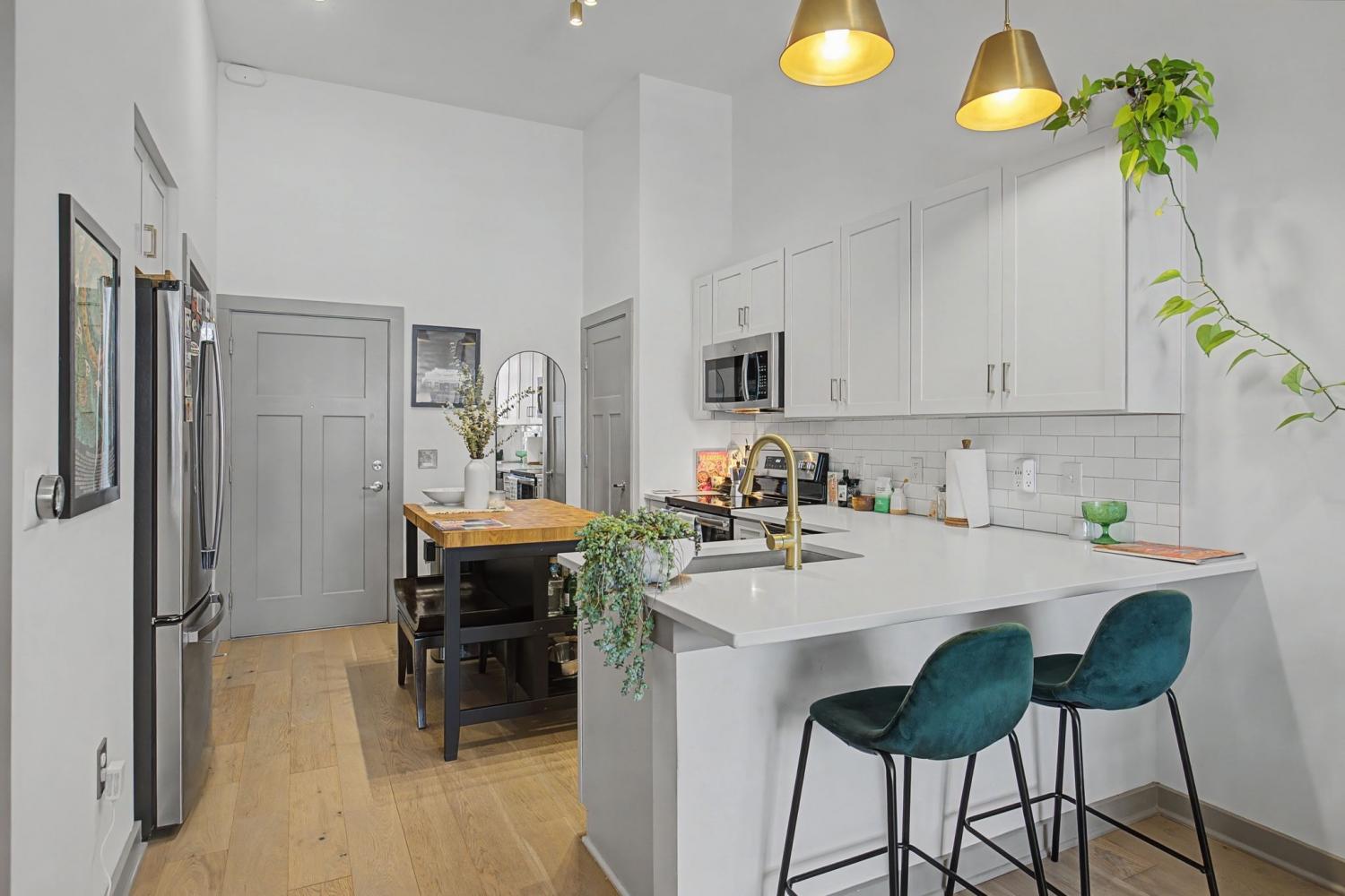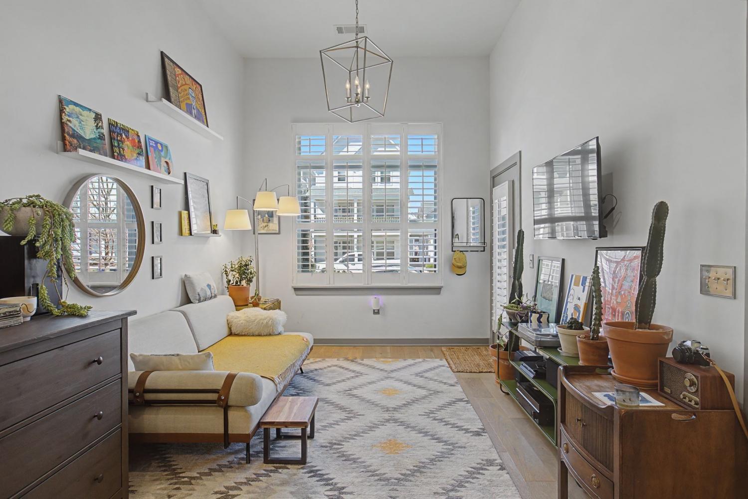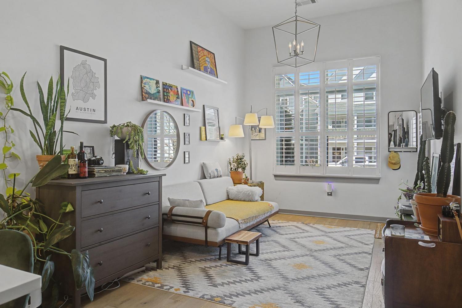 You'll love the upgrades in this trendy, upscale unit with 15 foot ceilings. From the closet, with custom built-ins, and plantation shutters to the new light fixtures and light oak flooring, this home is move-in ready! Because it's on the first floor, you'll have a front door and patio to enjoy. And the pool, grilling area and fitness center are an added bonus. Refrigerator, washer and dryer, and portable kitchen island stay.