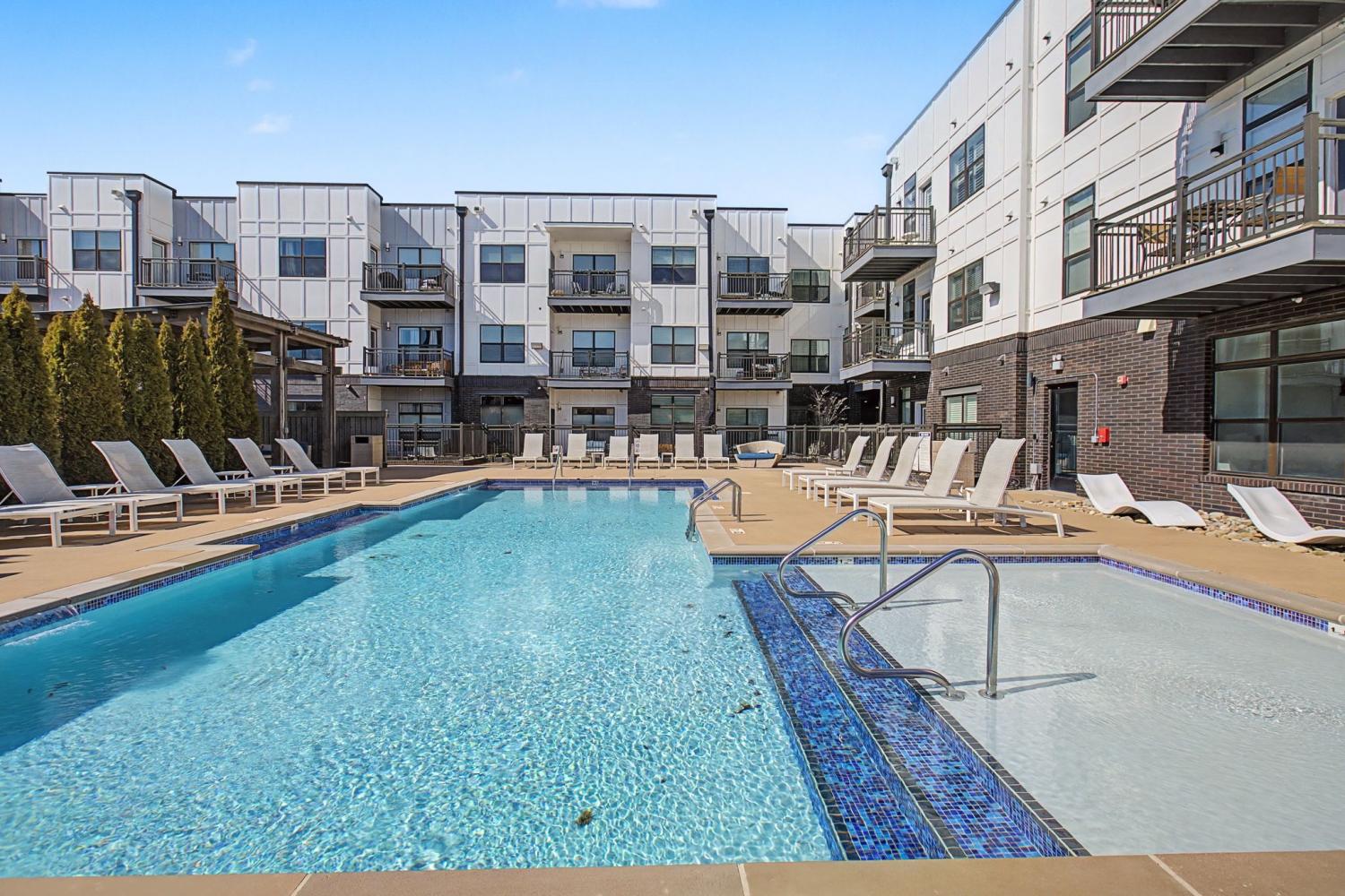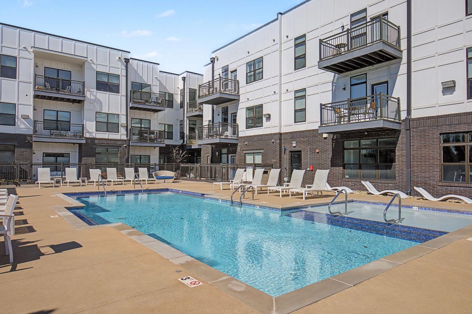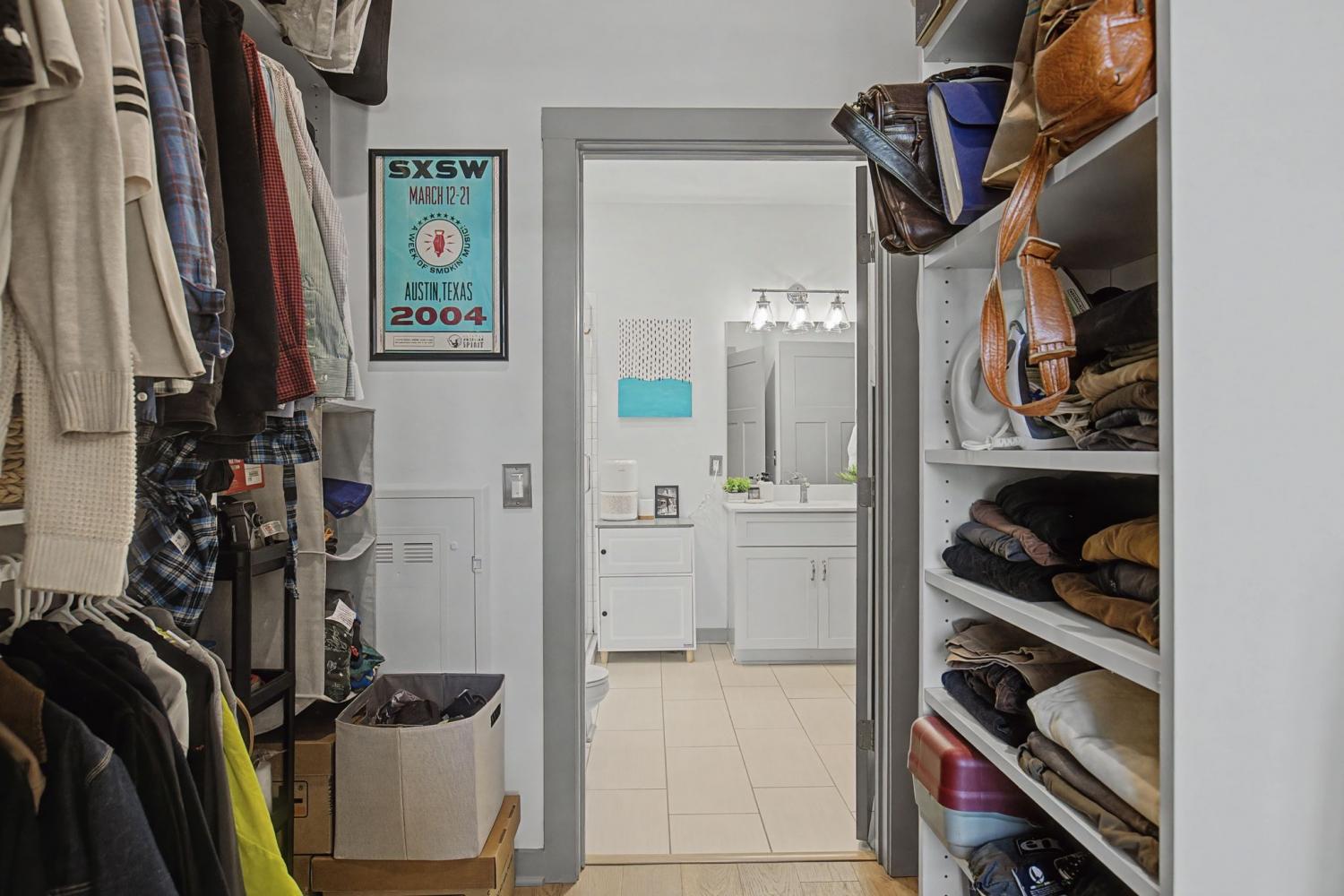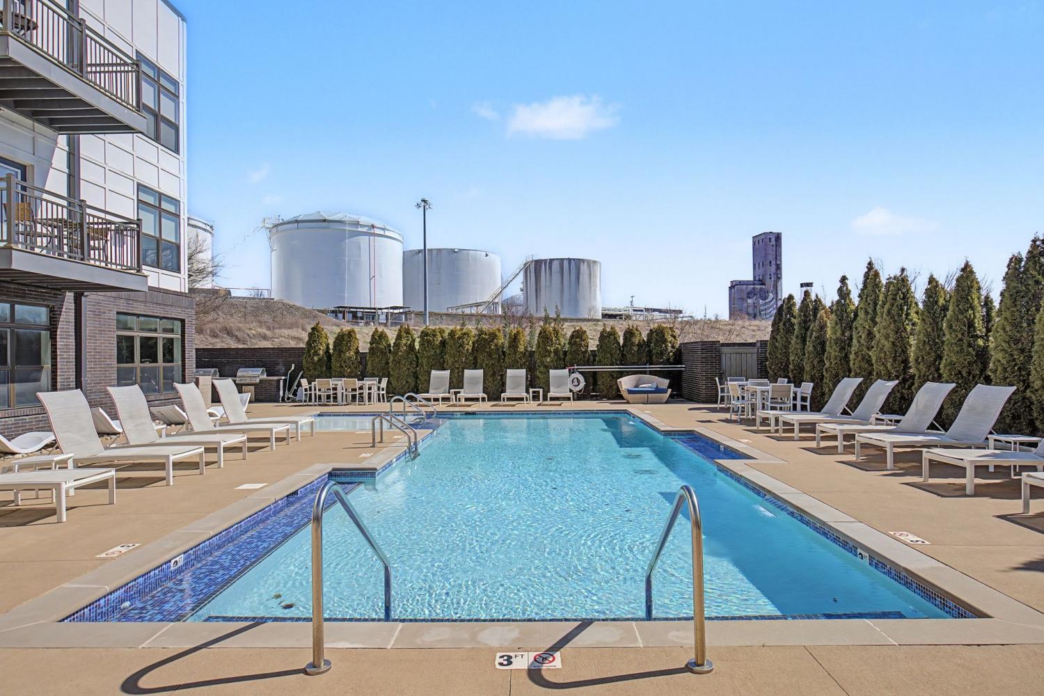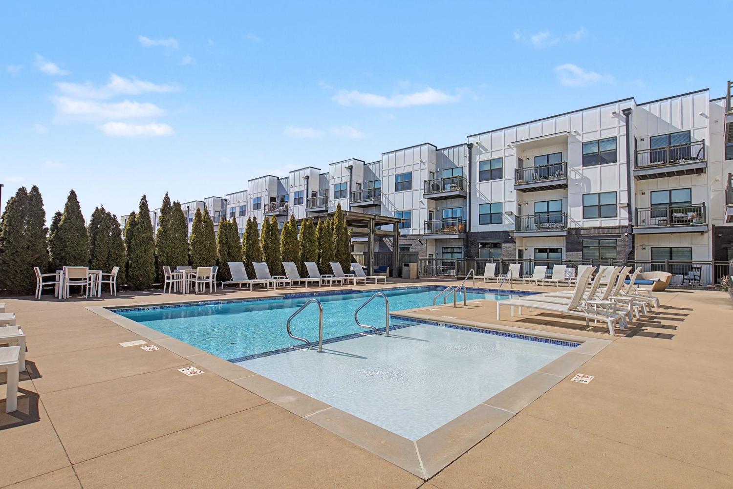 You'll love the upgrades in this trendy, upscale unit with 15 foot ceilings. From the closet, with custom built-ins, and plantation shutters to the new light fixtures and light oak flooring, this home is move-in ready! Because it's on the first floor, you'll have a front door and patio to enjoy. And the pool, grilling area and fitness center are an added bonus. Refrigerator, washer and dryer, and portable kitchen island stay.