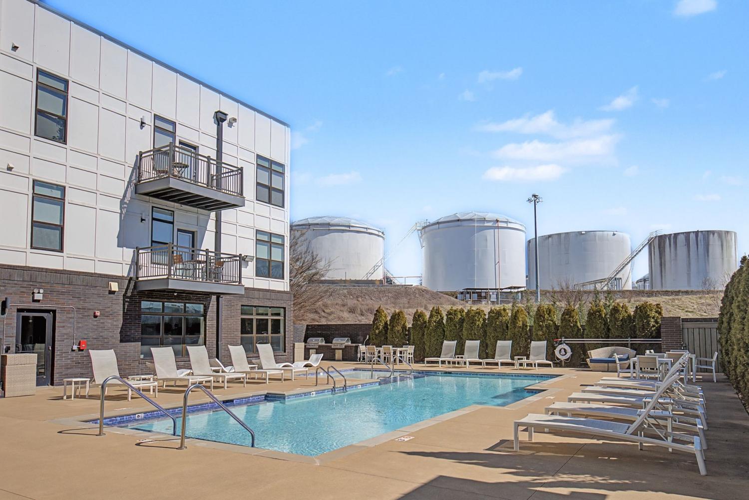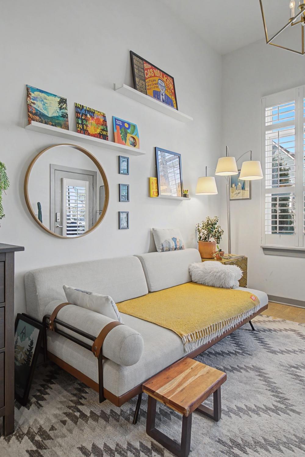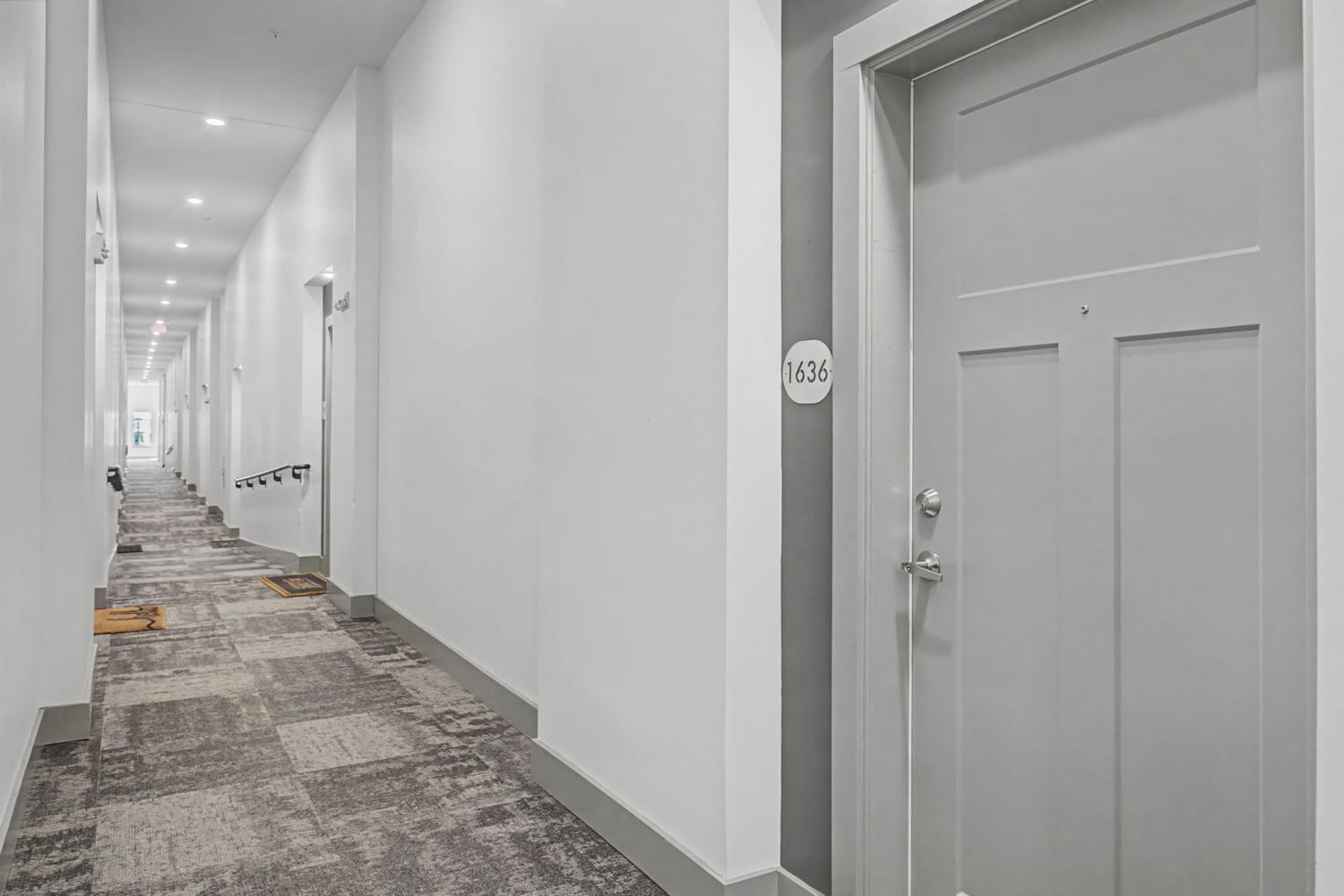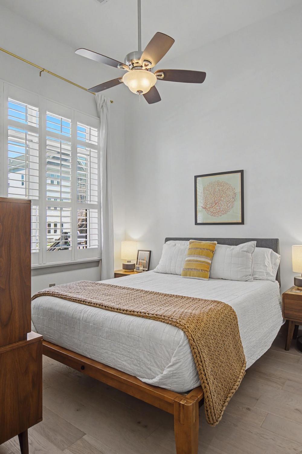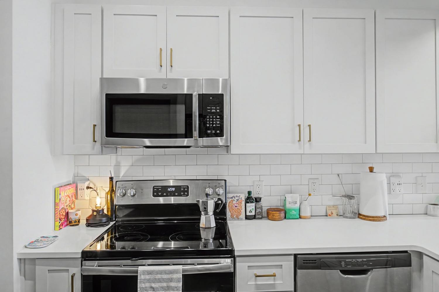 You'll love the upgrades in this trendy, upscale unit with 15 foot ceilings. From the closet, with custom built-ins, and plantation shutters to the new light fixtures and light oak flooring, this home is move-in ready! Because it's on the first floor, you'll have a front door and patio to enjoy. And the pool, grilling area and fitness center are an added bonus. Refrigerator, washer and dryer, and portable kitchen island stay.