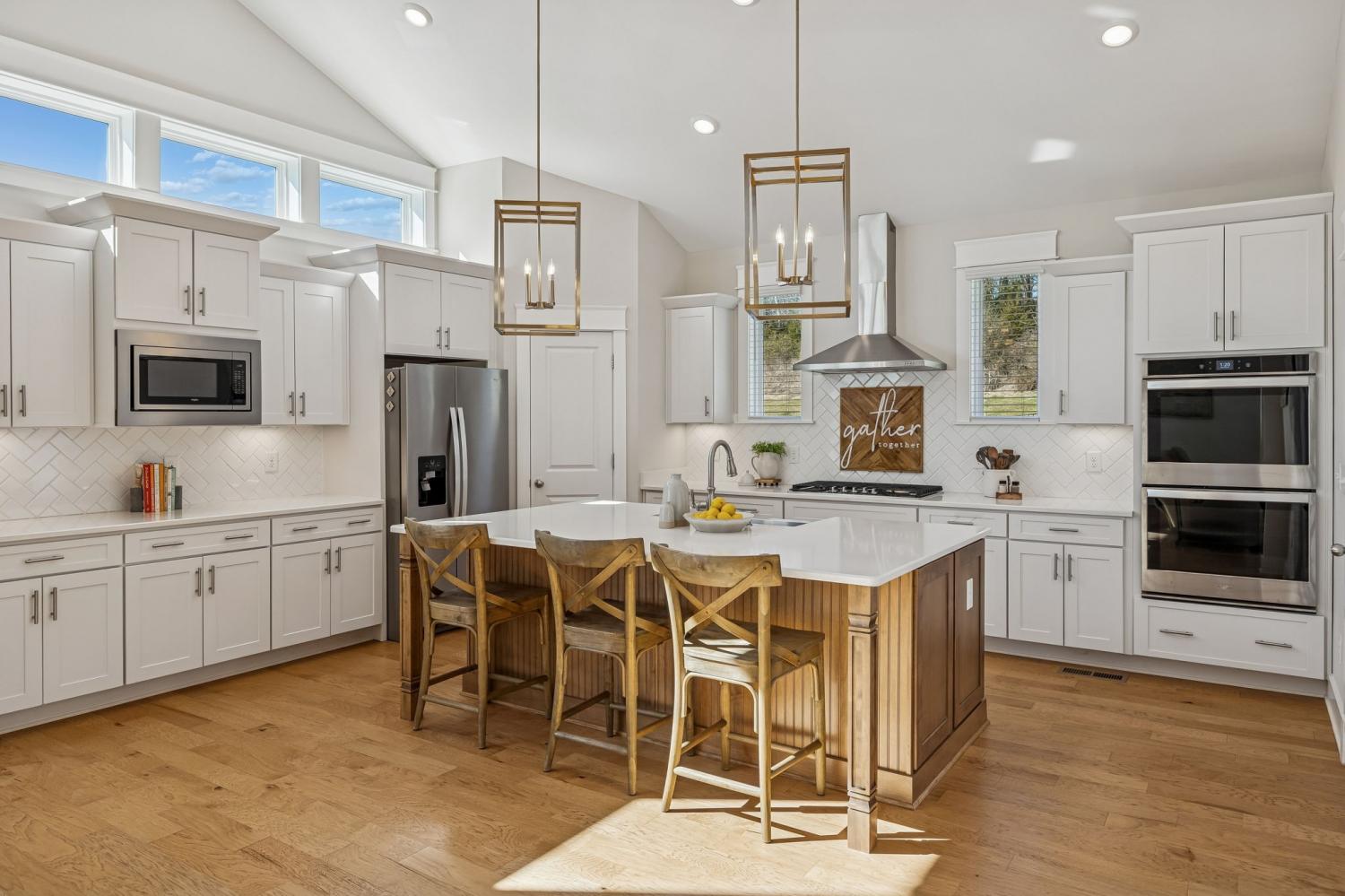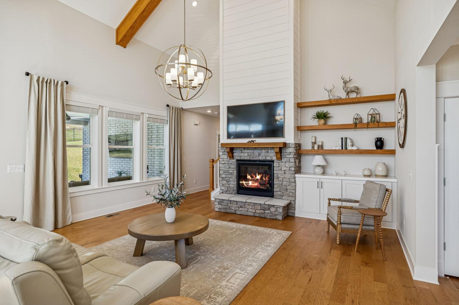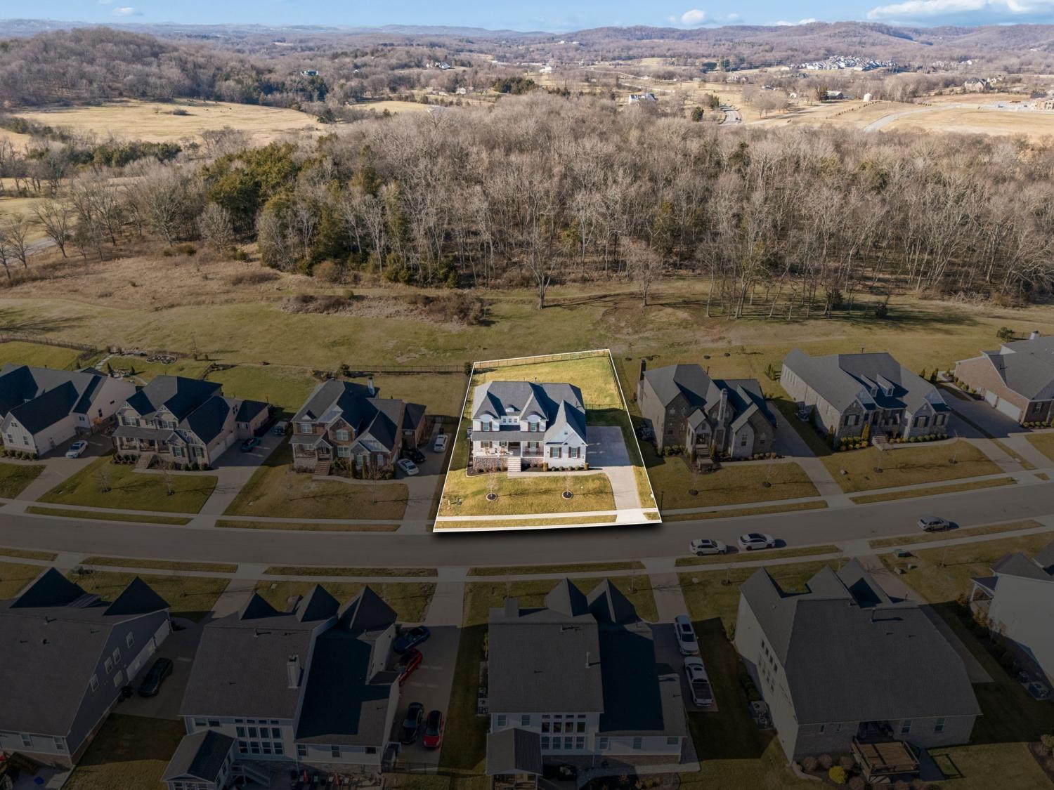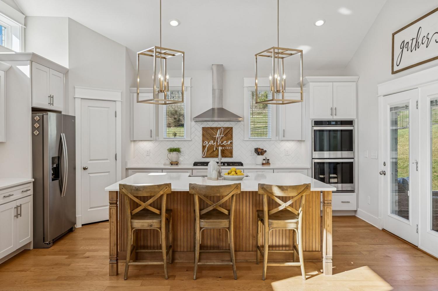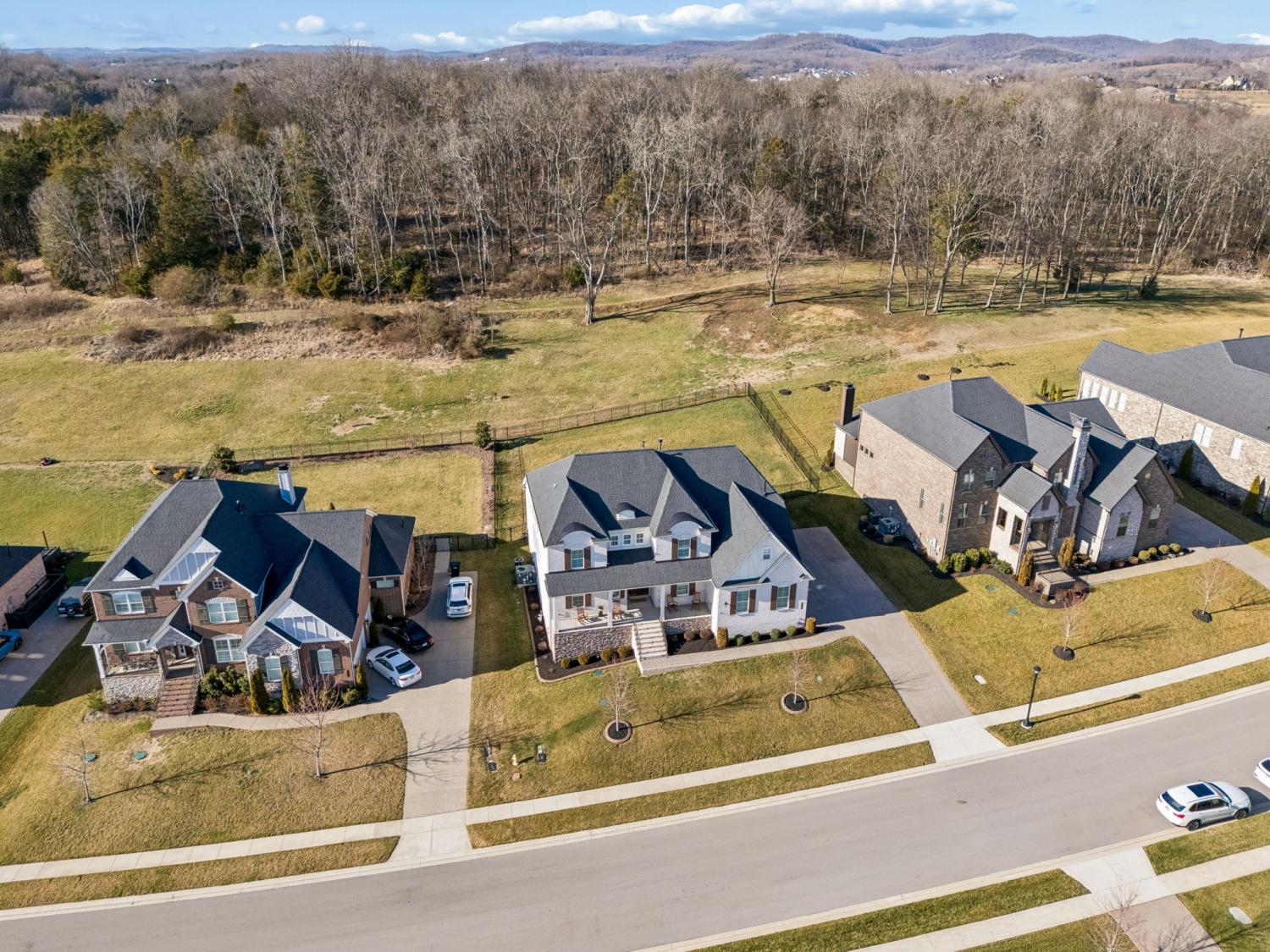 Welcome to this meticulously maintained, move-in ready 4-bedroom, 3.5-bathroom home featuring a spacious, fully fenced private backyard that backs to serene woods, creating a peaceful, park-like setting. Inside, the home offers both a primary suite on the main level and an additional main-floor bedroom—ideal for guests, in-laws, or a home office. The spacious 3-car garage provides ample room for vehicles, storage, and hobbies. The oversized kitchen serves as the heart of the home, anchored by a generous quartz island with quartz countertops throughout. Highlights include soft-close cabinetry, a herringbone subway tile backsplash, brushed gold designer pendants, a gas range, statement hood, and WiFi-enabled double ovens. An expansive covered front porch and statement double entry doors welcome you into a foyer with custom millwork. The vaulted living room impresses with exposed beams, stacked windows that flood the space with natural light, rich hardwood flooring, and a floor-to-ceiling stacked stone fireplace with custom built-ins. Additional thoughtful touches include plumbing ready for a water softener and a gas line for an outdoor grill making future upgrades simple and convenient. This pristine home blends luxury, functionality, and timeless appeal—don't miss out on making it yours! Zoned for Williamson County School district.