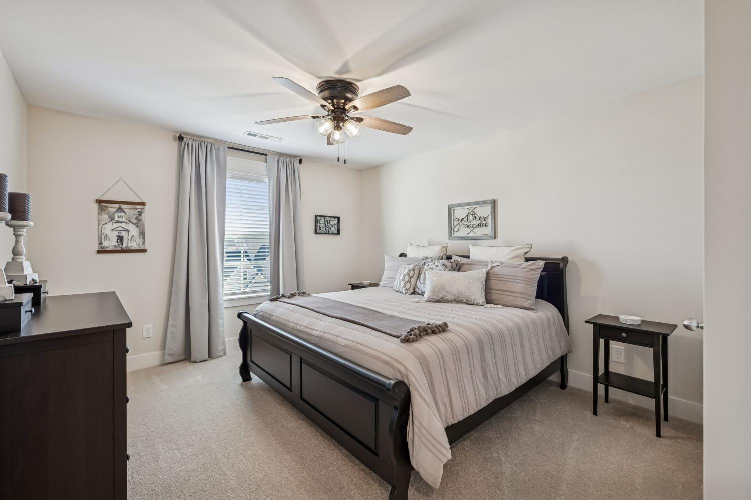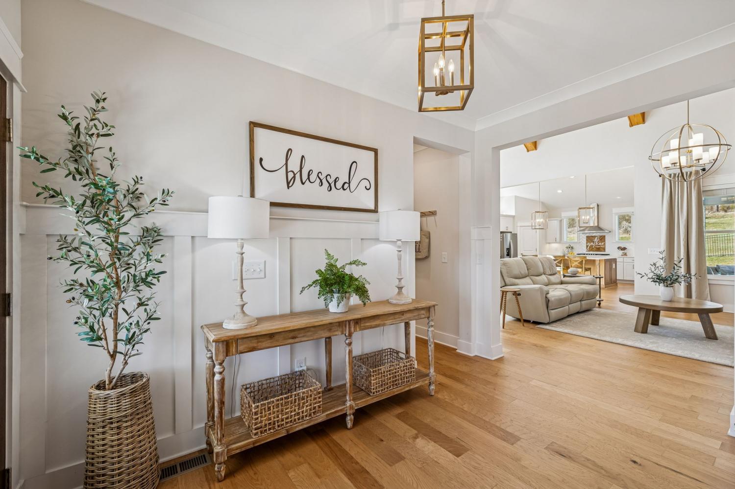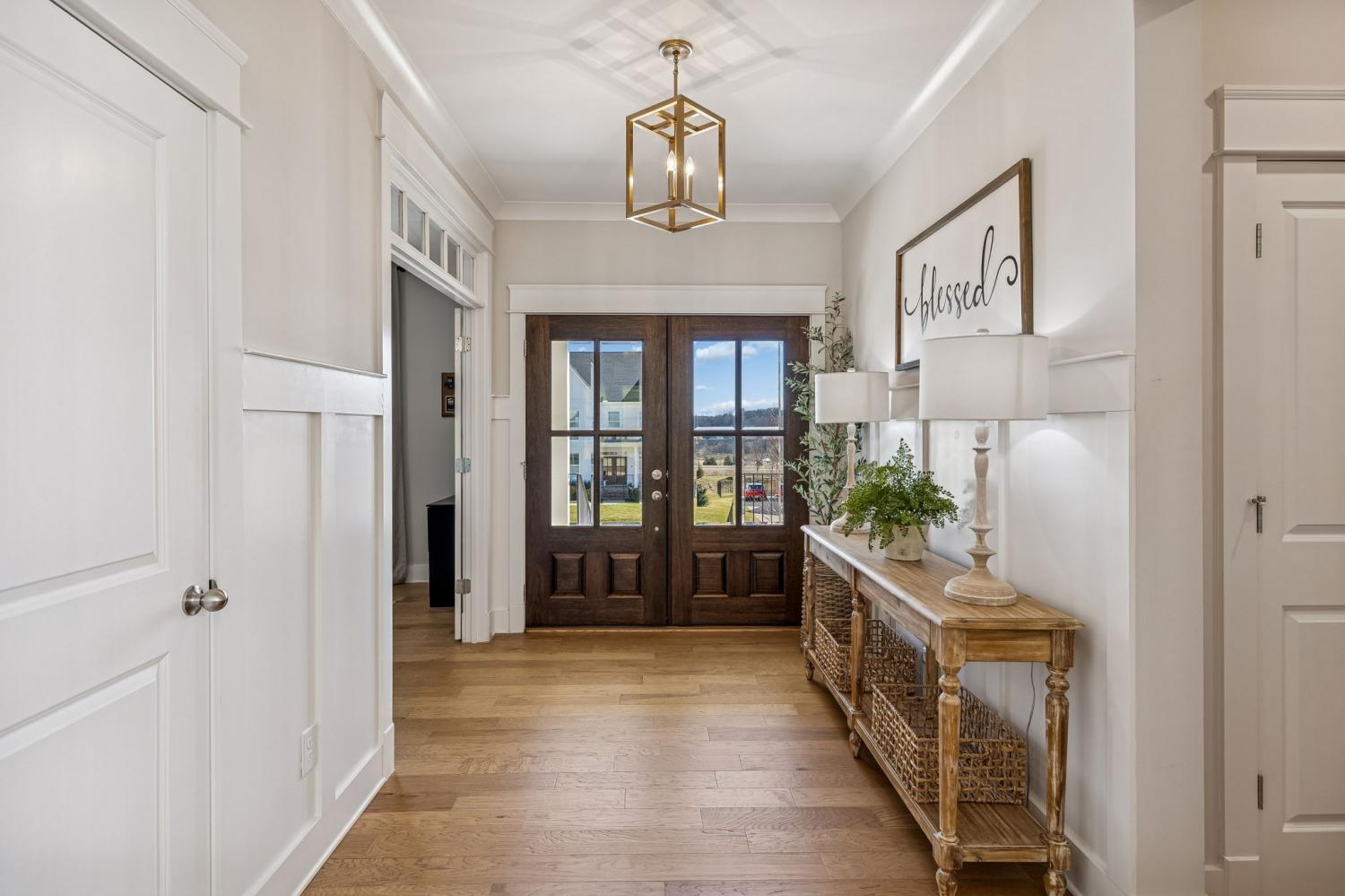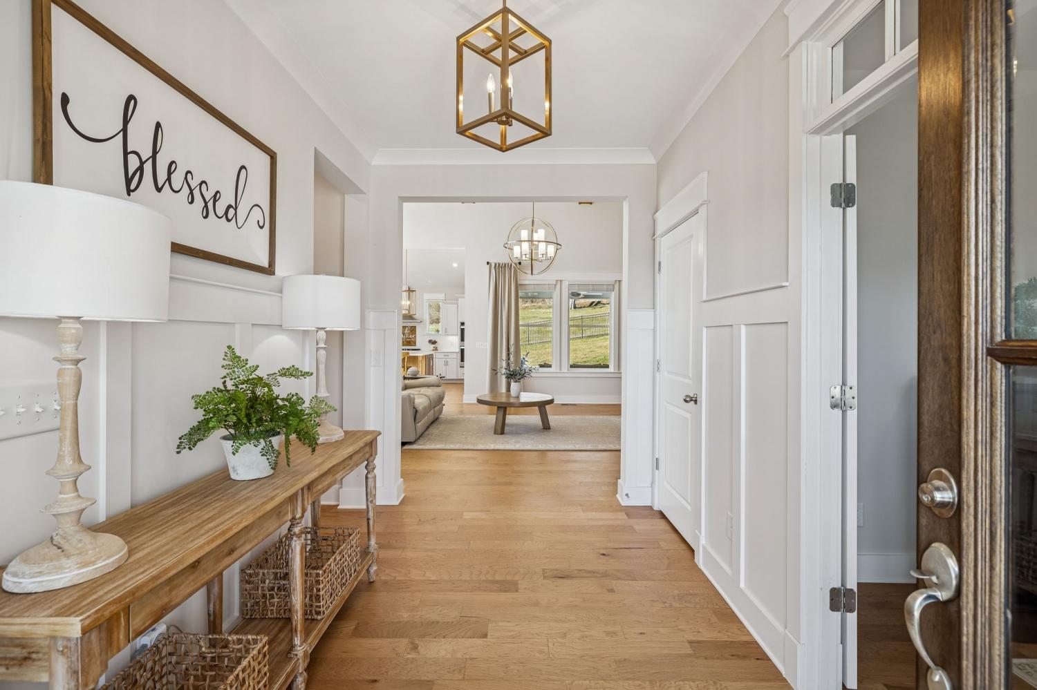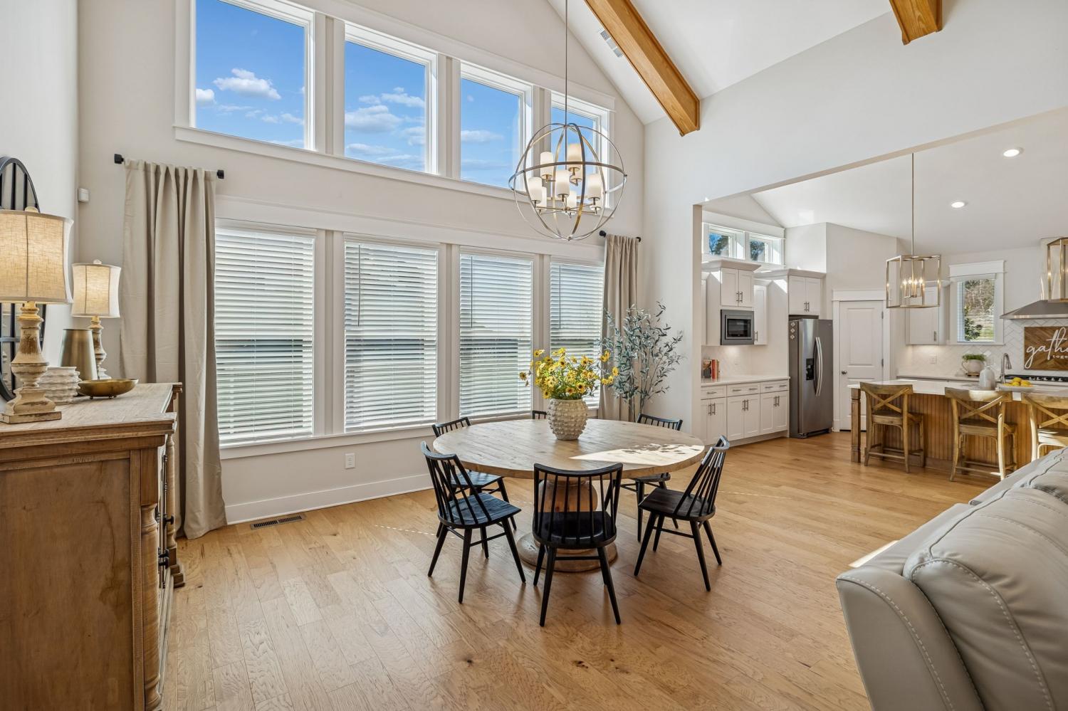Welcome to this meticulously maintained, move-in ready 4-bedroom, 3.5-bathroom home featuring a spacious, fully fenced private backyard that backs to serene woods, creating a peaceful, park-like setting. Inside, the home offers both a primary suite on the main level and an additional main-floor bedroom—ideal for guests, in-laws, or a home office. The spacious 3-car garage provides ample room for vehicles, storage, and hobbies. The oversized kitchen serves as the heart of the home, anchored by a generous quartz island with quartz countertops throughout. Highlights include soft-close cabinetry, a herringbone subway tile backsplash, brushed gold designer pendants, a gas range, statement hood, and WiFi-enabled double ovens. An expansive covered front porch and statement double entry doors welcome you into a foyer with custom millwork. The vaulted living room impresses with exposed beams, stacked windows that flood the space with natural light, rich hardwood flooring, and a floor-to-ceiling stacked stone fireplace with custom built-ins. Additional thoughtful touches include plumbing ready for a water softener and a gas line for an outdoor grill making future upgrades simple and convenient. This pristine home blends luxury, functionality, and timeless appeal—don't miss out on making it yours! Zoned for Williamson County School district.