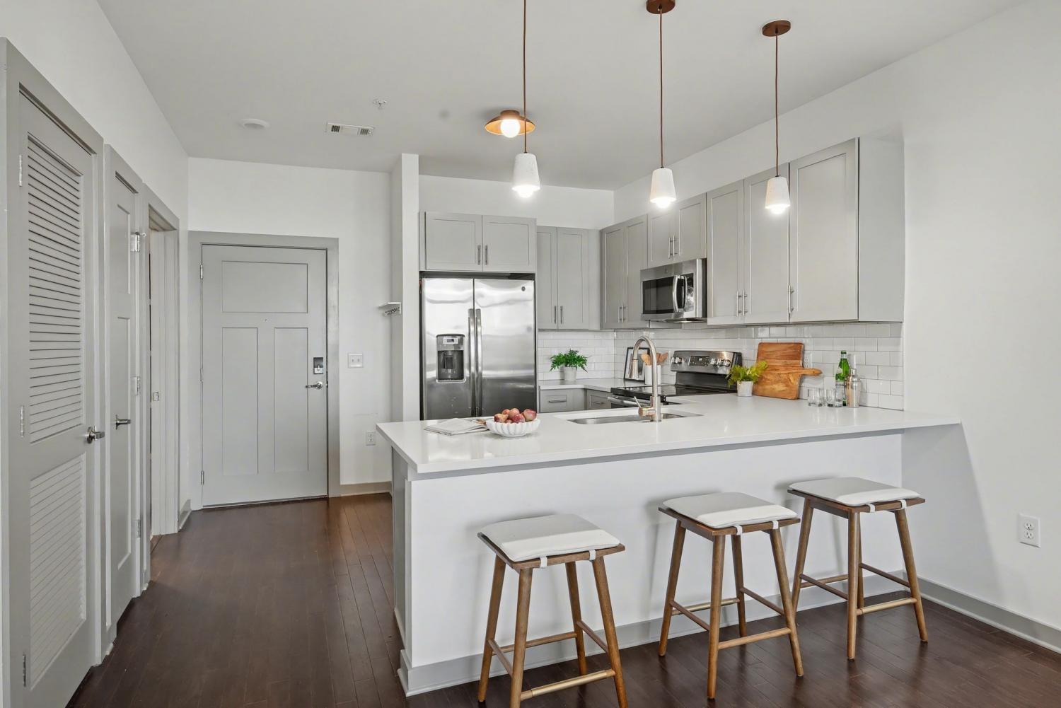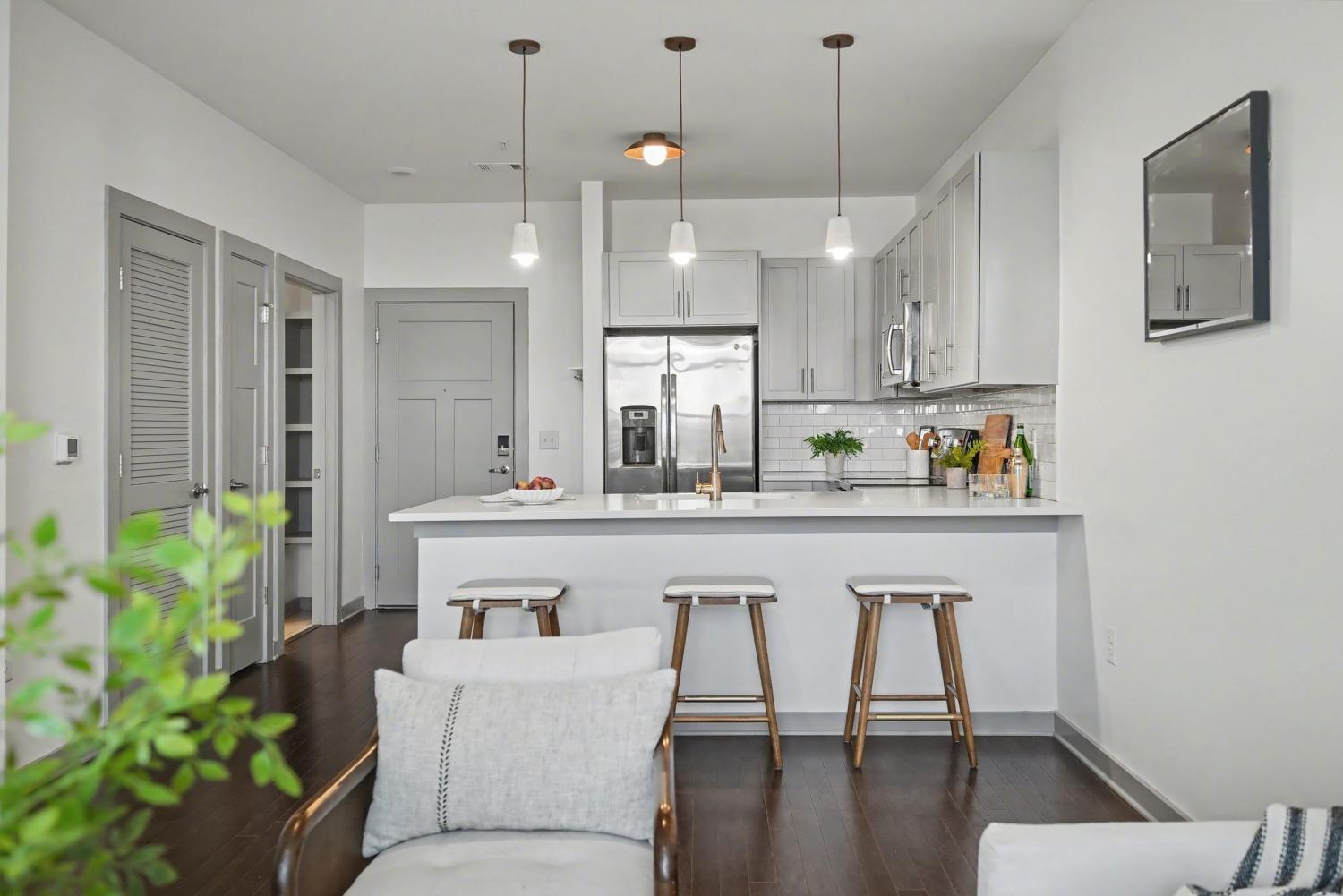 Stylish, one-of-a-kind one-bedroom in the heart of The Nations- in Silo House. This thoughtfully updated one bedroom unit stands out with custom lighting in both the kitchen and living room—an upgrade not found in any other unit—creating a warm, modern ambiance throughout. The bedroom features designer wallpaper that adds rich texture and personality, elevating the space beyond the ordinary. An assigned parking space (32) is conveniently located right next to the closest stairwell to the unit, making coming and going effortless. Enjoy unbeatable walkability to some of Nashville’s best shopping, dining, and local favorites, plus incredibly easy interstate access for seamless commuting. A perfect blend of character, convenience, and modern touches in one of Nashville’s most sought-after neighborhoods.