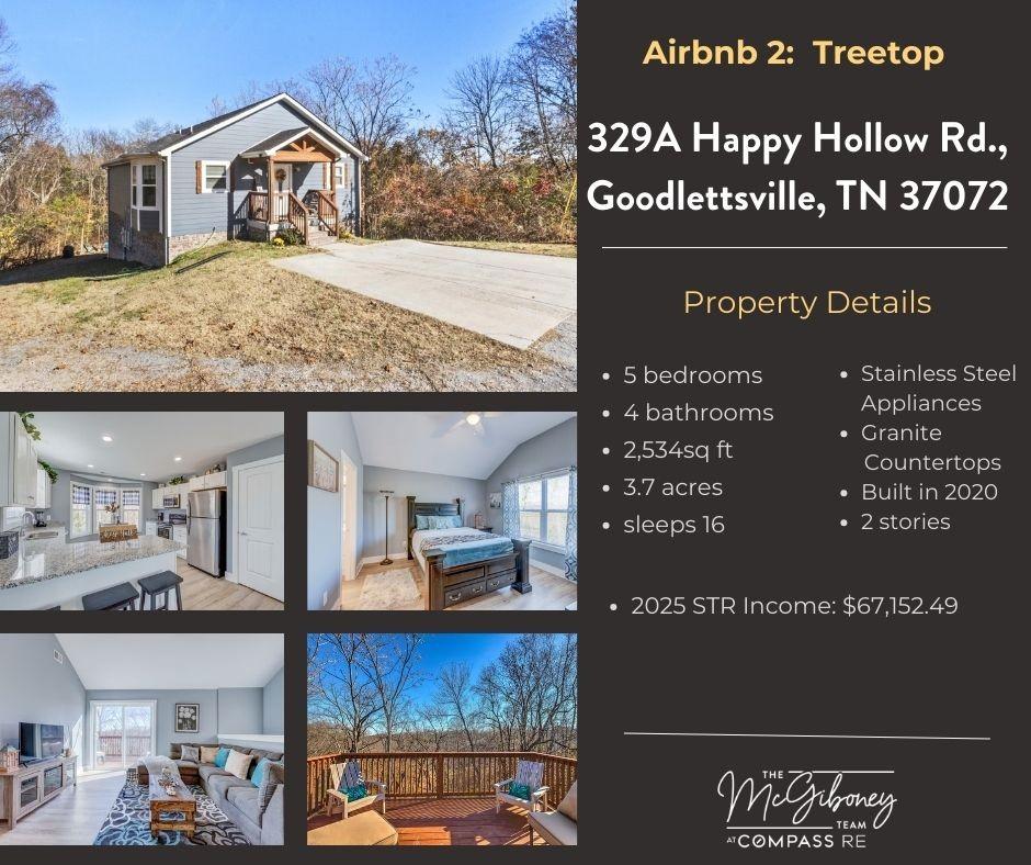 Seclusion, Privacy, Amazing Views! Rare opportunity to OWN 3 HOMES, offered together at one incredible price atop the scenic Hidden Ridge private subdivision in Goodlettsville, TN. This unique property offers breathtaking Gatlinburg-style views from every window and incredible versatility as either a high-performing investment portfolio or a private multi-family homestead. Two of the homes are currently operating as successful Airbnb properties, generating over $140,000 annually for the past three years, with the potential for $250,000+ in short-term rental income across all 3 properties. The third home provides additional flexibility for expanded rental opportunities, owner occupancy, or extended family living, with an apartment in the basement. All furnishings in the 2 Airbnb's WILL REMAIN! Airbnb listings will transfer at closing, allowing IMMEDIATE INCOME! Nestled in a peaceful hilltop setting, yet conveniently located to Nashville, this property offers the perfect blend of privacy, income potential, and stunning mountain-like scenery. Ideal for investors, multi-generational living, or families looking to create a private compound. All 3 homes are newer and built to last with all the upgrades! Buy all three homes together and unlock the full potential of this exceptional property. Airbnb/VRBO statements can be provided upon requests to prove income. Owner lives in 329C. Please request a showing before going to the home, as Airbnb guest are frequently there and we do not want to bother them. Pond with bridge and Hidden Ridge sign is at the bottom of the hill/driveway. Pictures have details of each home. Keep scrolling through pics to learn more! Links to both Airbnb's are attached in media below.