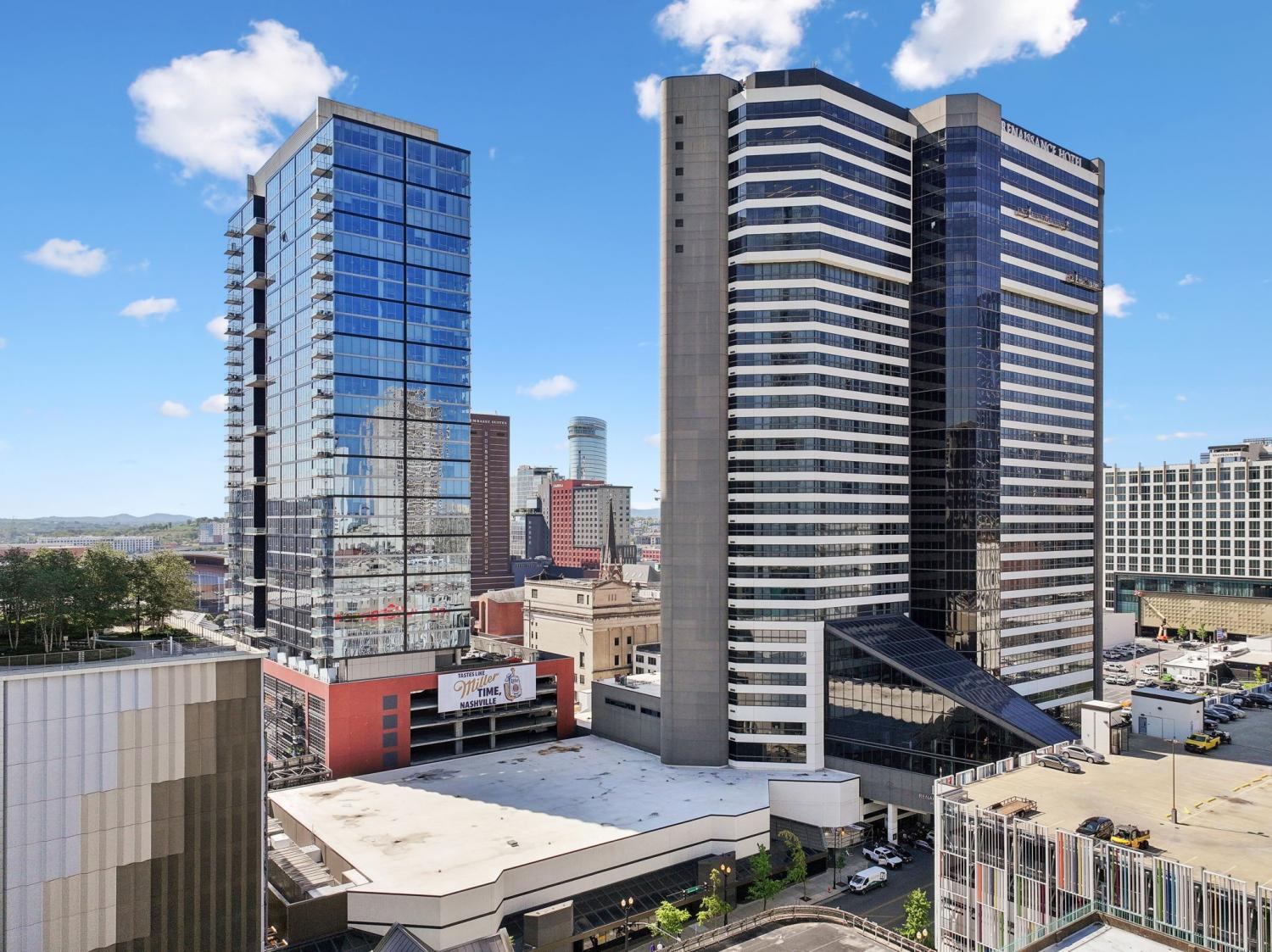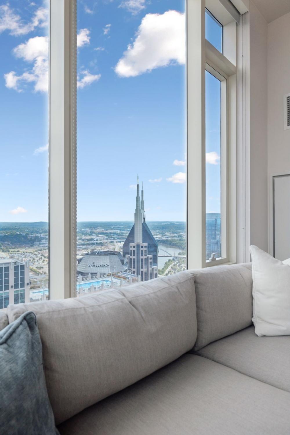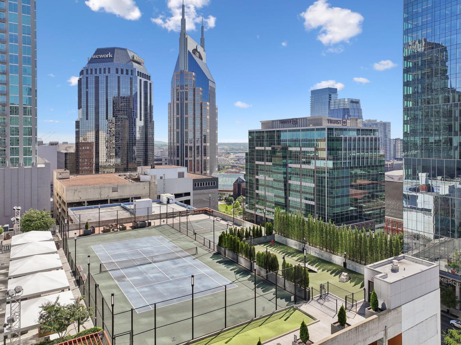 Welcome to the Prestigious 505 Building Downtown Nashville! This Remarkable 2-Bedroom CORNER Unit combines Comfort, Luxury, & Breathtaking Views of Nashville and the Surrounding Hills. Bathed in Natural light, the condo features Upgraded and Expanded Quartz Countertops and is being sold COMPLETELY FURNISHED with Designer Furniture from Mitchell+Gold (some exclusions). ** This unit has a designated place in a PRIVATE PARKING GARAGE**Both Bedrooms come with En Suite Bathrooms, custom California Closets, and Expansive City Views. This Corner Unit has a Well-Designed Layout with Private Balcony, ideal for enjoying the dazzling downtown lights. Fondly referred to as the “Fireworks Corner,” this home offers a prime vantage point for the Fourth of July celebrations, New Year’s Eve fireworks from Bicentennial Mall, and the Friday night fireworks after Nashville Sounds home games. The building boasts an elegant lobby with 24/7 Concierge and AMAZING Amenities: Inviting Pool, Cabanas, Tennis Court, Pickleball and Dog Park. Inside, owners will find a private owners’ lounge, and state-of-the-art fitness center, private Italian-inspired wine/dining room and 24 hour coffee bar. You'll find everything you need here, just steps away from Nashville’s world-class dining and vibrant entertainment. Make this your permanent home or keep as a Downtown Music City Getaway!