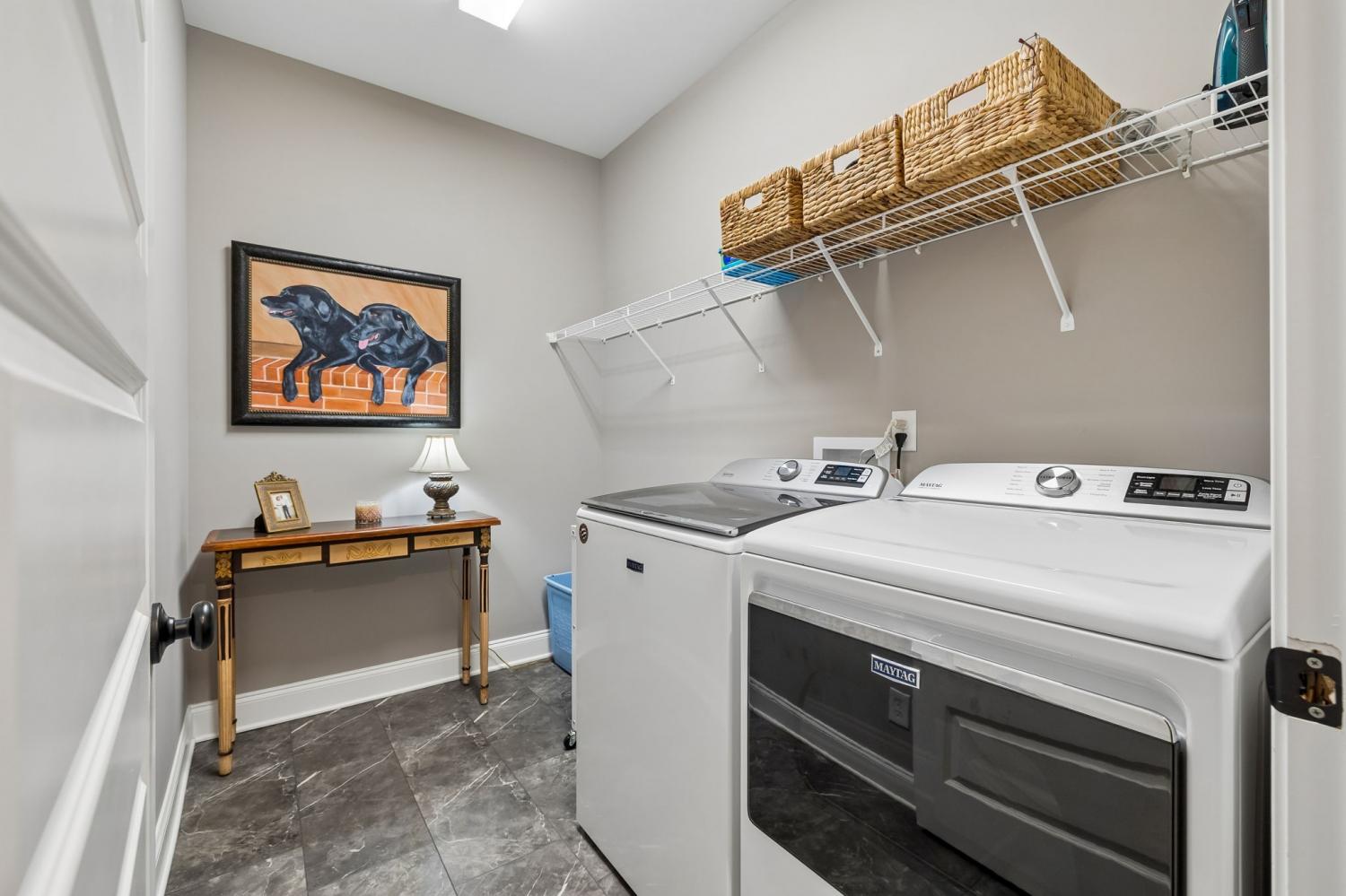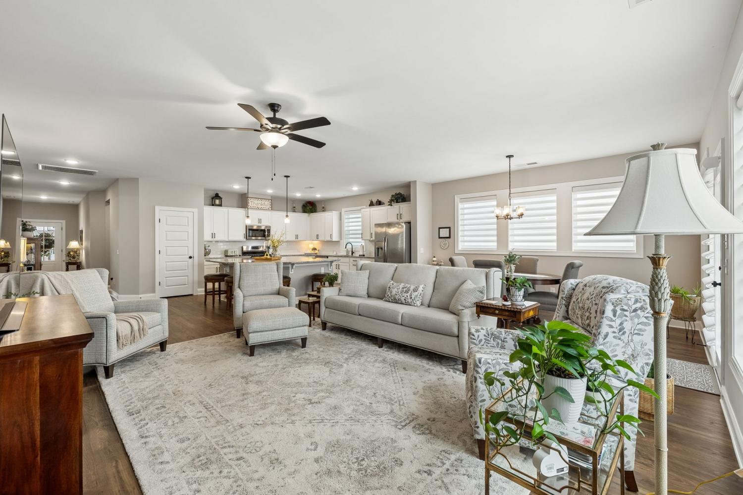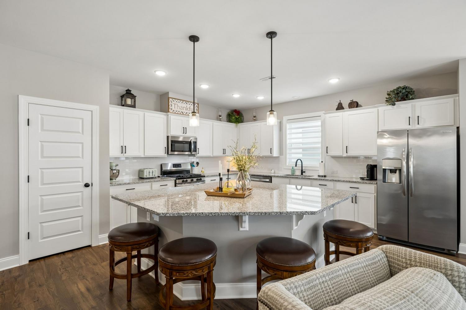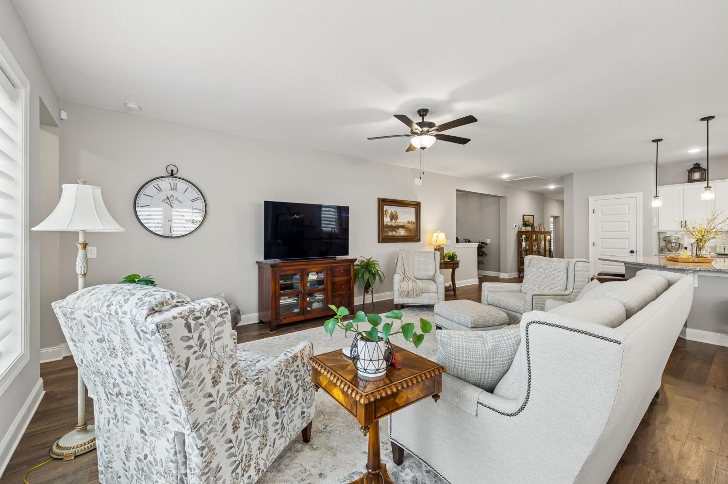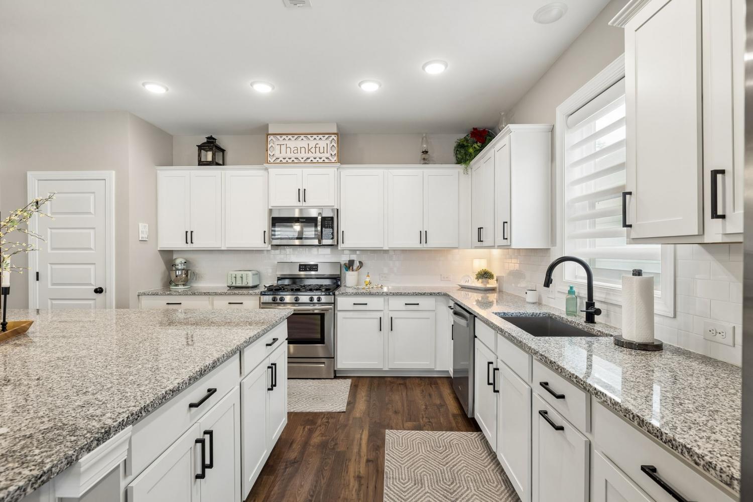 One Level Home on a quiet cul-de-sac in White House, TN (Reserve at Palmers Crossing) * 3 Bedrooms and 2 Full Bathrooms * Home is Immaculate * Split Bedroom Floorplan * Entry Foyer leads into a Spacious Kitchen/Dining/Living Area and Features the Chefs Kitchen with Recessed Lights, a Pantry, Granite Countertops, Tile Backsplash/White Cabinetry, Oversized Island, Pull Out Trashcan and adjoining Dining and Living Area with Hardwood Laminate Flooring, and Blinds on all Windows * Study in this home could be used as a Formal Dining Room * Primary Bedroom with Walk-In Closet and Private Bathroom (separate tub and shower and 2 sink vanity * Utility Room with Shelving * Blinds are throughout the home and are Hunter Douglas Blinds (motarization, pirouette) * Backpack Rack at Entry from Garage into House * 2 Car Garage, Garage Floor/Porches/Steps are sealed by Guardian Garage Floors * Driveway sealed by Forever Seal * Covered Porch on Front * Covered Patio on Back * Irrigation System in Front and Back Yards *