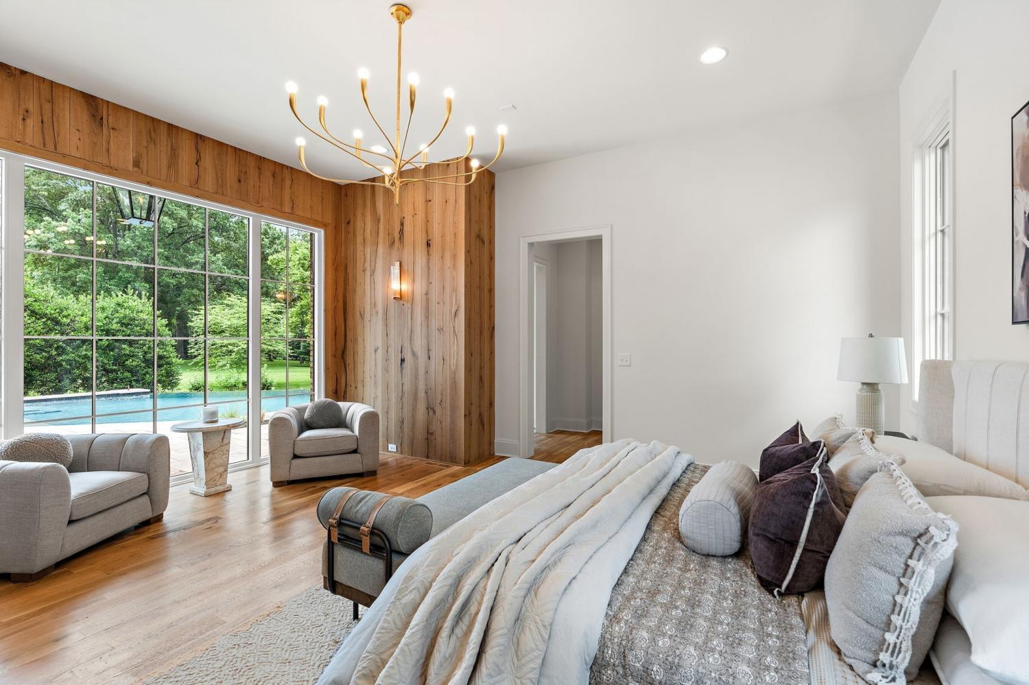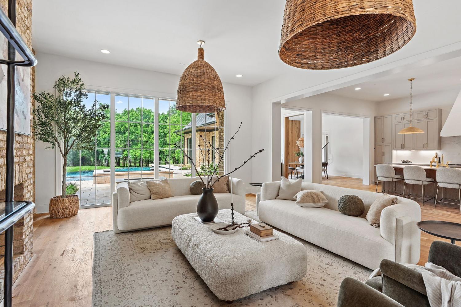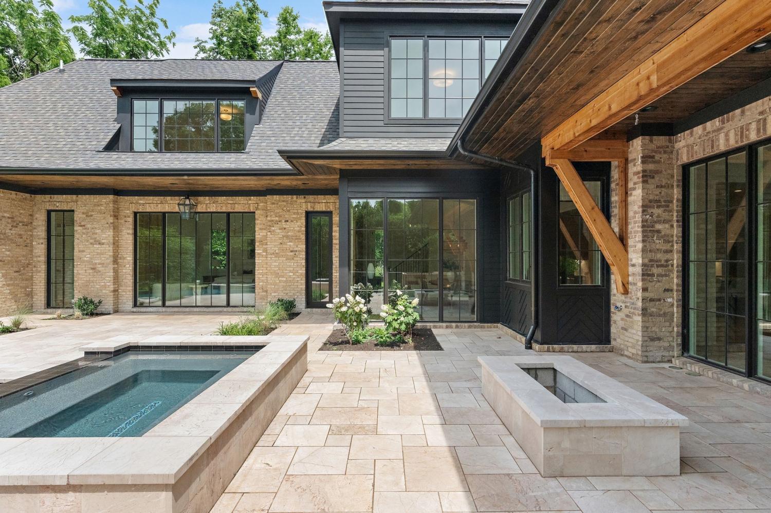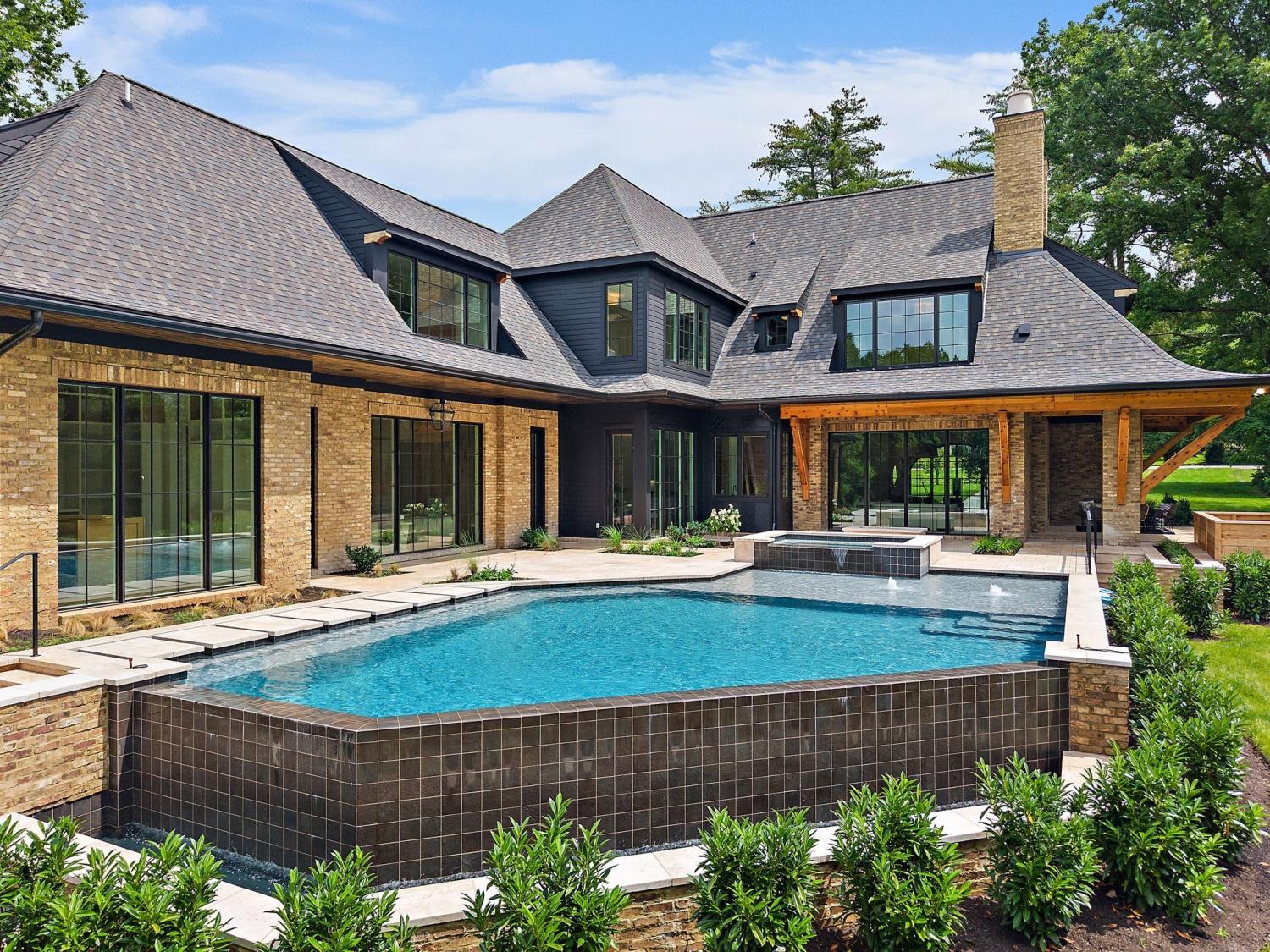 This stunning French Country–inspired estate blends timeless elegance with modern luxury. Situated on 1.2 flat acres, the home features 11-foot ceilings on the main level and 9-foot ceilings upstairs, creating a spacious and airy feel throughout. Designed for both everyday living and grand entertaining, the residence offers a three-car garage with a custom porte-cochère, and a heated gunite infinity-edge pool, spa, and firepit—truly an entertainer’s dream. Inside, you’ll find designer finishes, Signature Hardware fixtures, and a turnkey interior ready to impress. The chef’s kitchen is outfitted with Miele and KitchenAid appliances, a marble island, and an open layout that flows beautifully into the living and dining spaces.Enjoy the luxury of two primary suites on the main floor, ideal for multigenerational living or hosting guests in comfort and style.Soaring floor-to-ceiling windows and a spectacular arched front door flood the home with natural light, offering serene views of the lush landscaping and pool beyond.