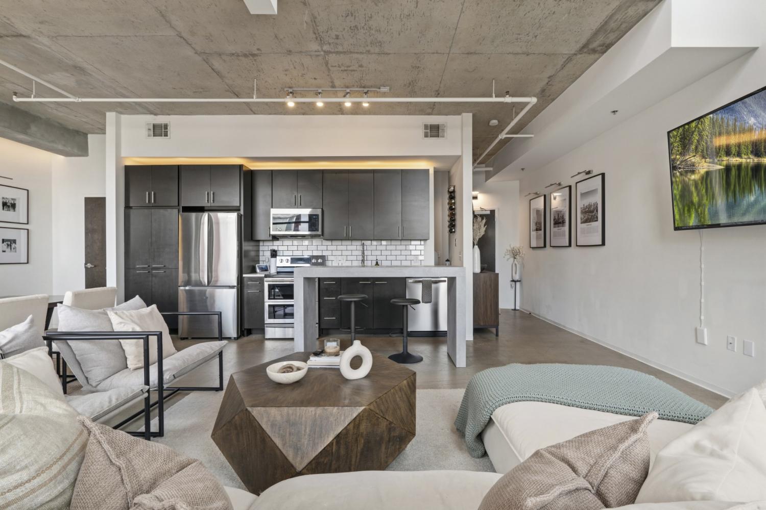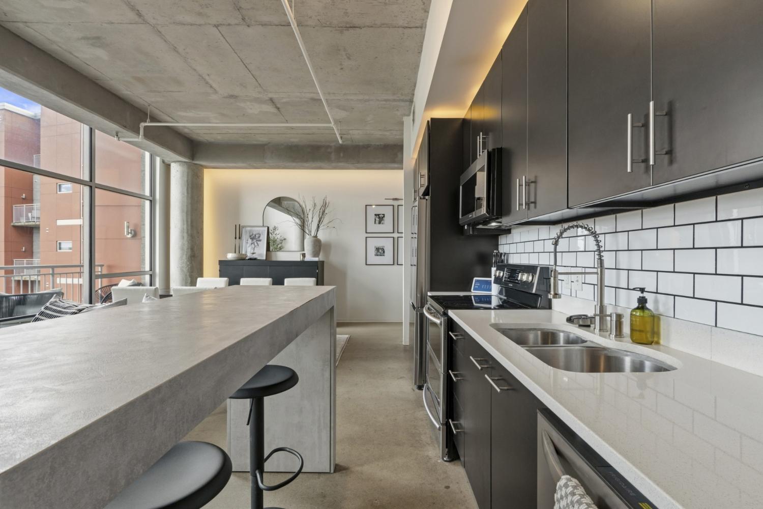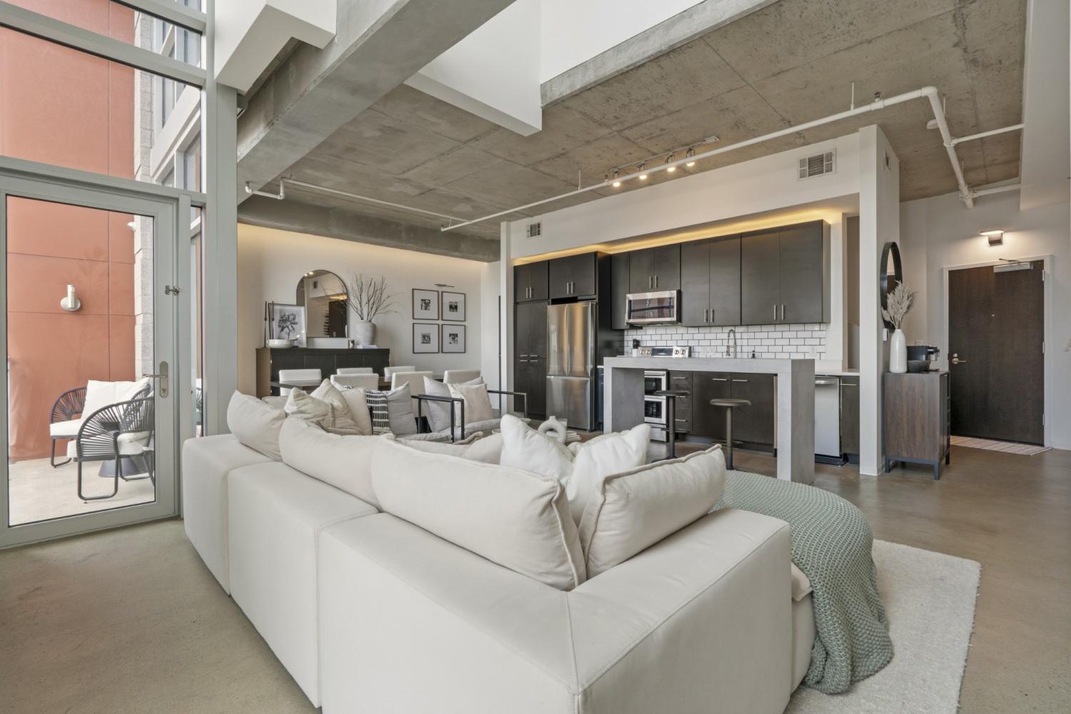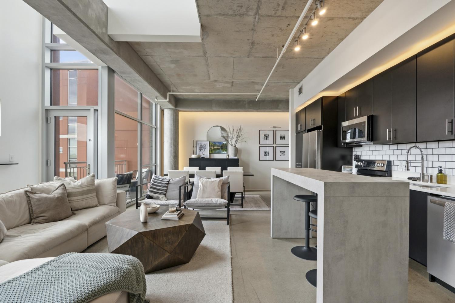 Introducing Unit 405 at 5th & Main, where scale, style, and location converge in one of East Nashville’s most vibrant and walkable communities. Spanning 1,351 square feet, this oversized one-bedroom loft immediately makes an impression with soaring ceilings, exposed concrete elements, and floor-to-ceiling windows that illuminate the space with natural light. The open-concept living and dining areas create a sense of volume rarely found in condo living - offering plenty of room to entertain, work from home, or simply unwind in a space that feels both expansive & inviting. The new kitchen anchors the main level with modern finishes and a seamless connection to the living area, allowing conversations & gatherings to flow effortlessly. Elevated above the living space, the primary suite becomes its own retreat. Here, towering windows and exposed columns frame the loft’s industrial architecture, creating a bedroom that feels both dramatic & intimate. The suite is complemented by a spacious ensuite bath, while a rare half bath on the main level provides added convenience for guests. Beyond the home itself, 5th & Main offers a true urban lifestyle with concierge service, a fully equipped fitness center, gated garage parking, and a stunning owner’s sky deck. From this elevated vantage point, residents enjoy sweeping skyline views and soon, a front-row seat to Nashville’s most transformative development yet: the $2.1B Titans stadium and the 500-acre East Bank riverfront district rising in unobstructed sight. Step outside into one of Nashville’s most walkable neighborhoods, where East Nashville’s favorite restaurants, coffee shops, breweries, and boutique fitness studios are just moments away - all while being minutes from downtown. With its rare scale, dramatic loft architecture, full-service amenities, and unbeatable location at the center of Nashville’s next great urban district, Suite 405 offers a lifestyle that feels both exciting today & poised for the future.