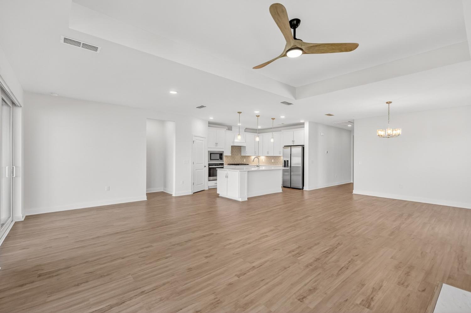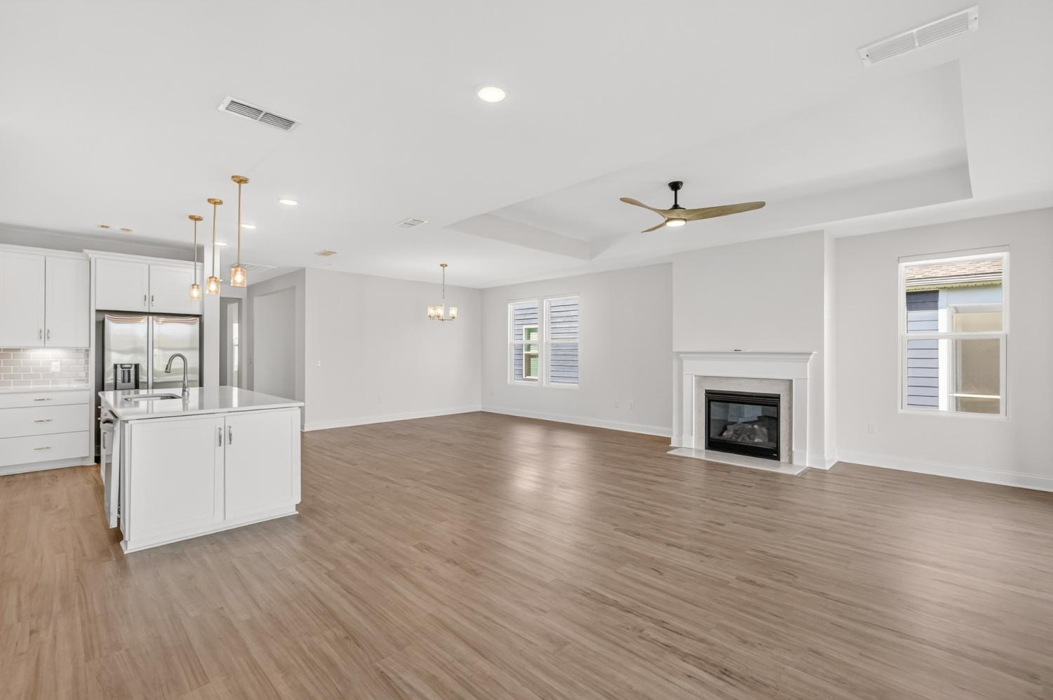 Better than new and perfectly positioned on a premium lot backing to community green space, this beautifully expanded & upgraded Mystique floor plan offers the very best of 55+ living in Southern Harmony by Del Webb. Skip the wait for new construction and enjoy a home on a premium lot where the most important upgrades are already complete! Fencing, irrigation, and custom motorized blinds throughout are already in place and ready for new owners! Designed for effortless one-level living, this home offers a bright open layout centered around a spacious expanded Gathering Room with a cozy fireplace. The home’s inviting outdoor spaces allow you to start the day watching sunrise from the covered back patio and end it enjoying sunset views from the welcoming front porch. The upgraded gourmet kitchen is perfect for entertaining friends and neighbors, featuring white soft-close cabinetry, quartz countertops, built-in appliances, and under-cabinet lighting. The Owner’s Suite is a peaceful retreat with a luxurious bath with tile flooring, dual quartz vanities, and a zero-entry tiled shower with rainfall shower head, bench seating, and easy-reach controls. The tandem garage provides space for two cars plus your golf cart, making it easy to explore the neighborhood and enjoy all the community has to offer. Resort-style amenities include 8 pickleball courts, bocce, fishing pond, amphitheater, Veterans Park/Arboretum, indoor and outdoor pools, gym and fitness studio, ballroom, and social gathering spaces. If you’re ready to downsize the chores and upgrade your lifestyle, this exceptional home is ready for you to begin your next chapter.