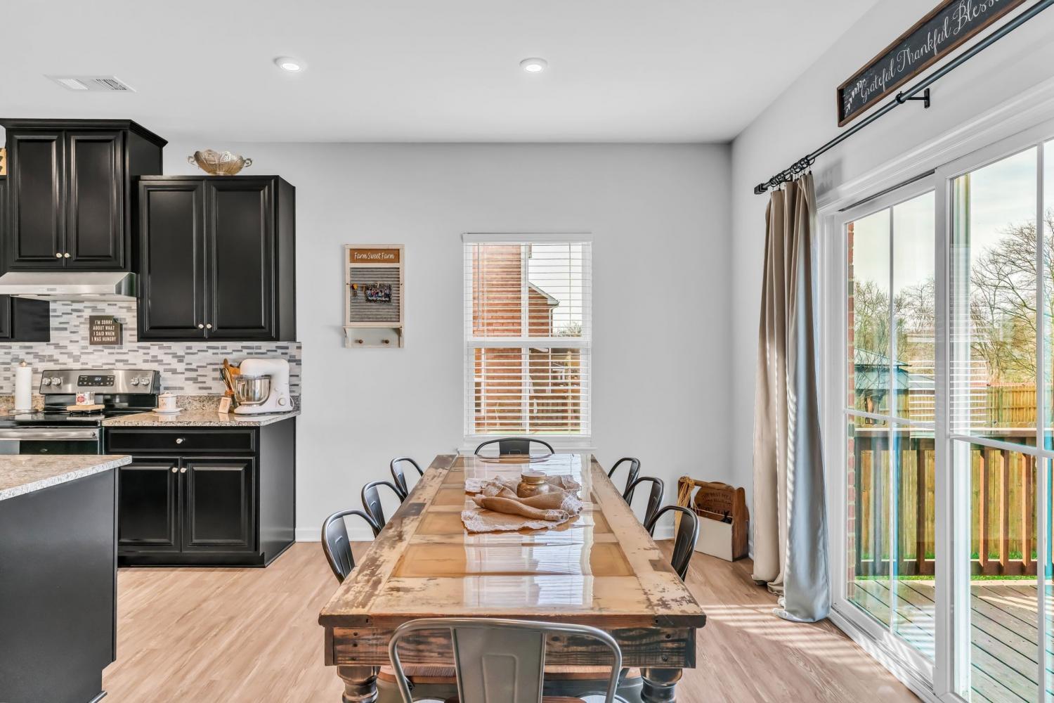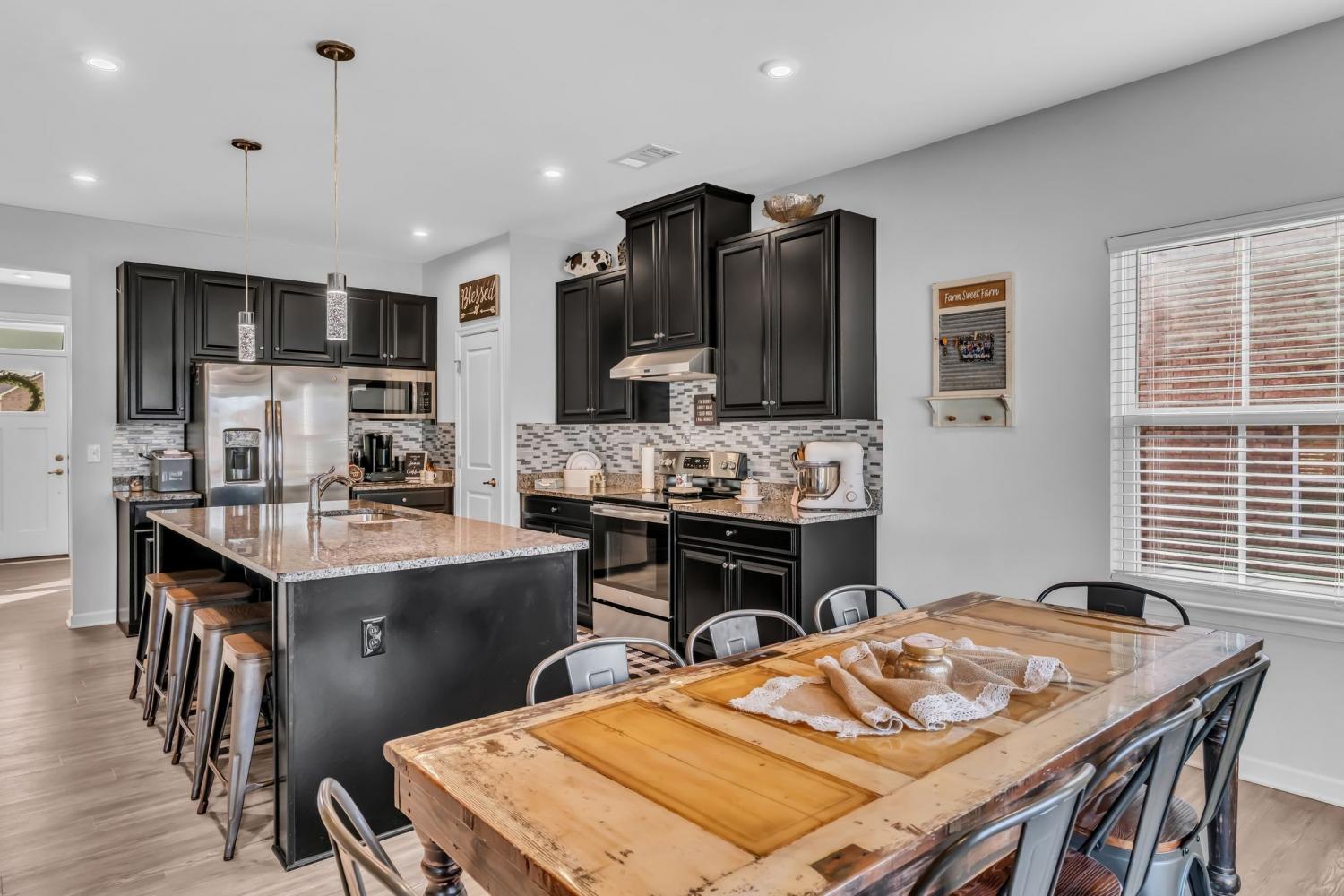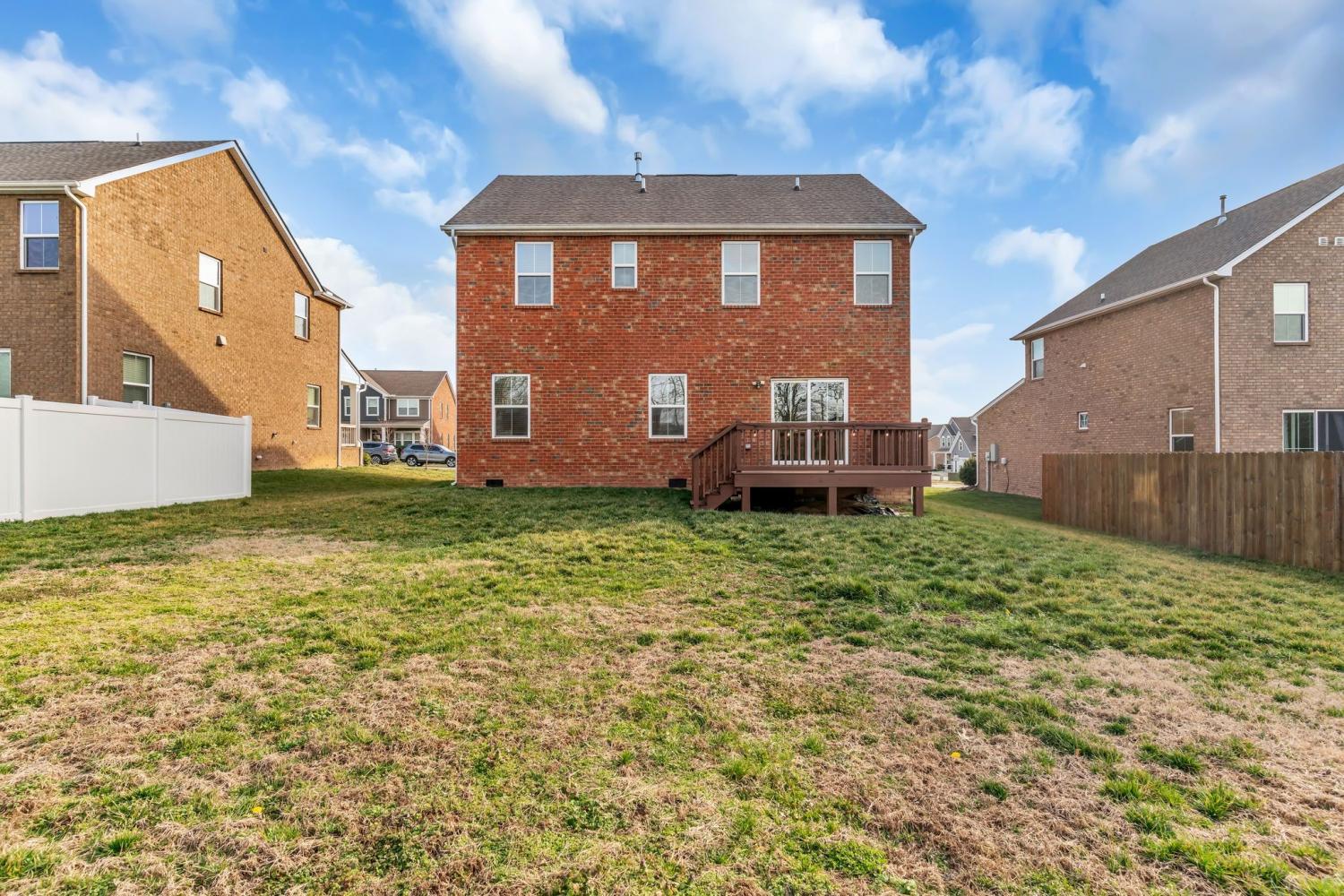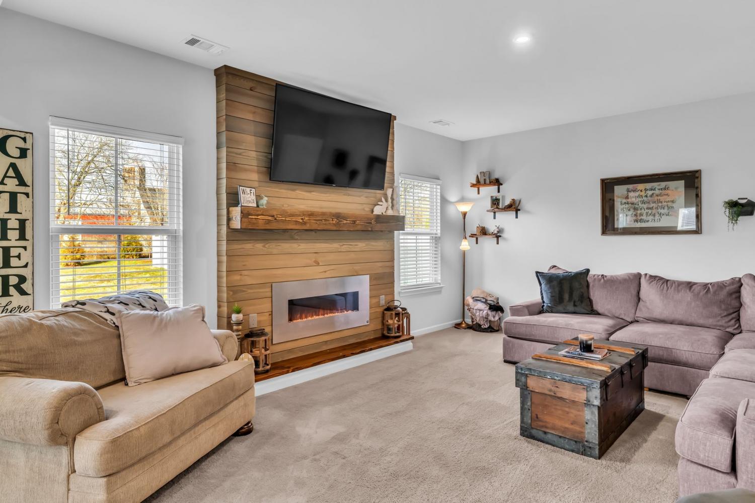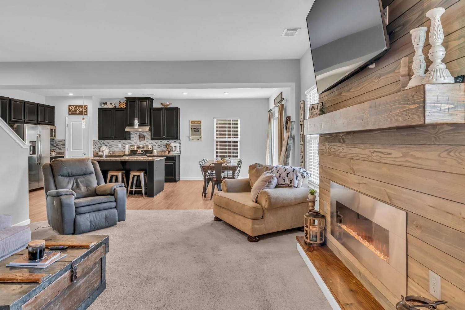 This inviting 4-bedroom, 2.5-bath home is located in the desirable Liberty Creek school zone (Howard Elementary, Liberty Creek Middle and High Schools). It offers an open floorplan and a convenient location close to SR 109 and SR 386 (Vietnam Veterans Blvd), making commuting to Gallatin, Hendersonville, or Nashville easy. The main living area features a cozy electric fireplace with shiplap surround and wood mantel, neutral tones, and plush carpeting. The kitchen flows seamlessly into the family and dining spaces, with dark cabinetry, granite countertops, a large island with bar seating, stainless appliances (the refrigerator remains with the home), and plenty of natural light. Upstairs are four spacious bedrooms, including the primary suite and a convenient laundry room with washer and dryer that convey with the property. Enjoy the backyard deck for outdoor relaxation. The exterior boasts gray siding and brick, white trim, a welcoming front porch, and attractive curb appeal.