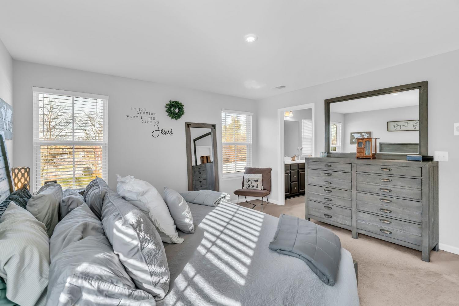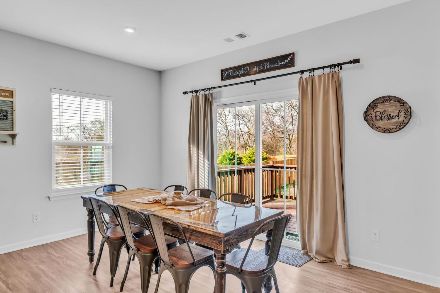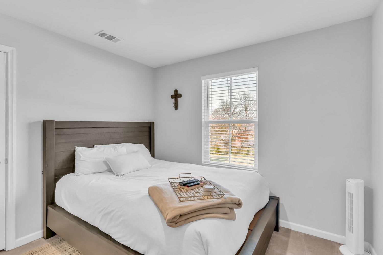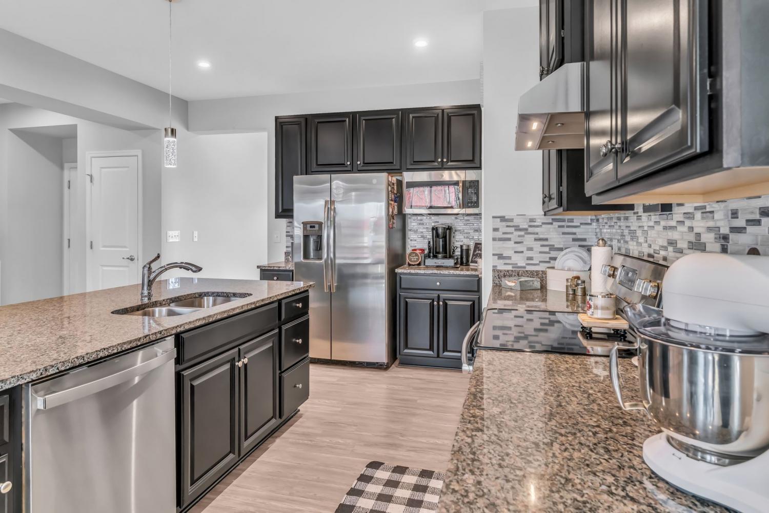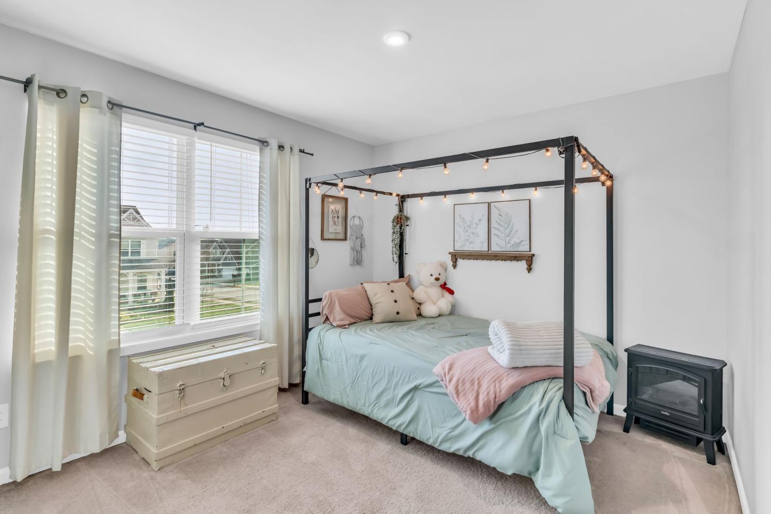 This inviting 4-bedroom, 2.5-bath home is located in the desirable Liberty Creek school zone (Howard Elementary, Liberty Creek Middle and High Schools). It offers an open floorplan and a convenient location close to SR 109 and SR 386 (Vietnam Veterans Blvd), making commuting to Gallatin, Hendersonville, or Nashville easy. The main living area features a cozy electric fireplace with shiplap surround and wood mantel, neutral tones, and plush carpeting. The kitchen flows seamlessly into the family and dining spaces, with dark cabinetry, granite countertops, a large island with bar seating, stainless appliances (the refrigerator remains with the home), and plenty of natural light. Upstairs are four spacious bedrooms, including the primary suite and a convenient laundry room with washer and dryer that convey with the property. Enjoy the backyard deck for outdoor relaxation. The exterior boasts gray siding and brick, white trim, a welcoming front porch, and attractive curb appeal.