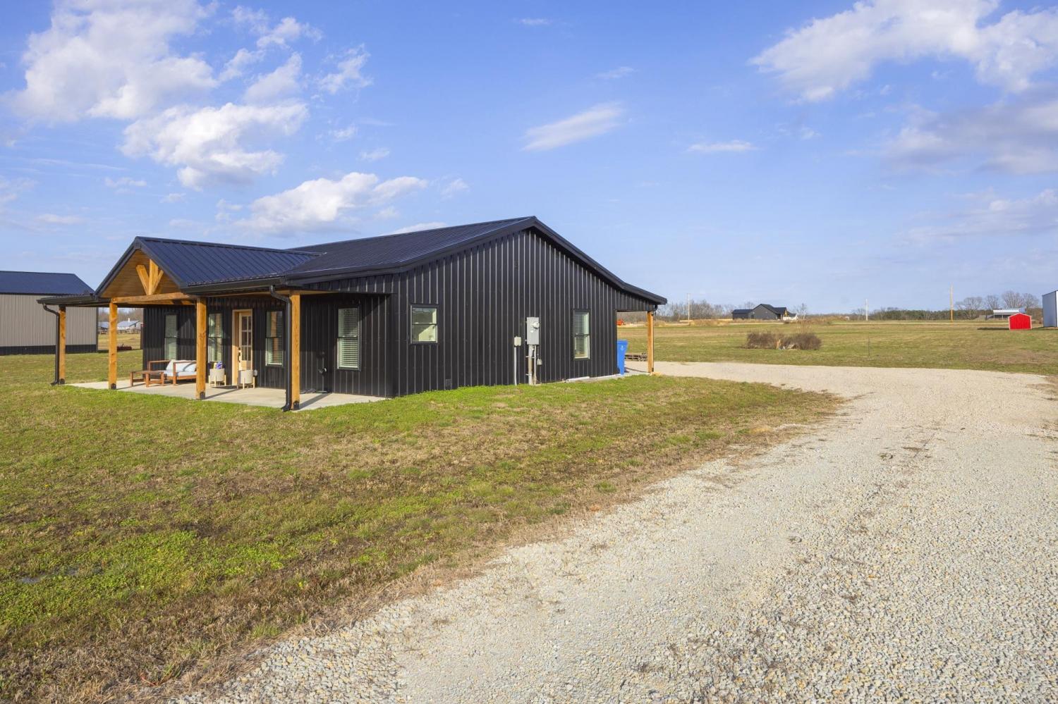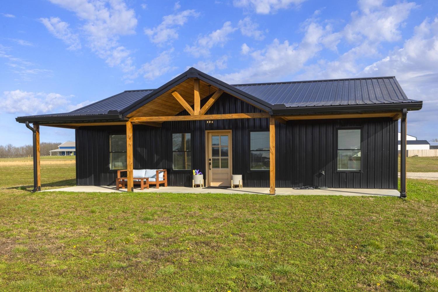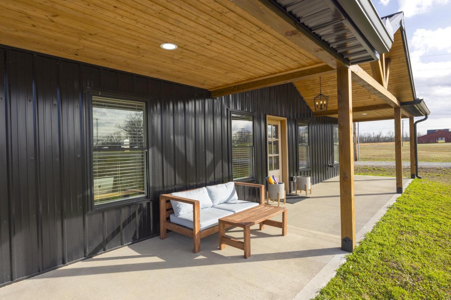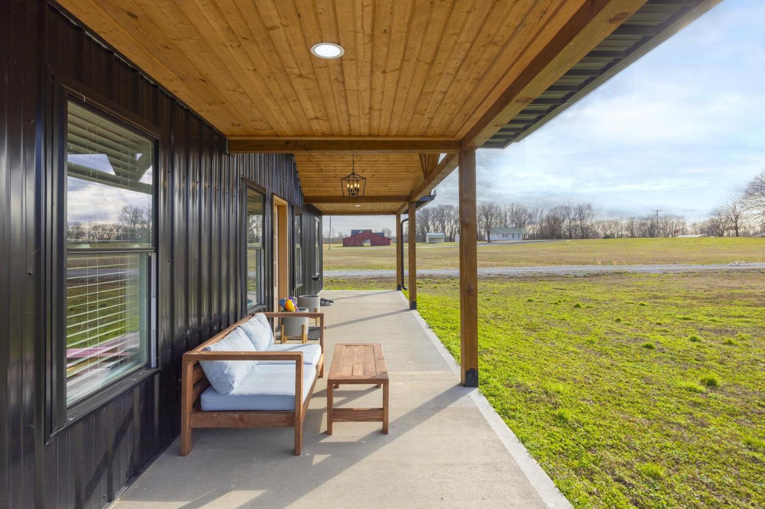 Modern farmhouse on 2 country acres in Summertown, TN! A black metal exterior contrasts beautifully with natural stained wood to provide a striking look. The main living area has a gorgeous vaulted tongue & groove ceiling that extends outside to the covered front & rear porches. This home is designed for ease and comfort with 3 beds and 2 full baths, tiled showers, ceiling fans, stainless steel appliances, quartz countertops, kitchen island, soft-close cabinets, and LVP flooring all on a single, step-free, level. Spray foam insulation helps make the interior energy efficient while porches running the full length of the front & back allow you to take in those perfect mornings and evenings. Skip the wait for new construction with this virtually new, only one-year old, home!