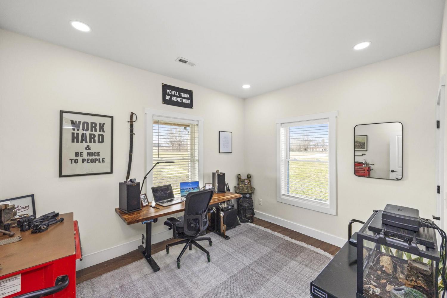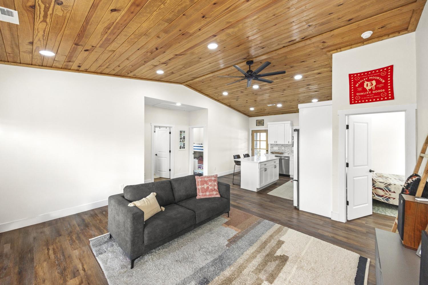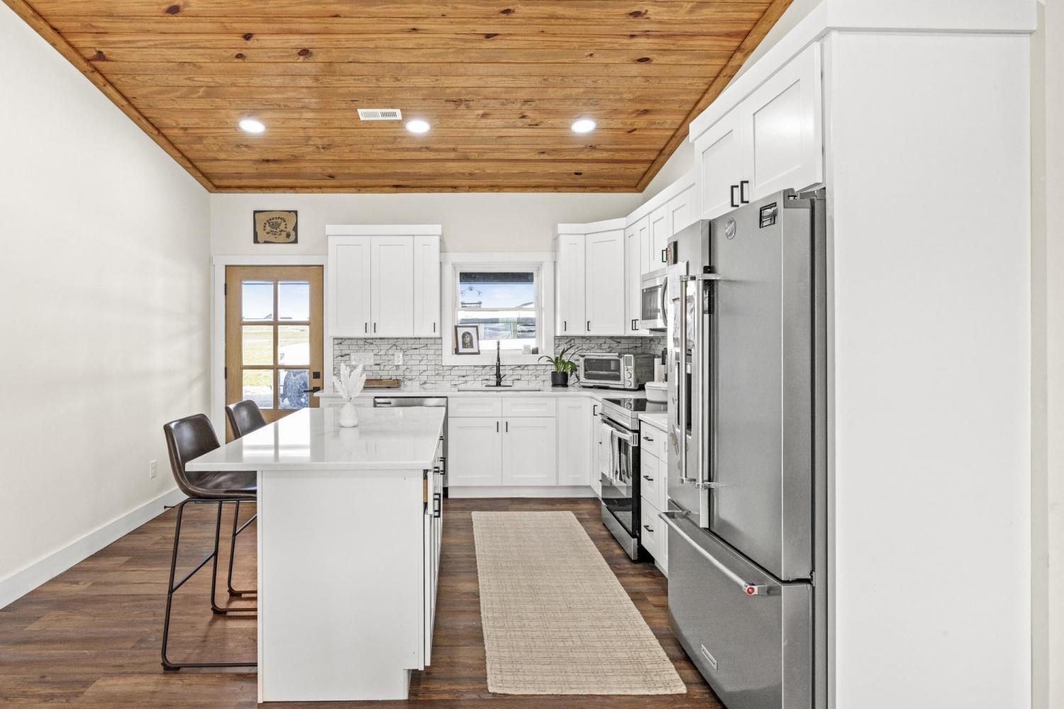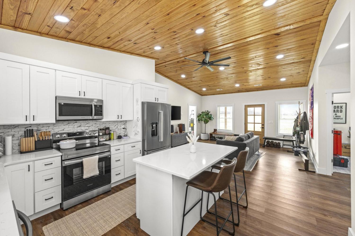 Modern farmhouse on 2 country acres in Summertown, TN! A black metal exterior contrasts beautifully with natural stained wood to provide a striking look. The main living area has a gorgeous vaulted tongue & groove ceiling that extends outside to the covered front & rear porches. This home is designed for ease and comfort with 3 beds and 2 full baths, tiled showers, ceiling fans, stainless steel appliances, quartz countertops, kitchen island, soft-close cabinets, and LVP flooring all on a single, step-free, level. Spray foam insulation helps make the interior energy efficient while porches running the full length of the front & back allow you to take in those perfect mornings and evenings. Skip the wait for new construction with this virtually new, only one-year old, home!