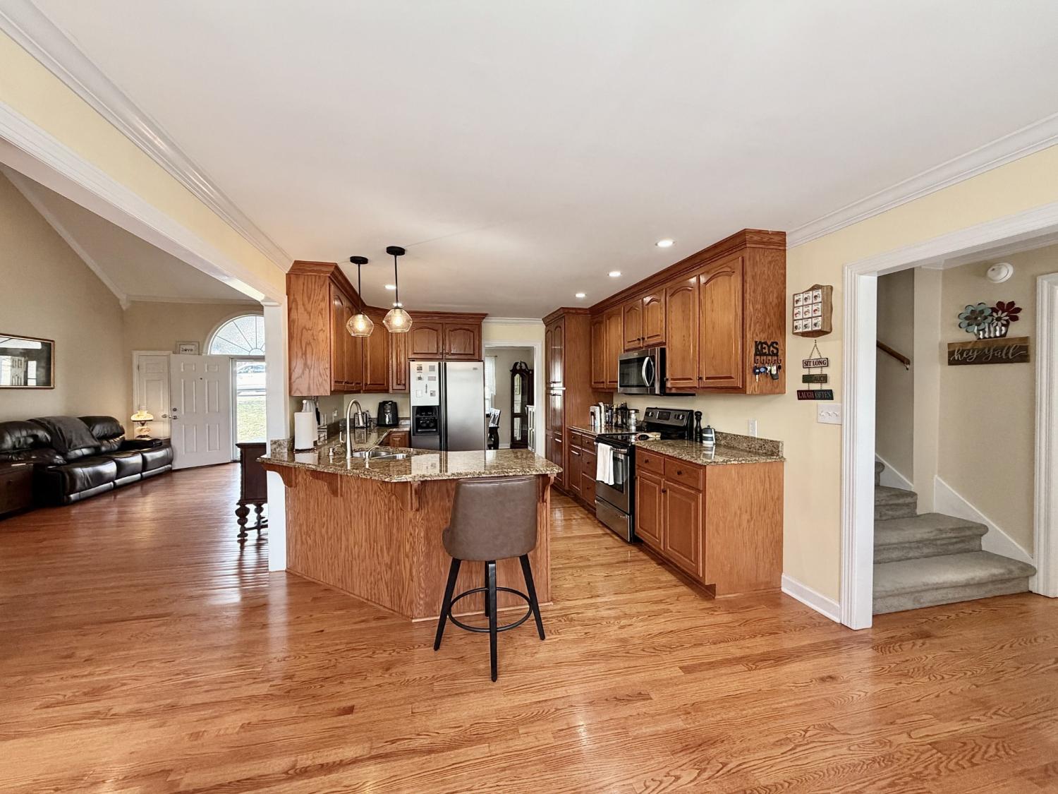 Take a look around this perfectly maintained, move-in-ready home in one of Pulaski's most desirable neighborhoods. Great floorplan for entertaining offering a large living area with vaulted ceilings and fireplace, formal dining room, and eat-in kitchen. Kitchen offers abundance of cabinet space and granite countertops. Hardwood floors throughout the main level. Primary suite has tray ceiling, double vanity, garden tub, and separate tile shower. Bonus room above garage. Attached garage with handicap ramp. Oversized rear deck overlooking private back yard.