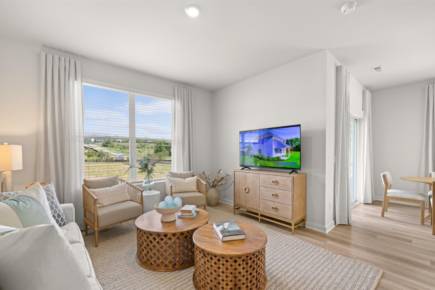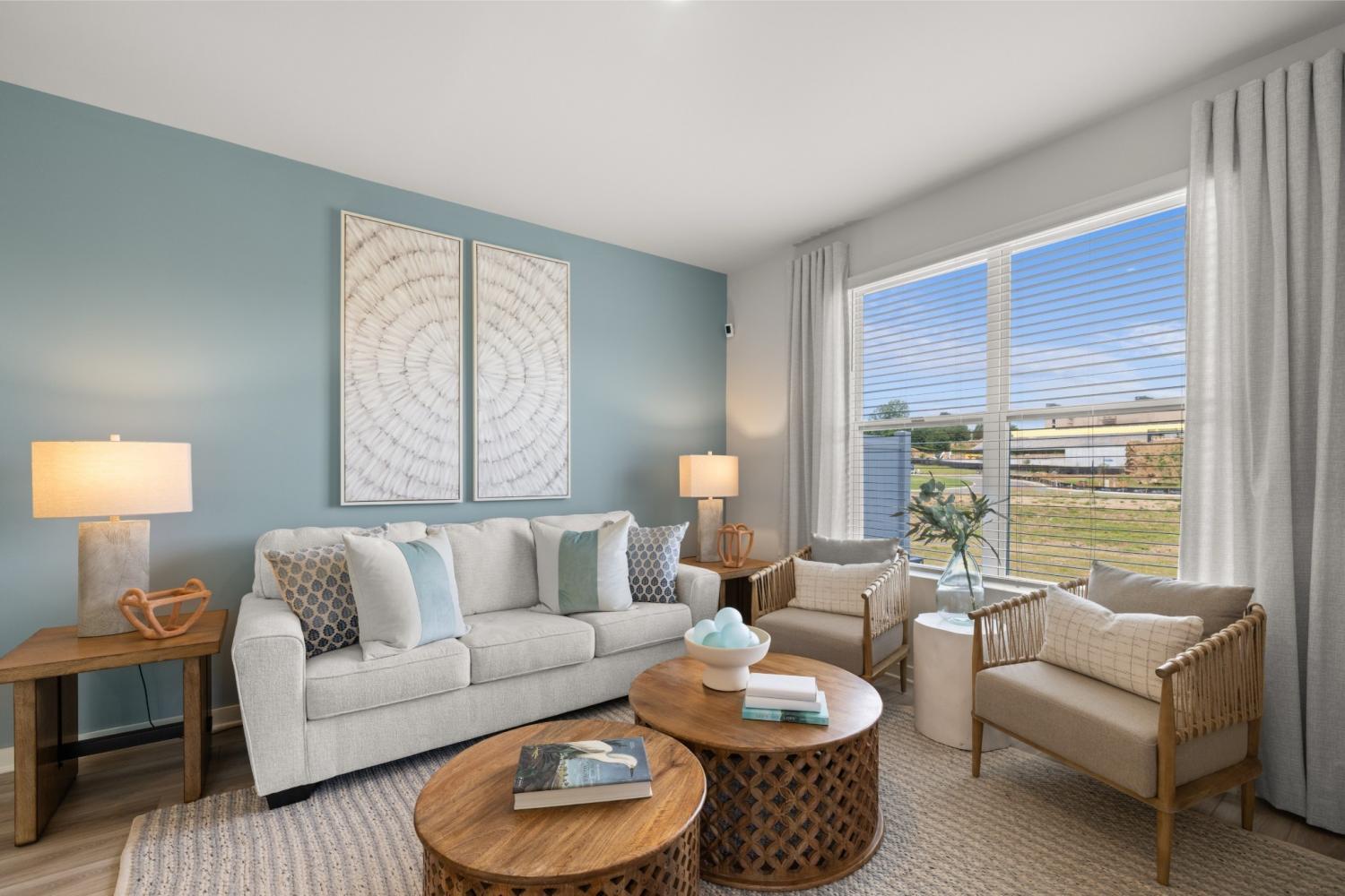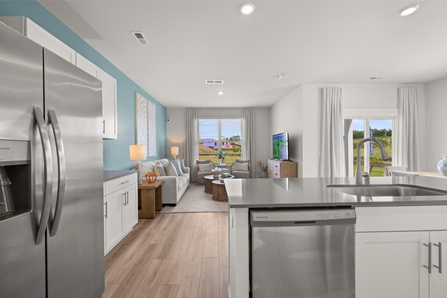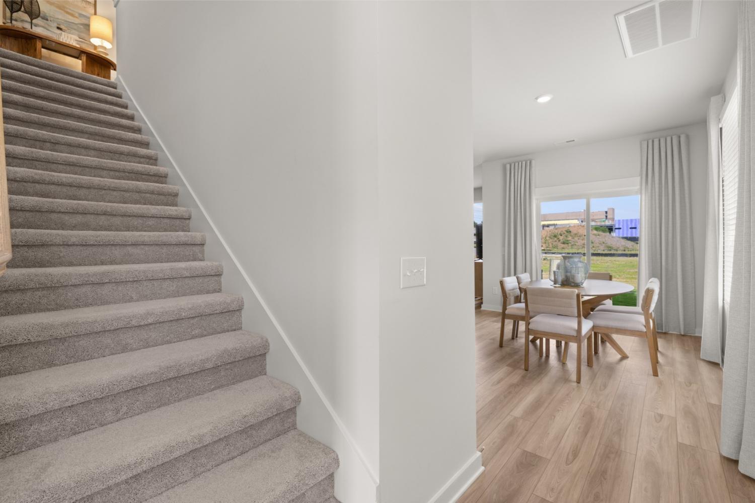This new two-story townhome design combines comfort and style. The first floor features an open-concept layout connecting a living room for shared moments, a dining room for memorable meals and a kitchen for inspired cooks. Nearby sliding glass doors provide access to a covered patio for outdoor enjoyment. On the second floor, two secondary bedrooms and a spacious owner’s suite with a luxe bathroom and large walk-in closet provide restful retreats for family members and overnight guests. *Images from a furnished model of this home. Actual configuration and features may vary.