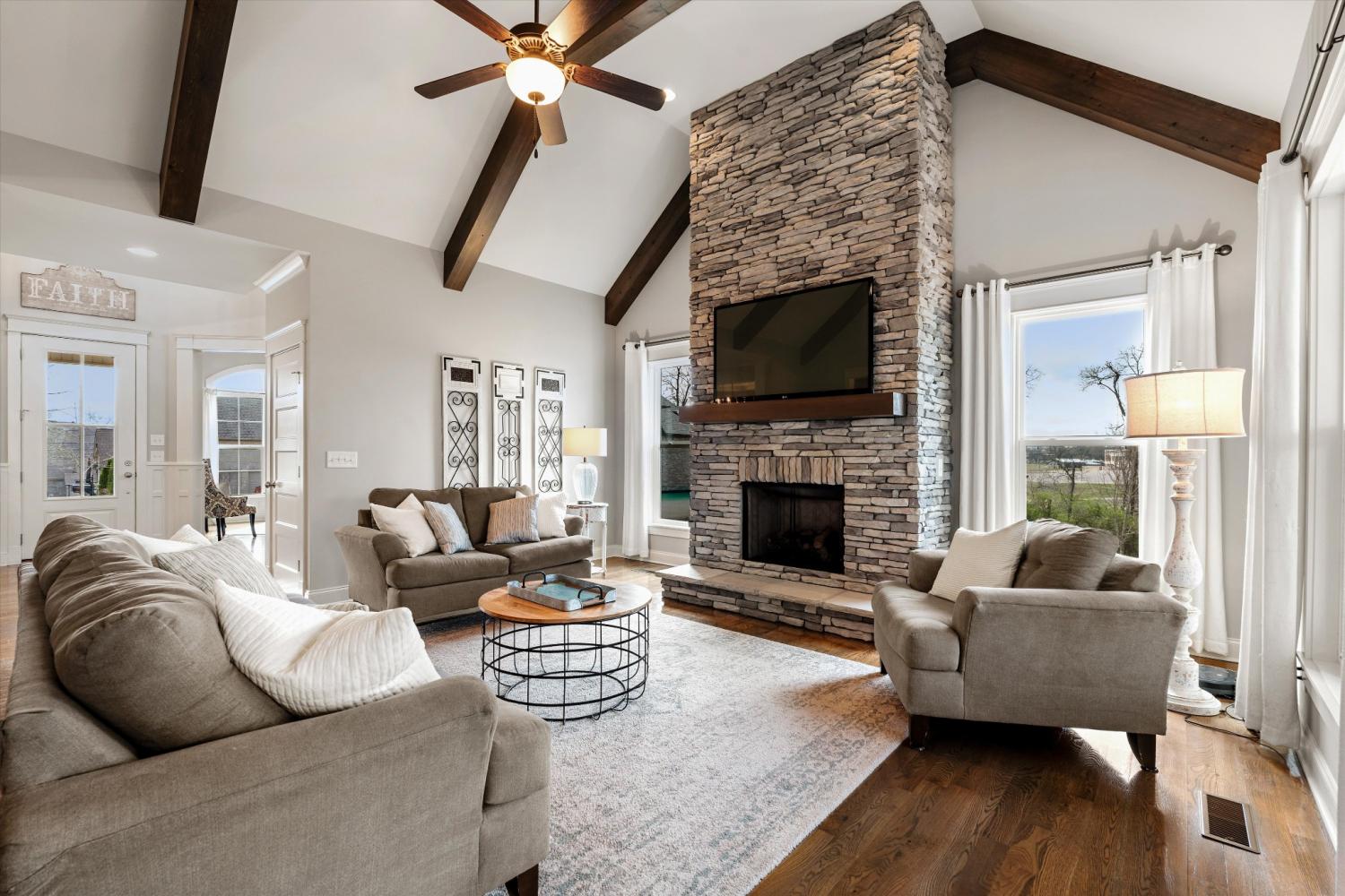 Imagine coming home to a beautifully crafted Eastland Construction Home in the highly sought-after Nichols Vale Community, where Scenic Rolling Hills and Sidewalk-Lined Streets welcome you. As you arrive, the timeless All-Brick exterior, welcoming Front Porch, and 3-car Side-Entry Garage set the tone for the craftsmanship found throughout. Step inside to Gorgeous Hardwood Floors leading into the Great Room, where Soaring Ceilings with Wood Beams and a Stacked Stone Gas Fireplace create an inviting space for gathering. The Open Layout is perfect for hosting, centered around a Standout Kitchen with Quartz Countertops, Gas Cooktop, and a Large Island with extra seating. The Main-Level Primary Suite is a retreat with a Tray Ceiling featuring a Wood Accent, En Suite Bath with Double Vanities and an Oversized Tiled Shower, plus a Spacious Walk-In Closet with Custom Shelving and Private Access to your Laundry Room. Unwind Upstairs in the Expansive Bonus Room Wired for Surround Sound-perfect for movie nights and the ultimate hangout space. Outside, relax on the Covered Back Porch overlooking one of the Larger Lots in the neighborhood featuring a PrivateTree Line. Your summers will be set as you spend sunny afternoons at the Community Pool, evening walks along Scenic Trails, and quick trips to Providence Marketplace just minutes away! *Seller’s offering up to 1% lender credit of the loan amount when buyer uses sellers preferred financing partner.