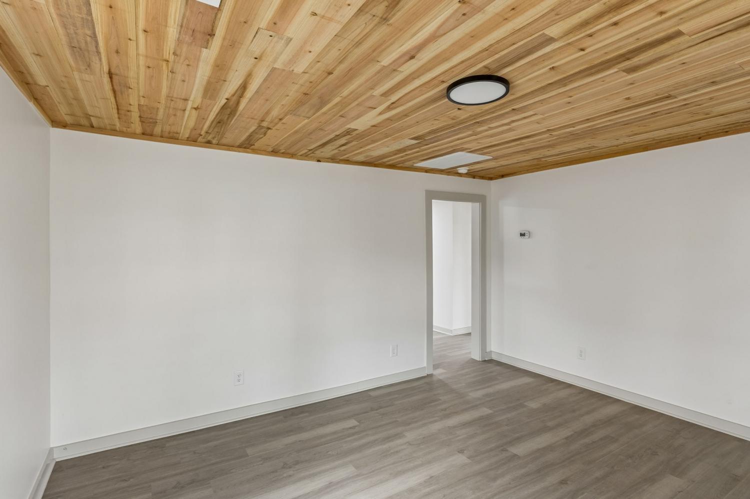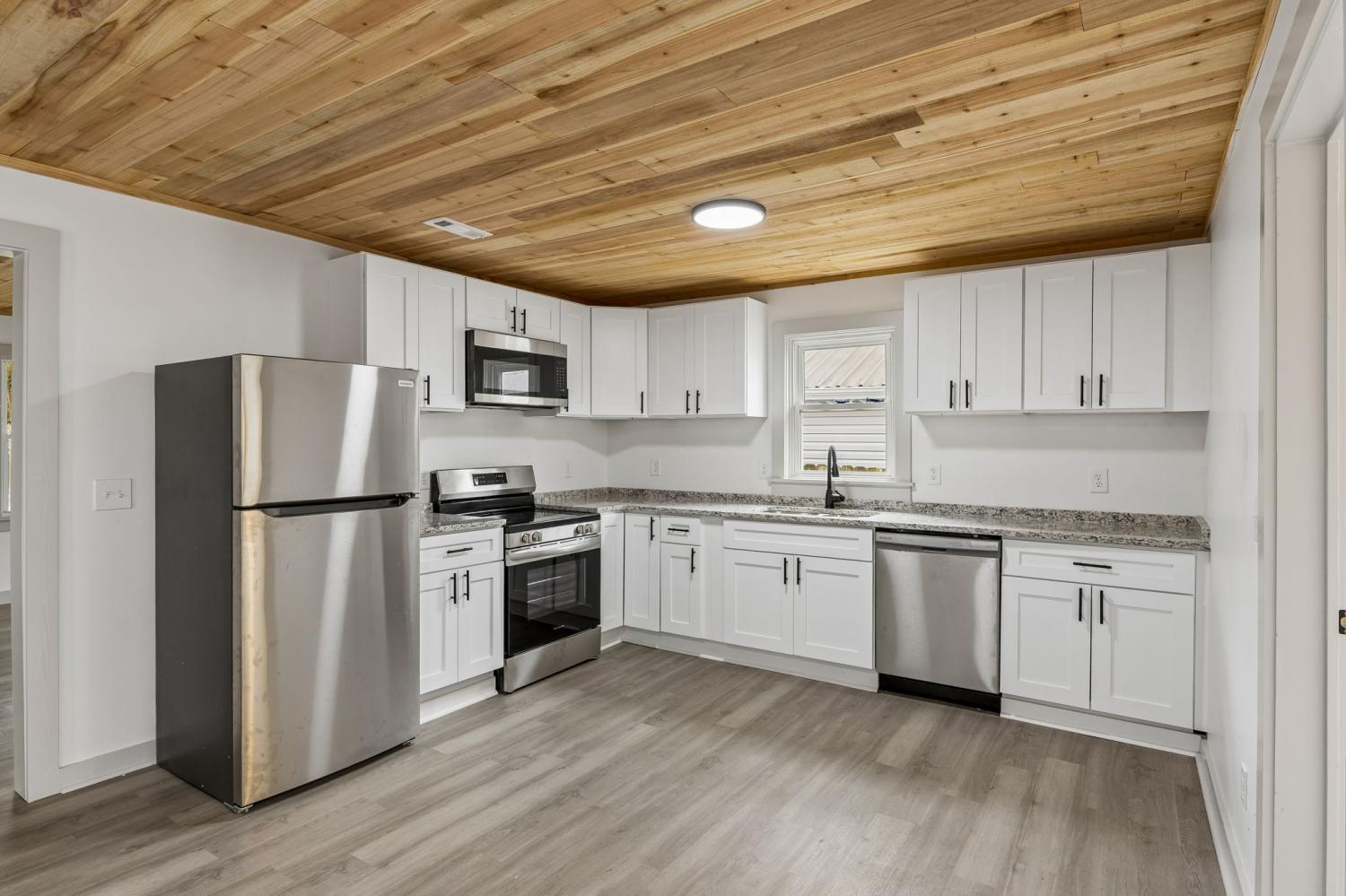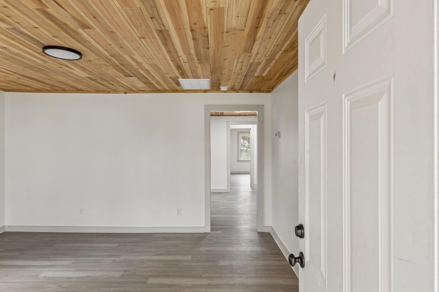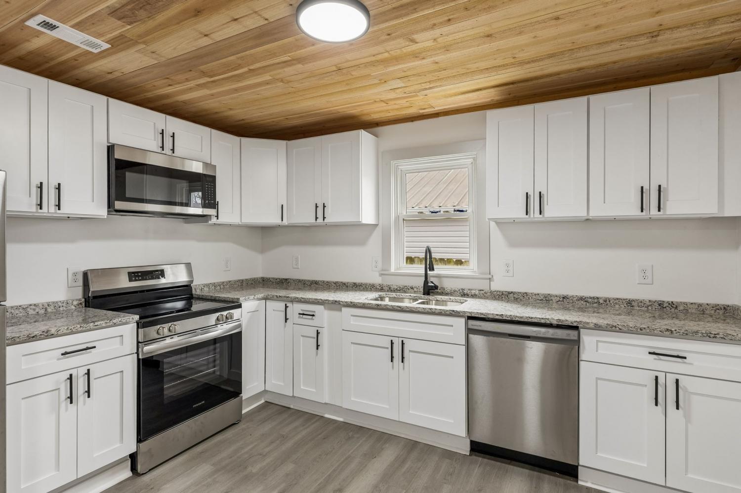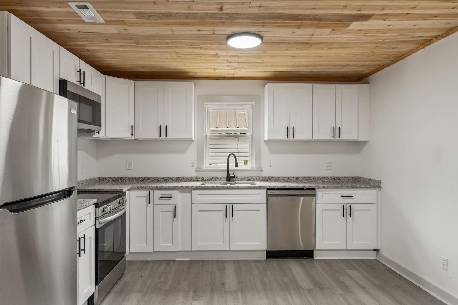 First Month Free with a 13 month lease! Welcome home to this beautifully updated 3 bedroom, 1 bath home offering approximately 1,103 sq ft of comfortable living space. This charming property combines classic curb appeal with modern interior upgrades, making it the perfect place to call home. Step inside to discover a bright and inviting interior featuring fresh paint, durable luxury vinyl plank flooring, and stunning natural wood ceilings that add warmth and character throughout the home. The spacious living room provides plenty of room for relaxing or entertaining guests. The updated kitchen features white shaker-style cabinets, granite-style countertops, stainless steel appliances, and plenty of cabinet space for storage. A dedicated dining area sits just off the kitchen, creating a functional layout for everyday living. This home offers three comfortable bedrooms with good closet space and natural light. The centrally located full bathroom includes updated fixtures and a clean, modern feel. Additional highlights include a separate utility/laundry room, energy-efficient windows, and a practical floor plan that maximizes space. Outside, you'll enjoy a covered front porch perfect for relaxing, along with a large driveway offering ample parking. Conveniently located near local shopping, schools, and restaurants, this home provides both comfort and convenience. Don't miss this opportunity to live in a freshly updated home with modern finishes and classic charm. Schedule your showing today!