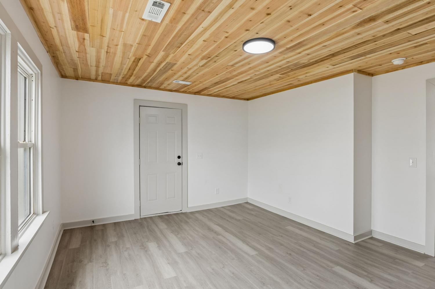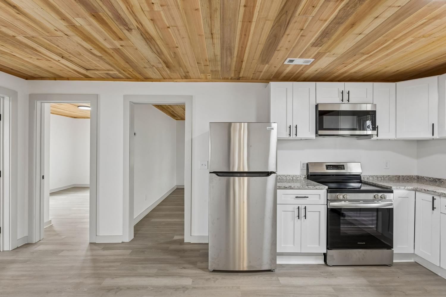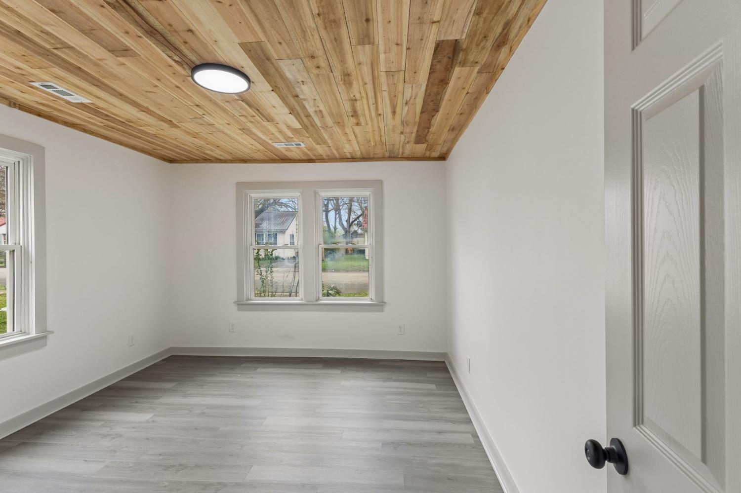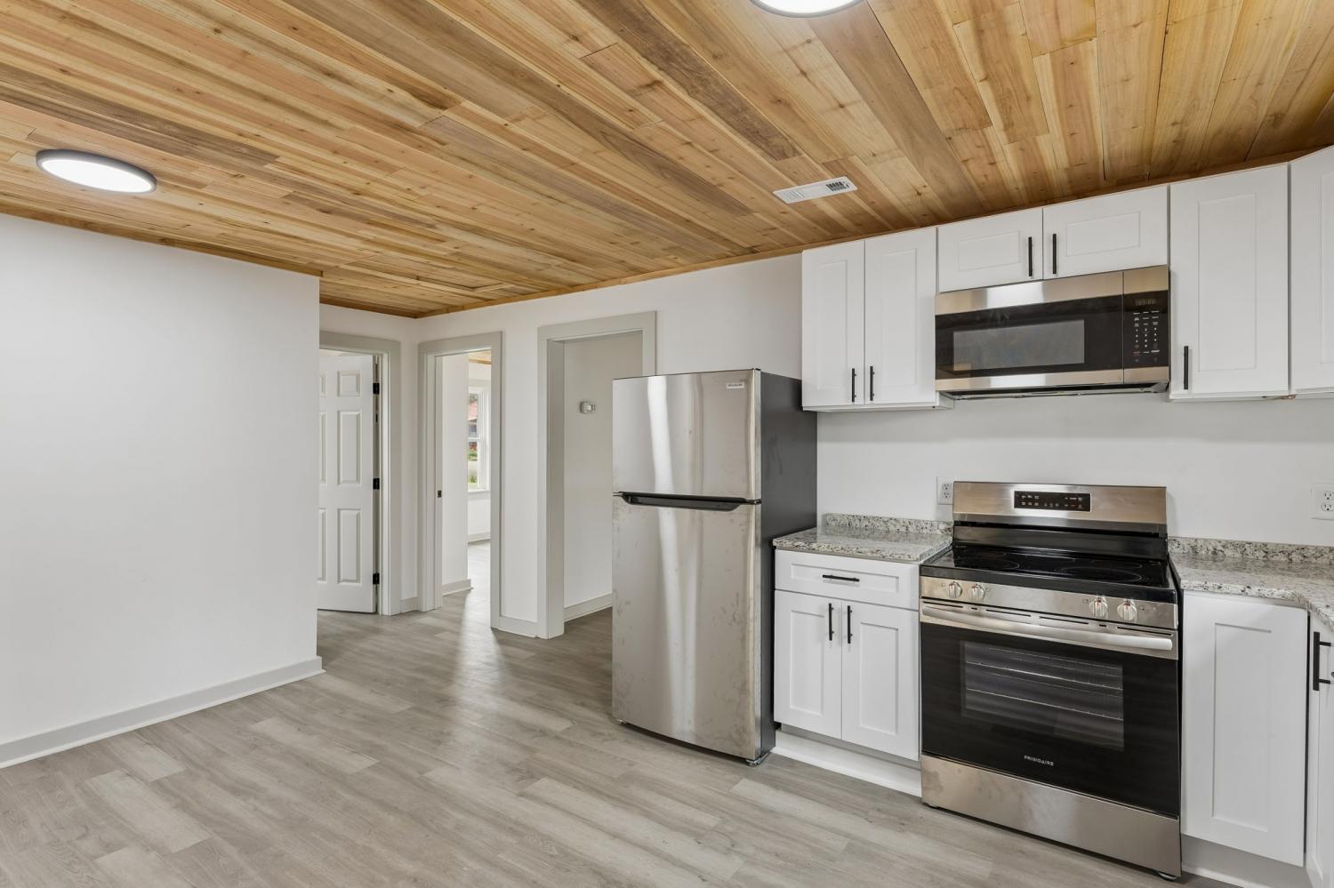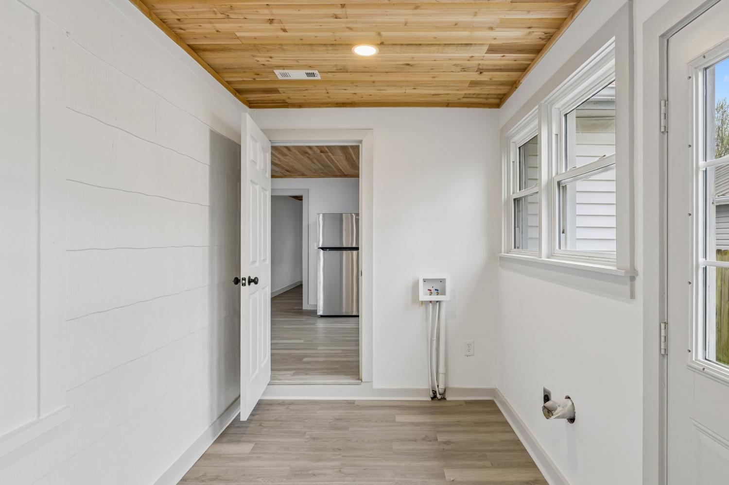 First Month Free with a 13 month lease! Welcome home to this beautifully updated 3 bedroom, 1 bath home offering approximately 1,103 sq ft of comfortable living space. This charming property combines classic curb appeal with modern interior upgrades, making it the perfect place to call home. Step inside to discover a bright and inviting interior featuring fresh paint, durable luxury vinyl plank flooring, and stunning natural wood ceilings that add warmth and character throughout the home. The spacious living room provides plenty of room for relaxing or entertaining guests. The updated kitchen features white shaker-style cabinets, granite-style countertops, stainless steel appliances, and plenty of cabinet space for storage. A dedicated dining area sits just off the kitchen, creating a functional layout for everyday living. This home offers three comfortable bedrooms with good closet space and natural light. The centrally located full bathroom includes updated fixtures and a clean, modern feel. Additional highlights include a separate utility/laundry room, energy-efficient windows, and a practical floor plan that maximizes space. Outside, you'll enjoy a covered front porch perfect for relaxing, along with a large driveway offering ample parking. Conveniently located near local shopping, schools, and restaurants, this home provides both comfort and convenience. Don't miss this opportunity to live in a freshly updated home with modern finishes and classic charm. Schedule your showing today!