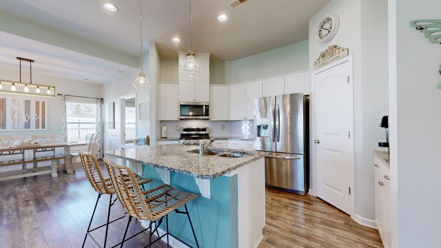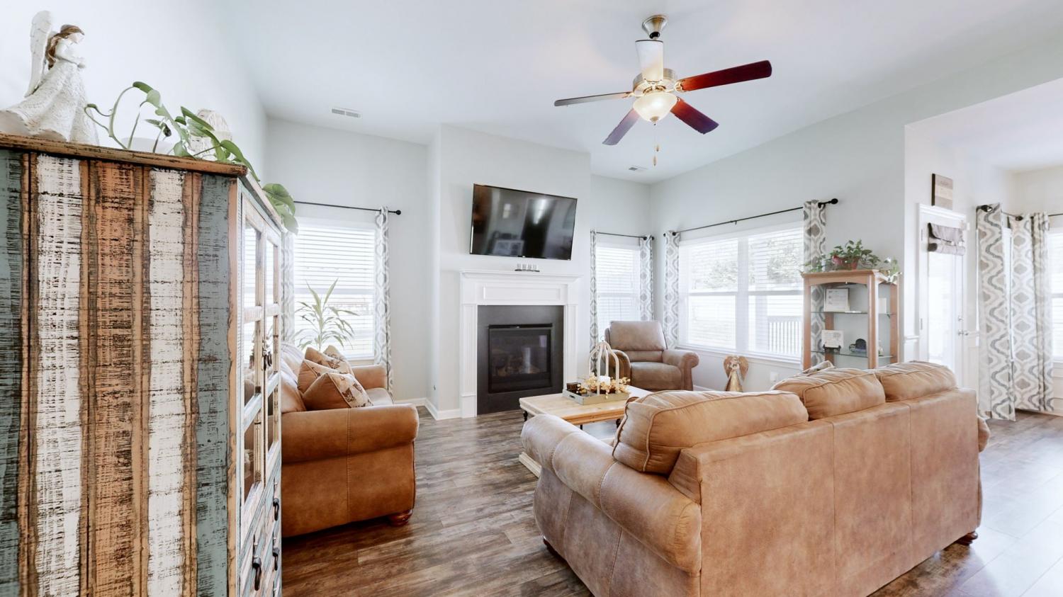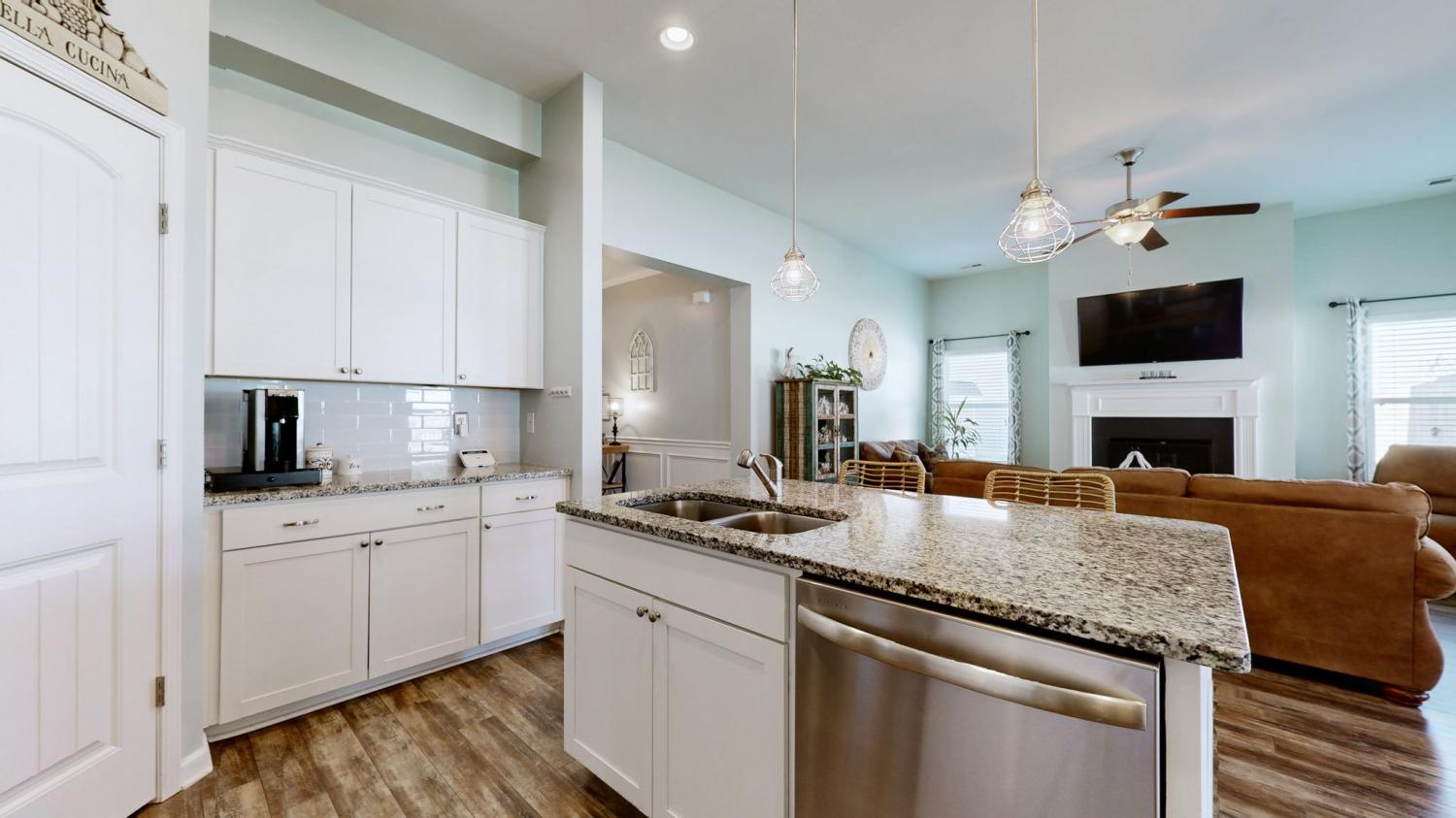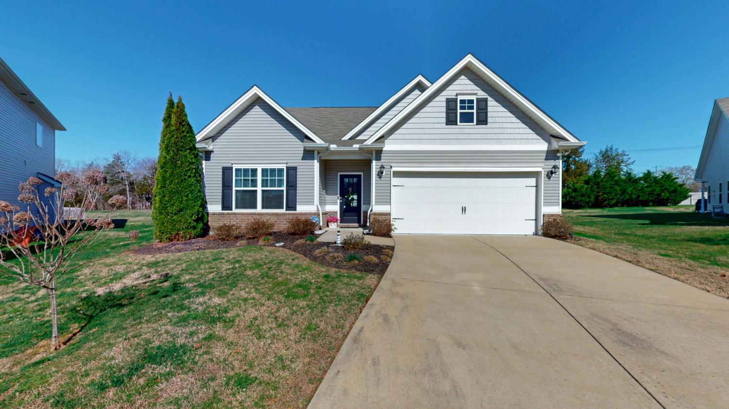 Beautifully appointed, single-level cottage-style home in the highly desirable Cobblestone Village community. Charming curb appeal features a tasteful blend of brick, lap, and shingle siding. A covered front porch and an impressive foyer create a welcoming first impression for your guests. The spacious great room and kitchen boast 10-foot ceilings and a cozy gas fireplace—perfect for quiet evenings at home or effortless entertaining. The kitchen offers granite countertops, a large island, abundant cabinetry, and a walk-in pantry. Enjoy relaxing evenings on the covered back porch overlooking your fenced backyard. This thoughtful split-bedroom floor plan places the two secondary bedrooms and their shared full bath toward the front of the home, while the private primary suite is tucked away at the rear. The primary bedroom features a tray ceiling, and the en-suite bathroom includes an oversized shower, double sinks, and a private water closet. A generous walk-in closet conveniently connects directly to the laundry room. Additional highlights include a two-car garage with a newer, high-end epoxy floor finish. Close to new Publix, Kroger, Crossings Shopping Center, Movie Theater, and so much more! Easy commute to Franklin, Nashville / BNA.