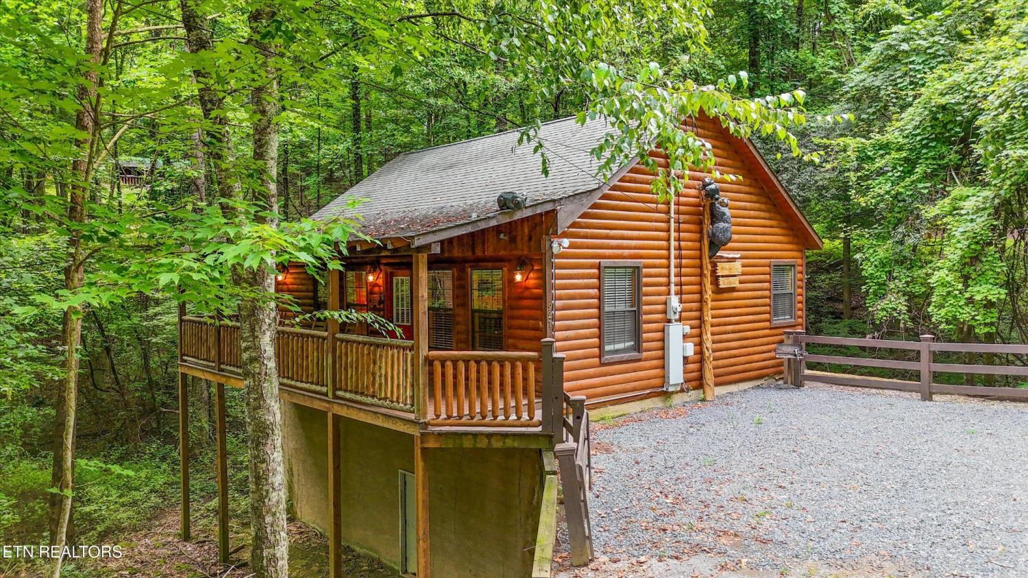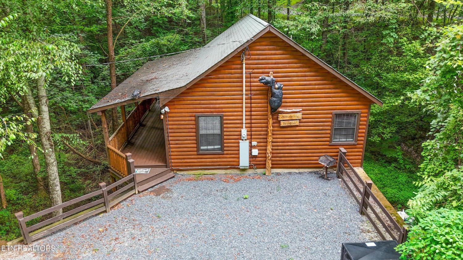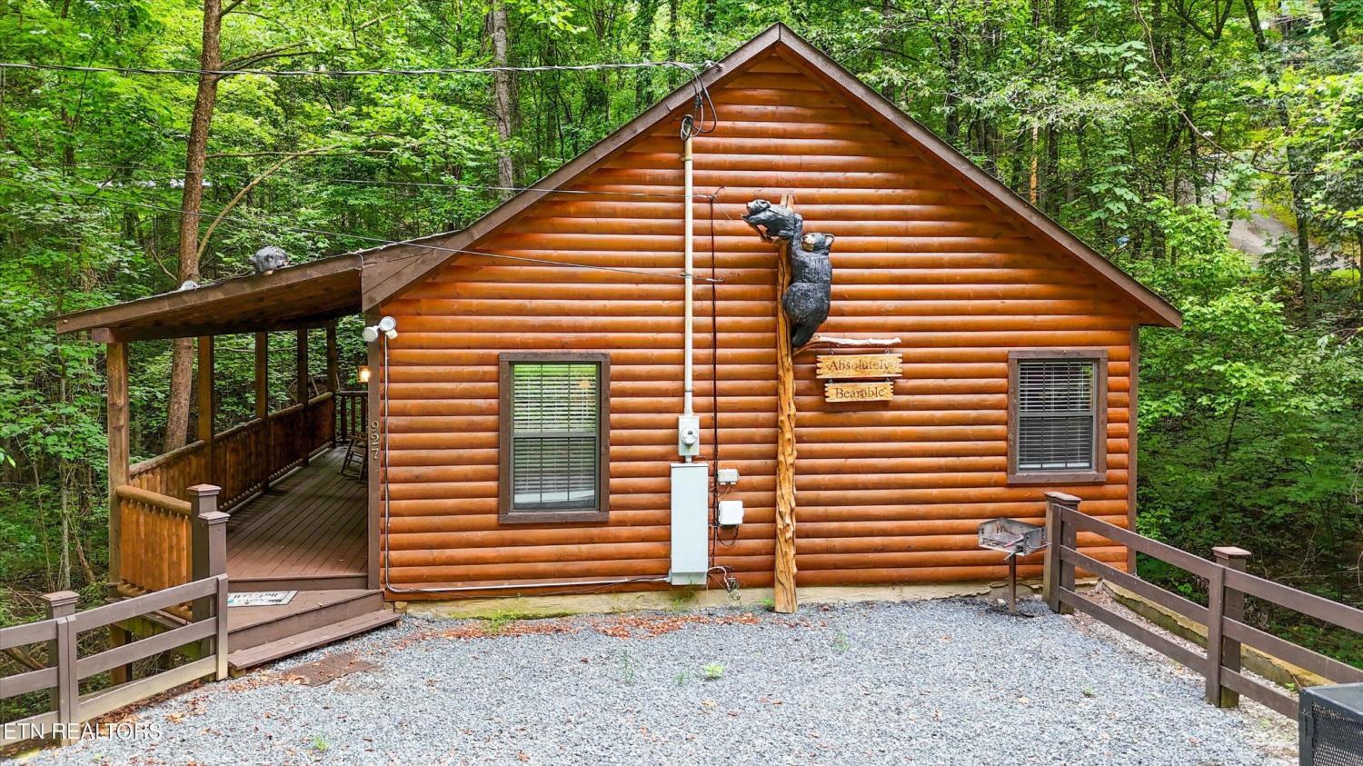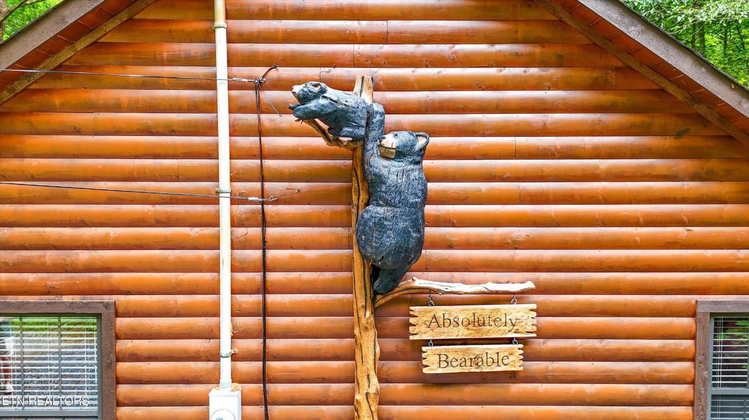 Welcome to Absolutely Bearable -- the charming bear-themed cabin in the Sky Harbor subdivision that's as cute as its name! From the moment you arrive, you'll be greeted by the wooden bears peeking over the roof at the entrance and the two more keeping watch along the side of the cabin. Freshly graveled parking makes for an easy arrival a long with seeing the recently stained cabin and deck, and once inside, you'll notice the kitchen and bathroom/laundry room have brand new flooring for a fresh, updated feel. Perfect for couples and honeymooners, this cozy getaway is filled with personality. Challenge your sweetheart to a game of pool with the 'Rat Pack' looking on from their spot above the table -- it's a playful touch that guests adore. Out back, the private deck is all about relaxation, featuring a bubbling hot tub surrounded by nothing but peaceful wooded views. Whether you're here for rental revenue, fun, or just a quiet escape, Absolutely Bearable is the kind of cabin that makes you smile from the moment you arrive.