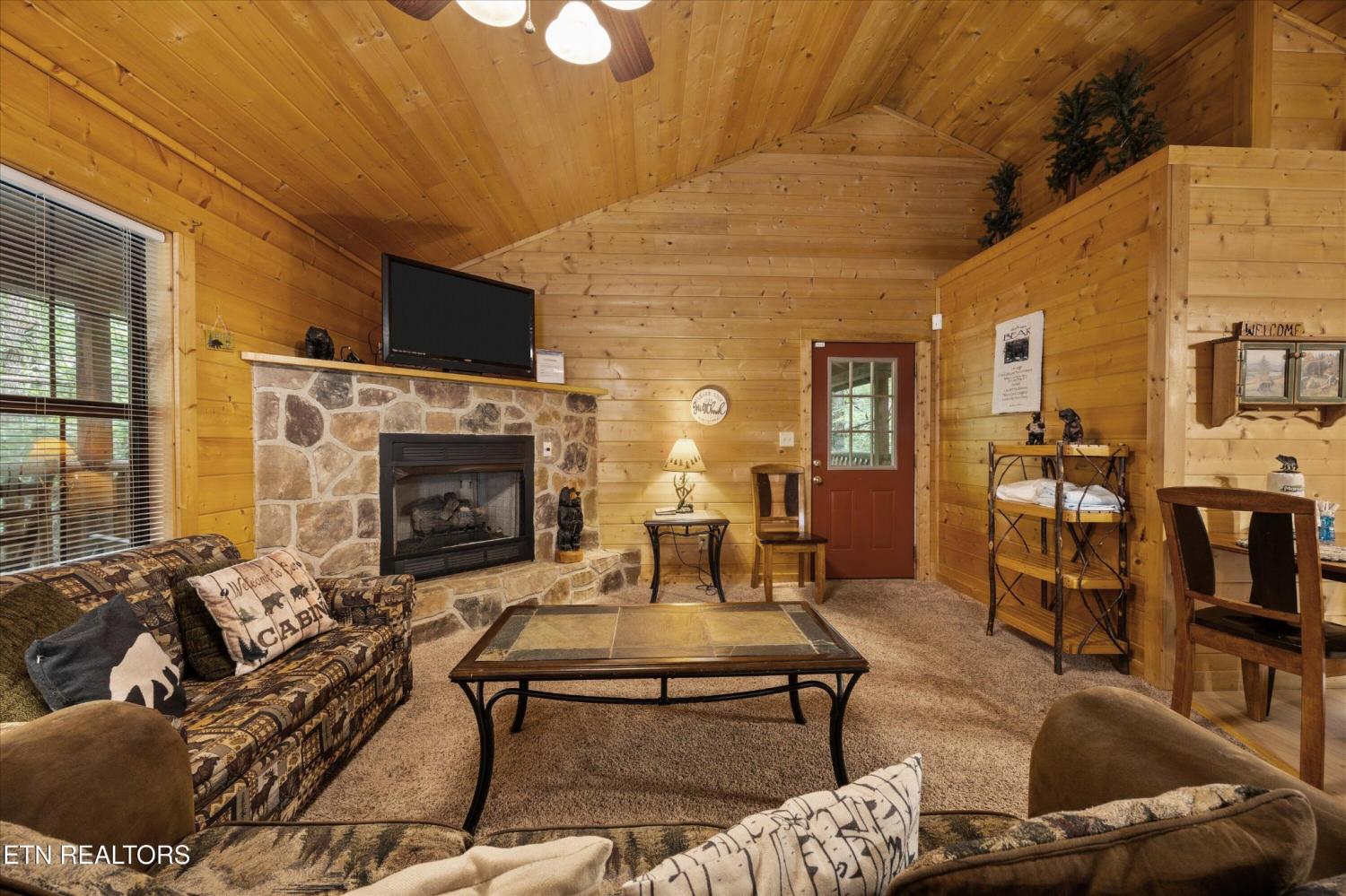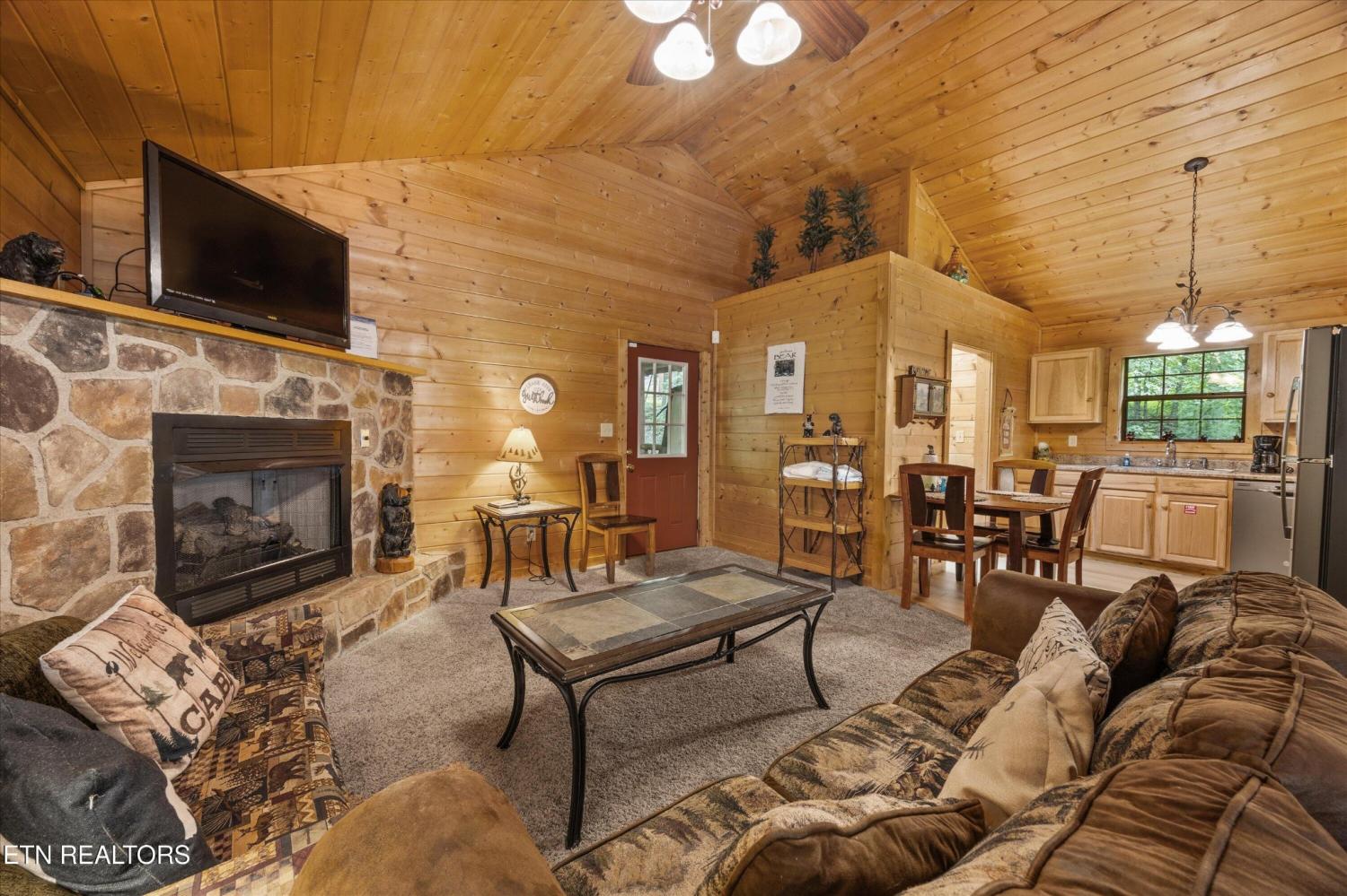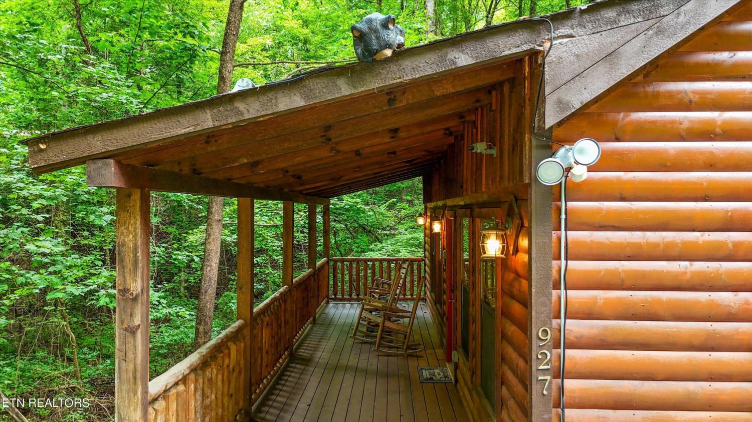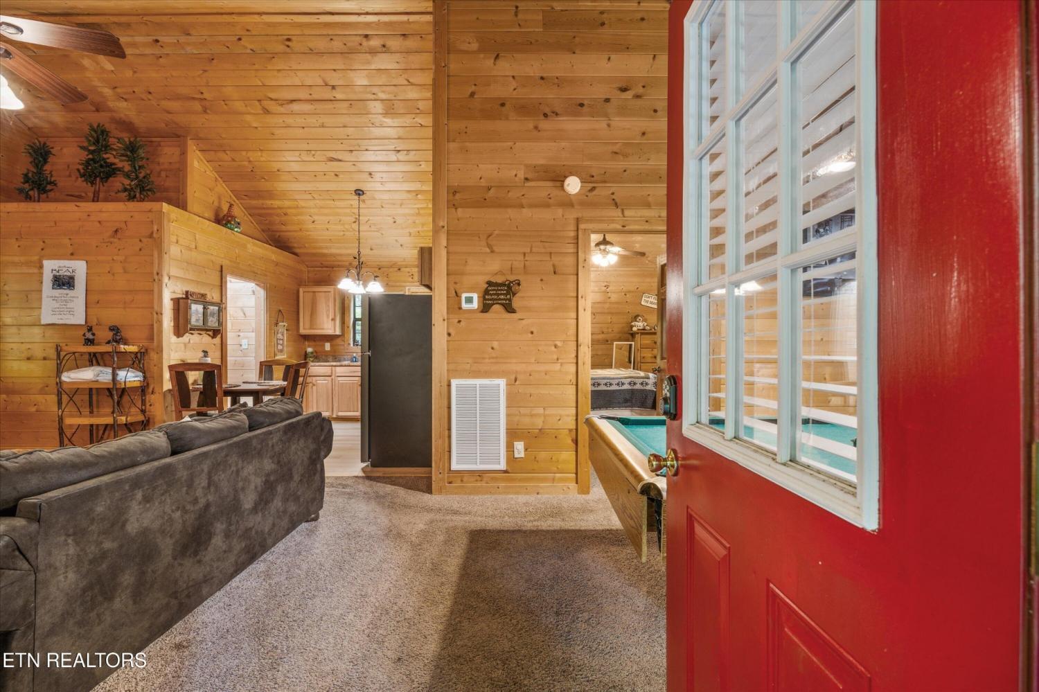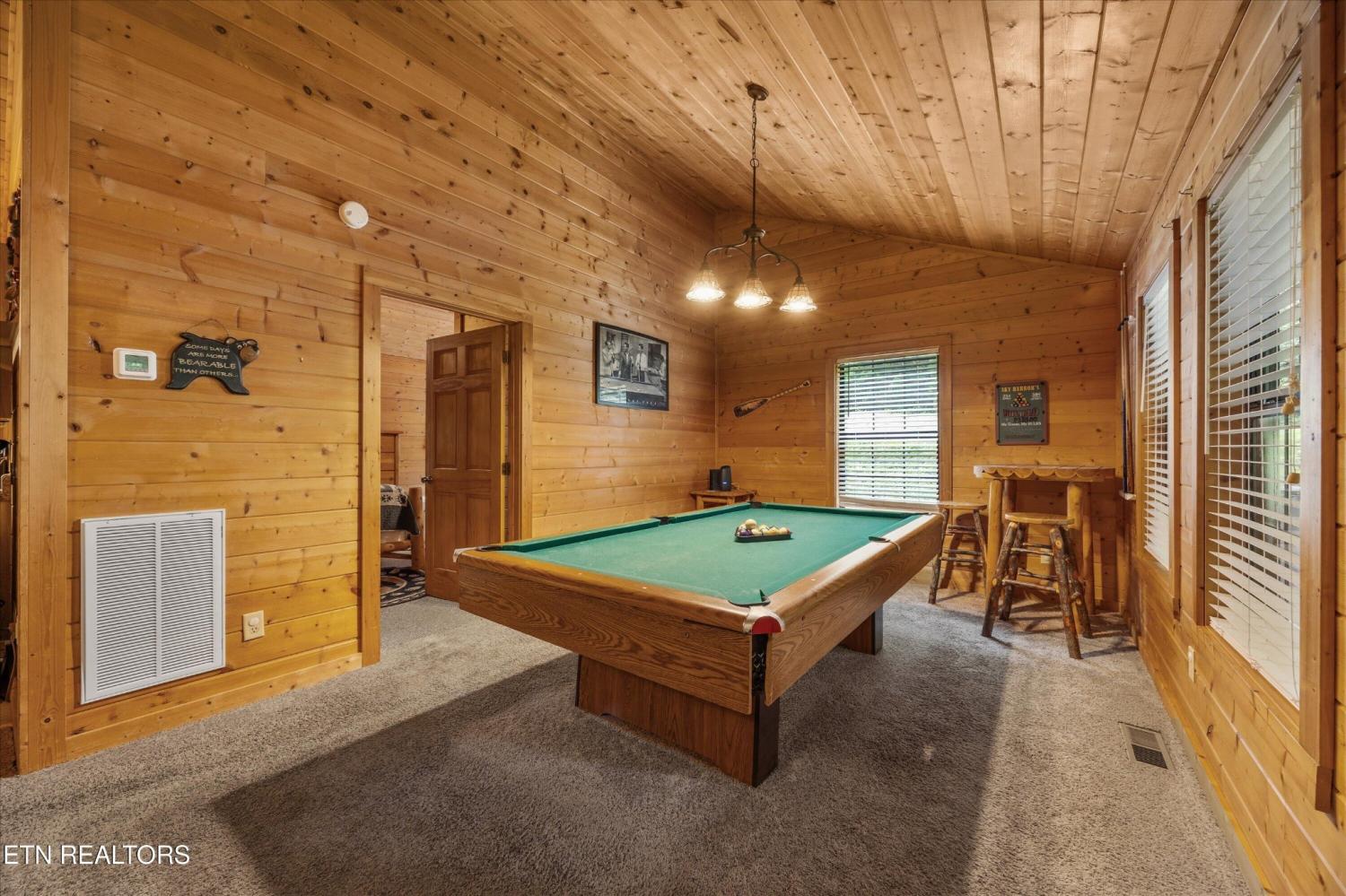 Welcome to Absolutely Bearable -- the charming bear-themed cabin in the Sky Harbor subdivision that's as cute as its name! From the moment you arrive, you'll be greeted by the wooden bears peeking over the roof at the entrance and the two more keeping watch along the side of the cabin. Freshly graveled parking makes for an easy arrival a long with seeing the recently stained cabin and deck, and once inside, you'll notice the kitchen and bathroom/laundry room have brand new flooring for a fresh, updated feel. Perfect for couples and honeymooners, this cozy getaway is filled with personality. Challenge your sweetheart to a game of pool with the 'Rat Pack' looking on from their spot above the table -- it's a playful touch that guests adore. Out back, the private deck is all about relaxation, featuring a bubbling hot tub surrounded by nothing but peaceful wooded views. Whether you're here for rental revenue, fun, or just a quiet escape, Absolutely Bearable is the kind of cabin that makes you smile from the moment you arrive.