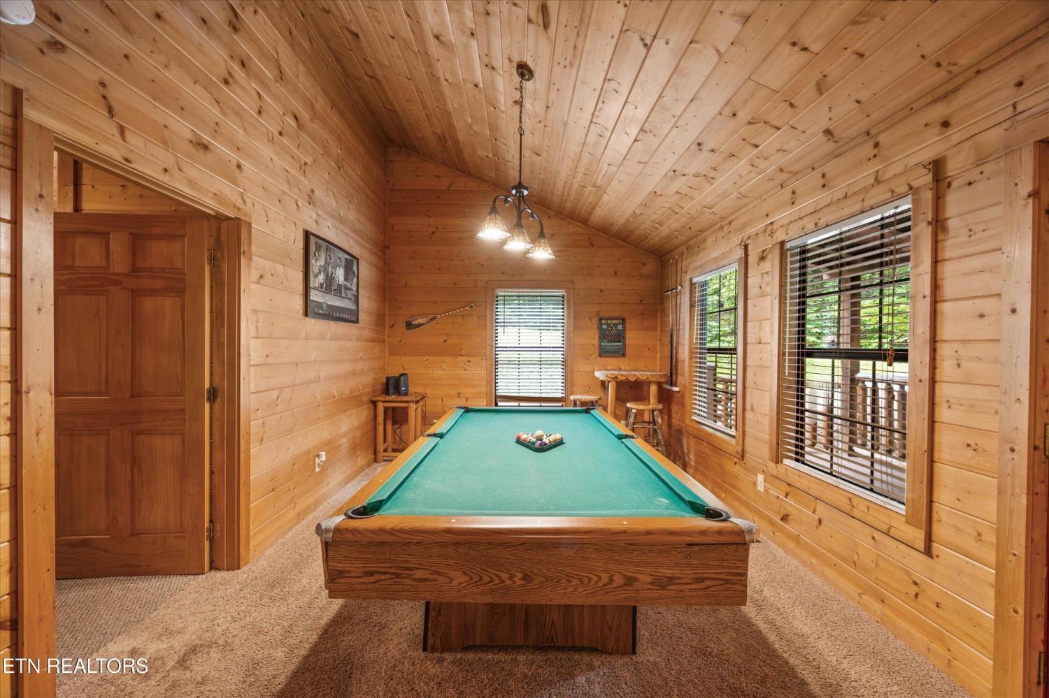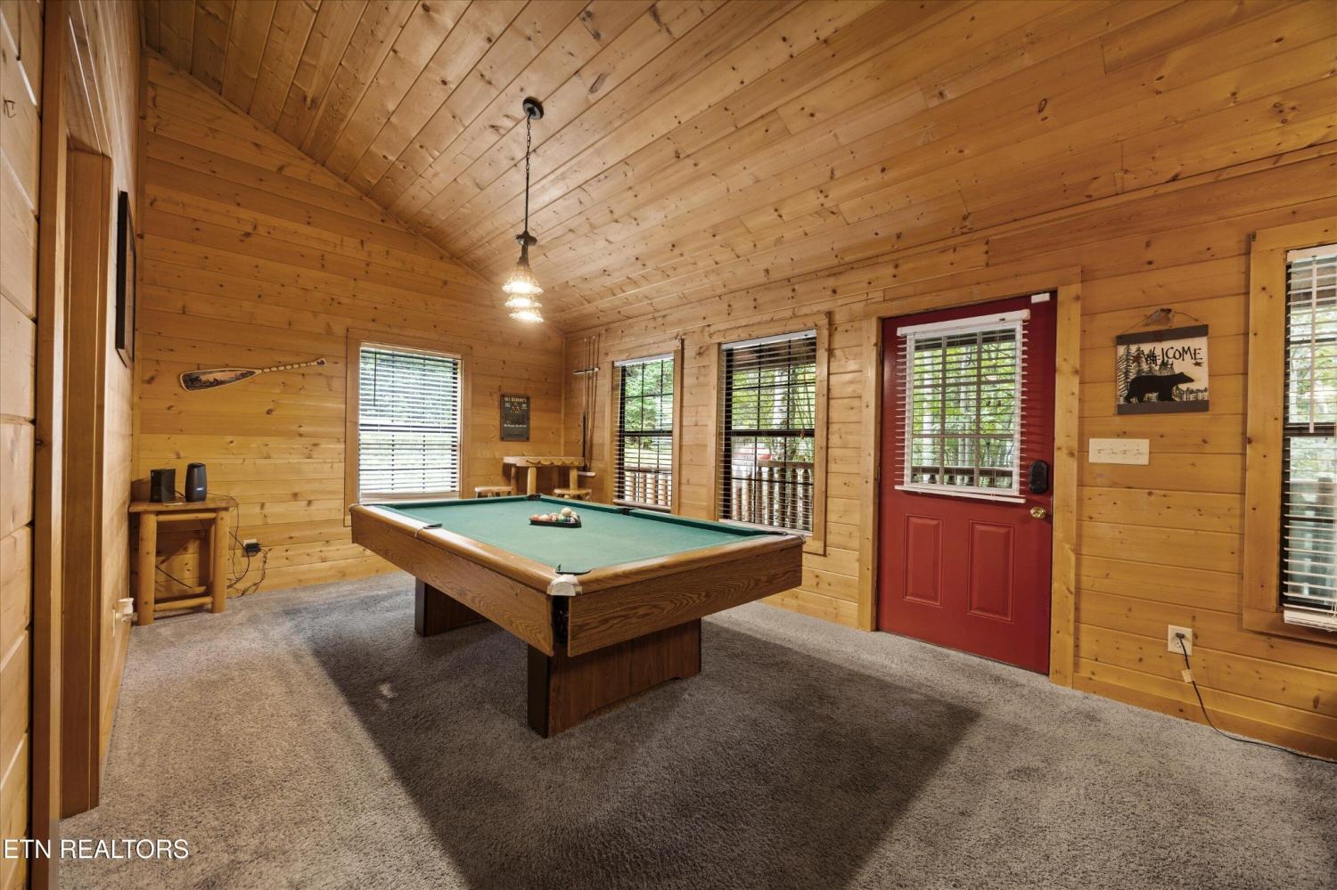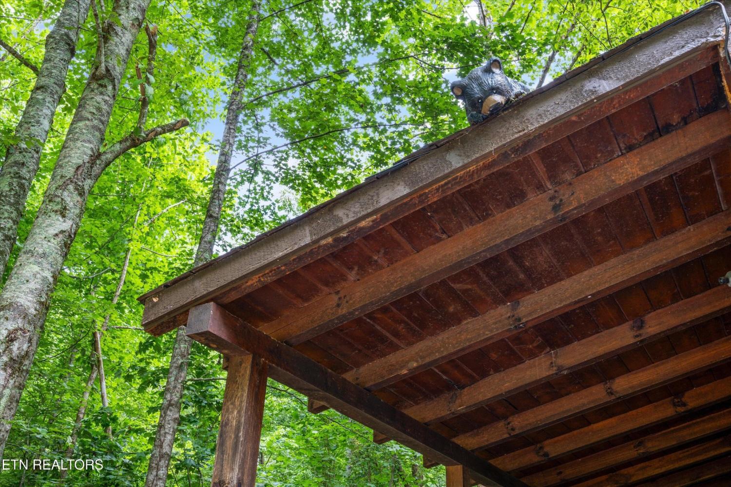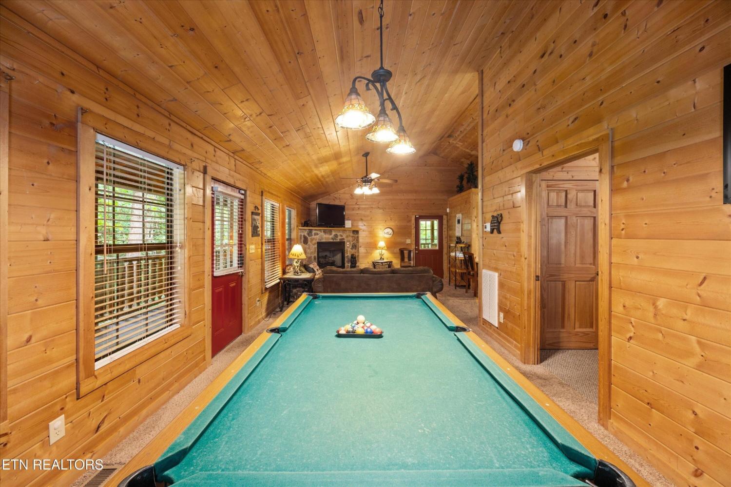 Welcome to Absolutely Bearable -- the charming bear-themed cabin in the Sky Harbor subdivision that's as cute as its name! From the moment you arrive, you'll be greeted by the wooden bears peeking over the roof at the entrance and the two more keeping watch along the side of the cabin. Freshly graveled parking makes for an easy arrival a long with seeing the recently stained cabin and deck, and once inside, you'll notice the kitchen and bathroom/laundry room have brand new flooring for a fresh, updated feel. Perfect for couples and honeymooners, this cozy getaway is filled with personality. Challenge your sweetheart to a game of pool with the 'Rat Pack' looking on from their spot above the table -- it's a playful touch that guests adore. Out back, the private deck is all about relaxation, featuring a bubbling hot tub surrounded by nothing but peaceful wooded views. Whether you're here for rental revenue, fun, or just a quiet escape, Absolutely Bearable is the kind of cabin that makes you smile from the moment you arrive.