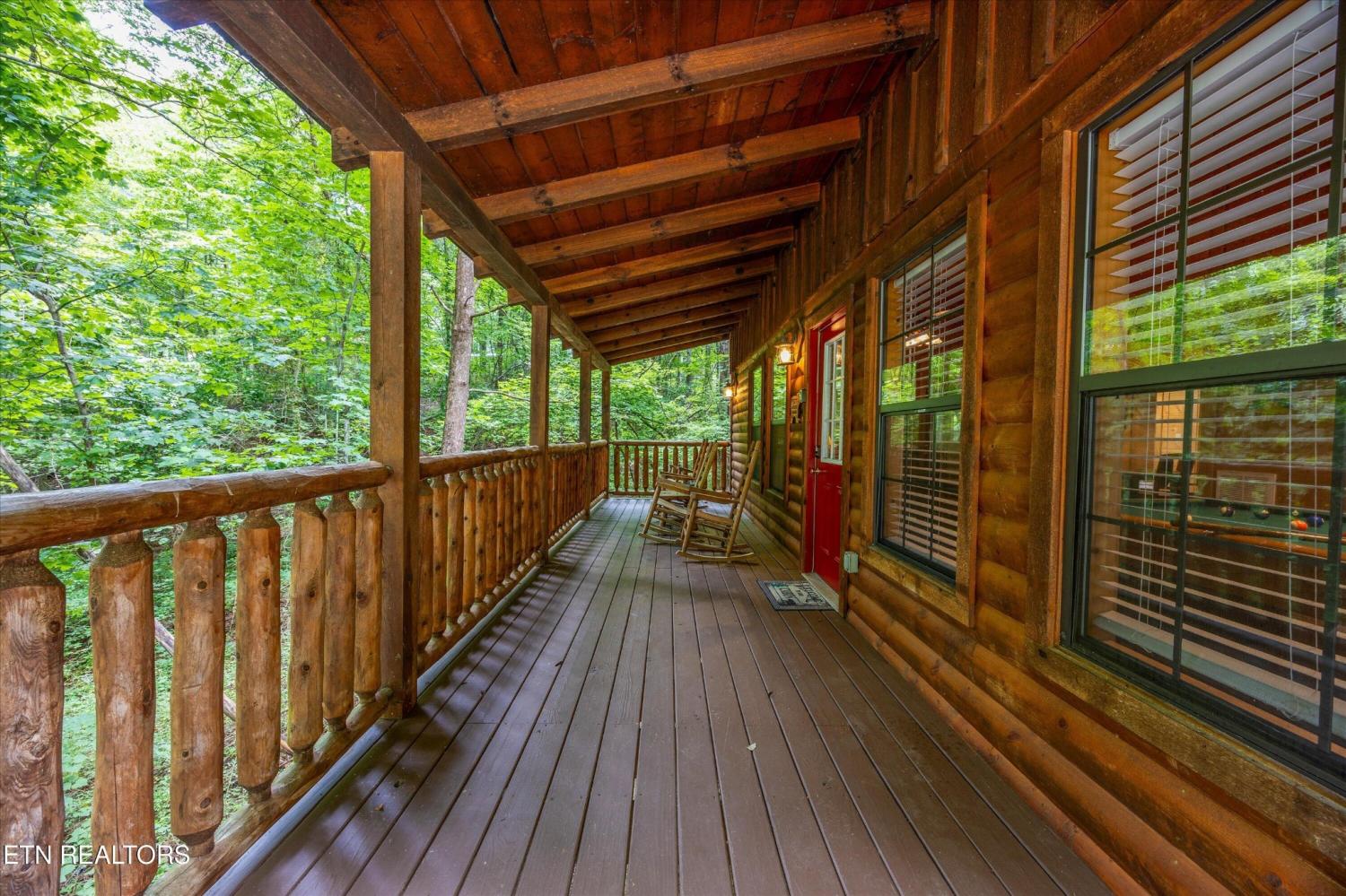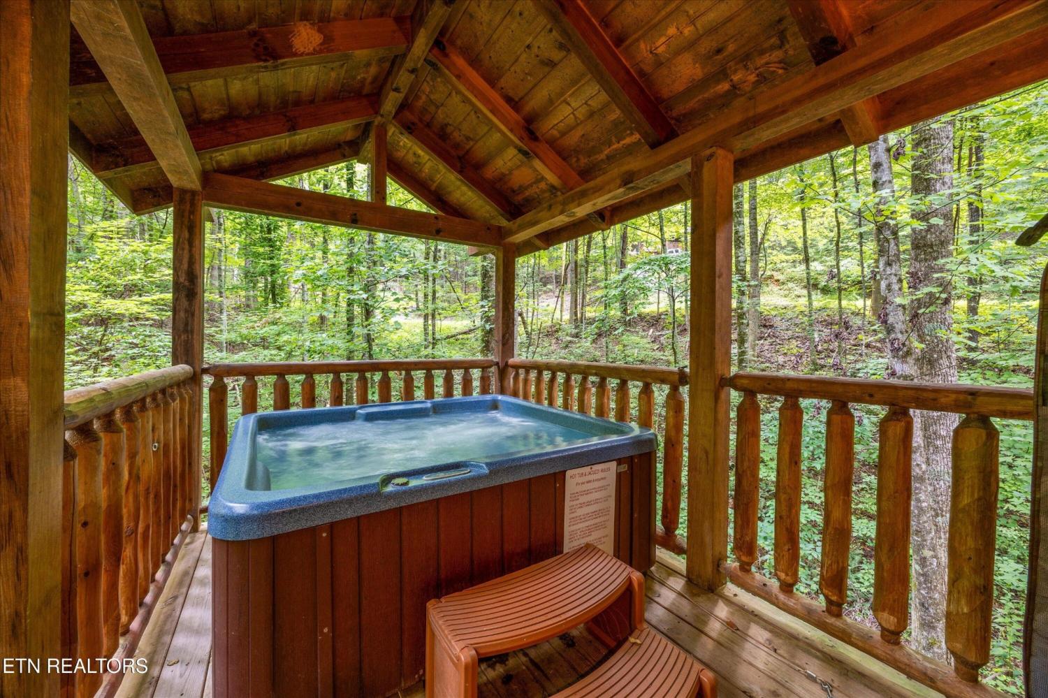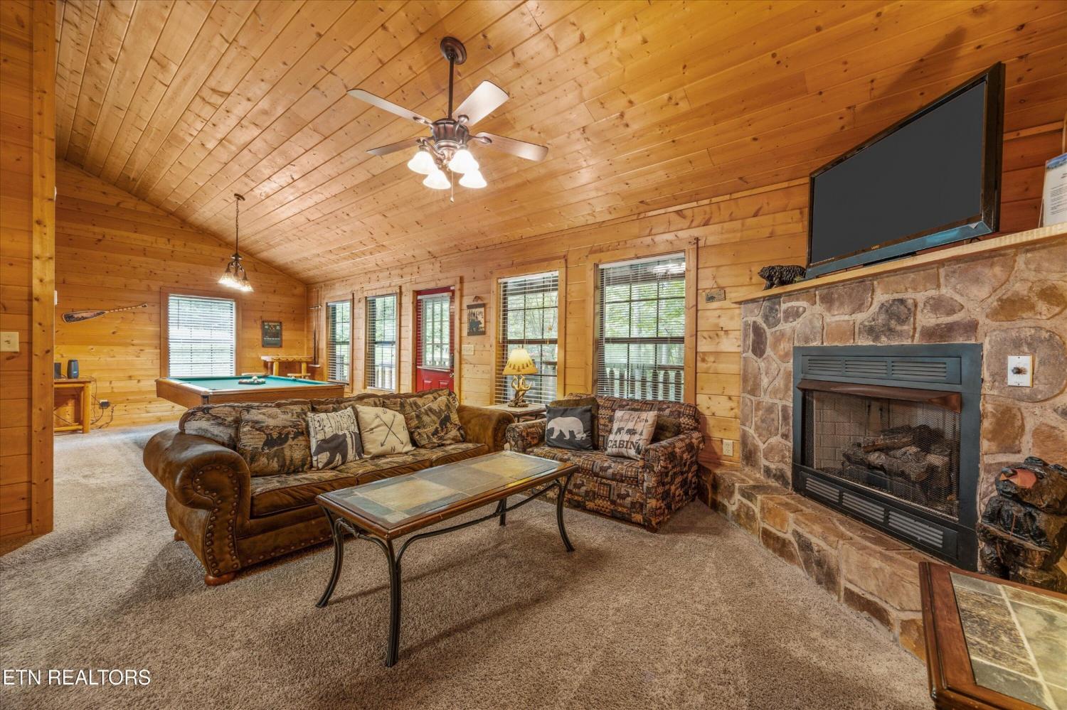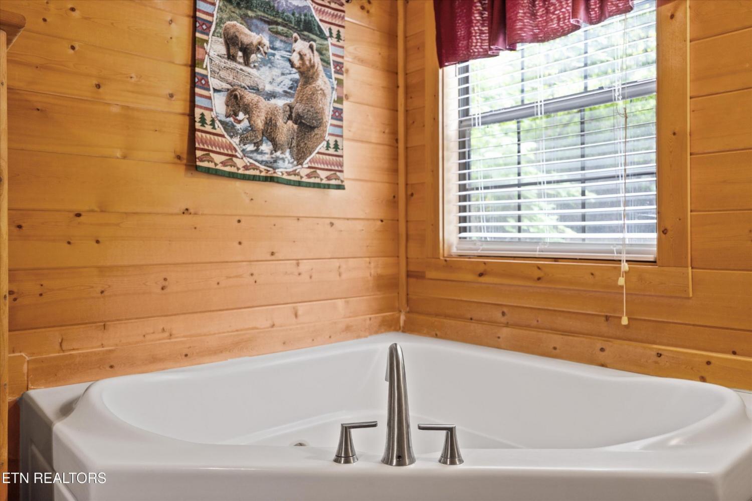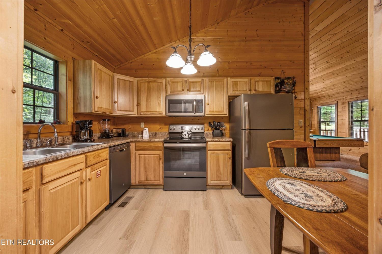 Welcome to Absolutely Bearable -- the charming bear-themed cabin in the Sky Harbor subdivision that's as cute as its name! From the moment you arrive, you'll be greeted by the wooden bears peeking over the roof at the entrance and the two more keeping watch along the side of the cabin. Freshly graveled parking makes for an easy arrival a long with seeing the recently stained cabin and deck, and once inside, you'll notice the kitchen and bathroom/laundry room have brand new flooring for a fresh, updated feel. Perfect for couples and honeymooners, this cozy getaway is filled with personality. Challenge your sweetheart to a game of pool with the 'Rat Pack' looking on from their spot above the table -- it's a playful touch that guests adore. Out back, the private deck is all about relaxation, featuring a bubbling hot tub surrounded by nothing but peaceful wooded views. Whether you're here for rental revenue, fun, or just a quiet escape, Absolutely Bearable is the kind of cabin that makes you smile from the moment you arrive.