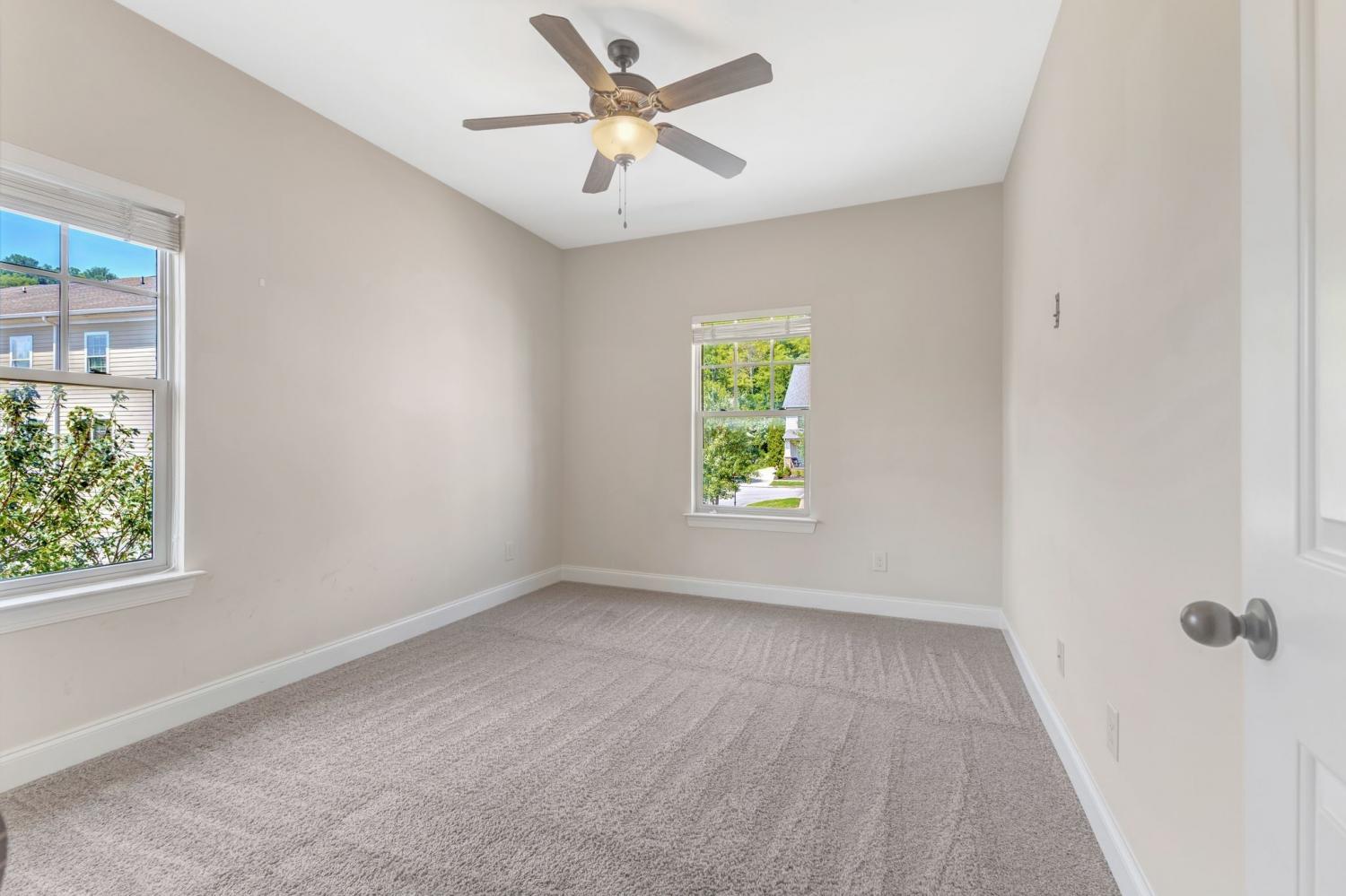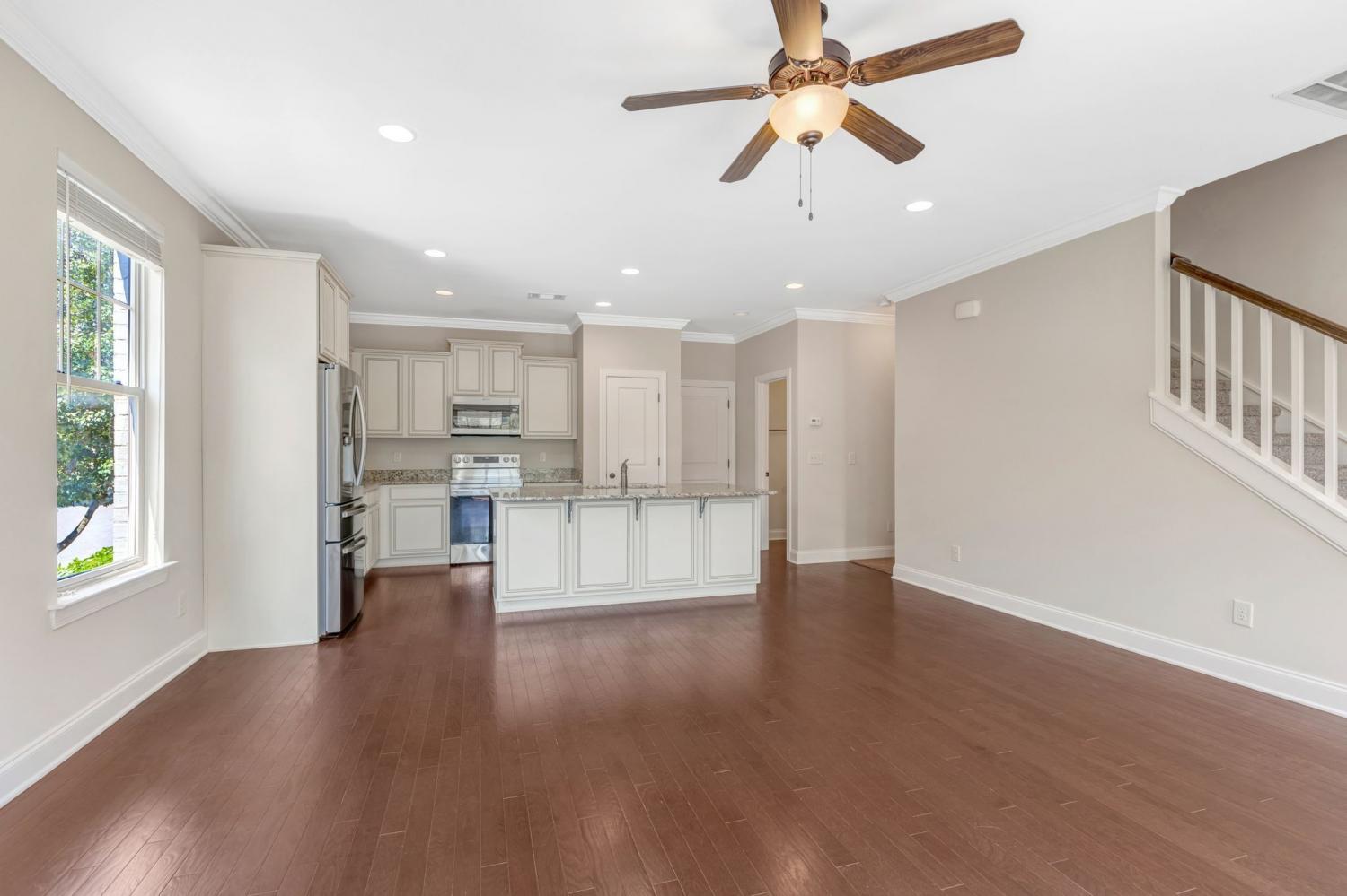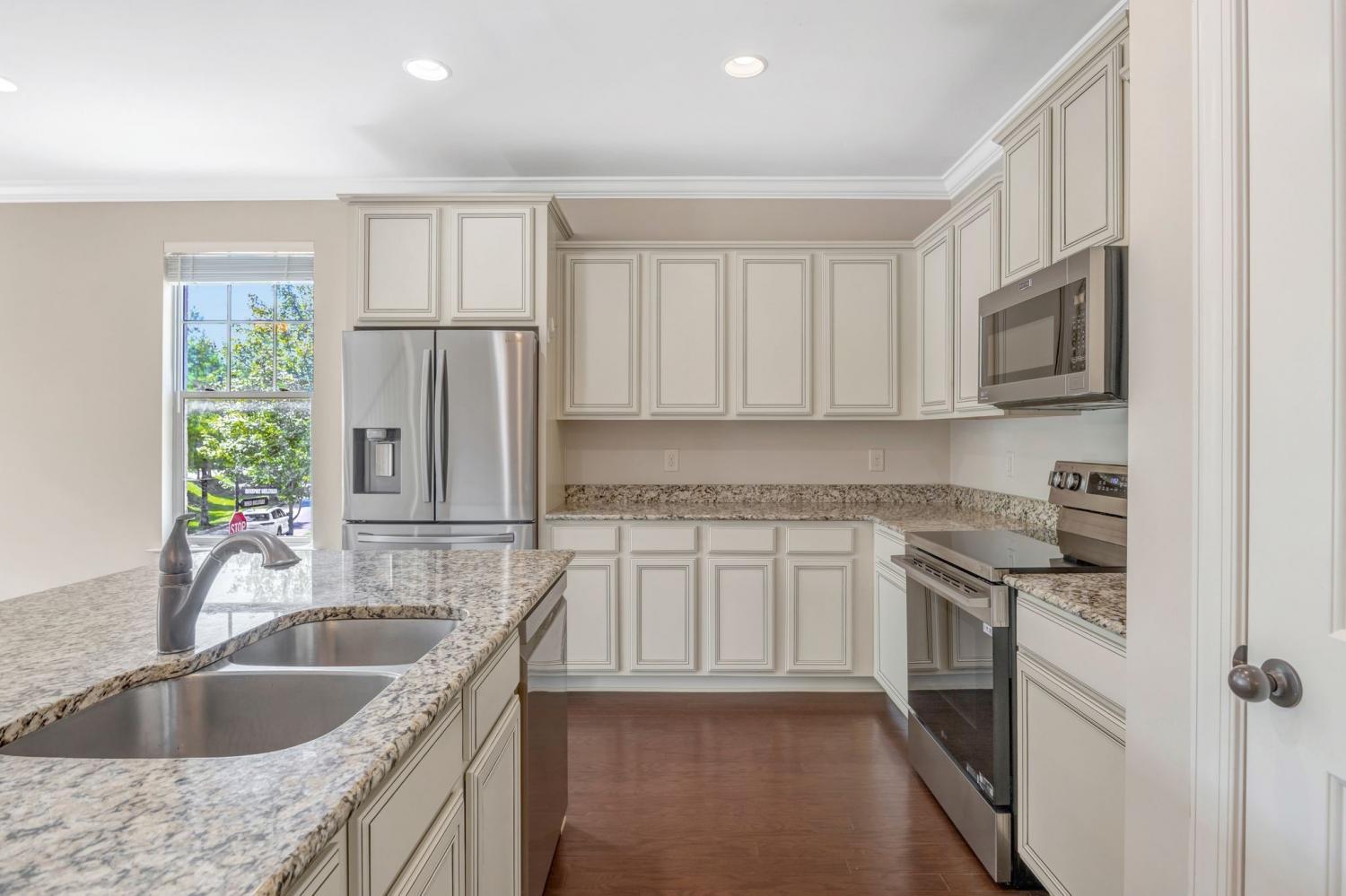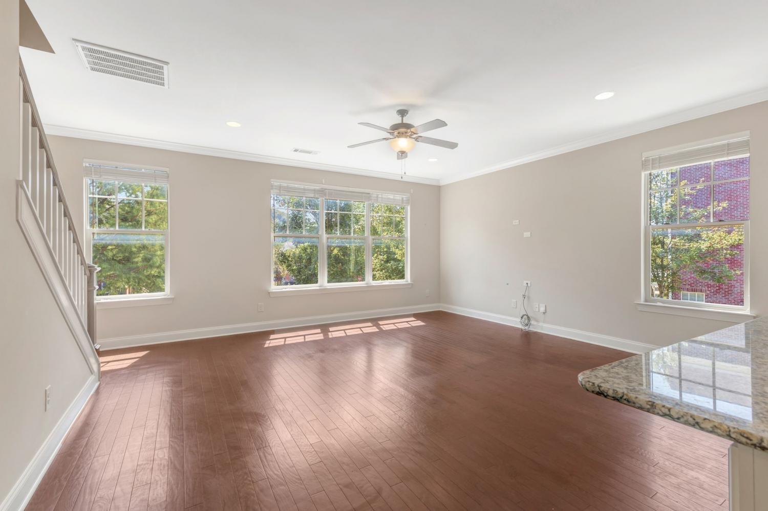 Desirable end-unit three-level townhome in a fantastic location near I-65, shopping, and restaurants. The lower level offers a versatile den, private office with french doors, and full bath—perfect for today’s work-from-home or guest needs. On the main level, enjoy hardwood floors, a spacious living room, and a spacious kitchen with island, granite countertops, upgraded cabinets, and brand-new stainless steel appliances, plus a convenient half bath. Upstairs you’ll find three generous bedrooms, ample closet space, and a laundry room on the same level. Freshly cleaned carpet, a charming rocking chair front porch, and a rear-entry two-car garage with additional guest parking out front add to the appeal. Refrigerator, washer, and dryer remain—move-in ready! New roof 10.20.25!