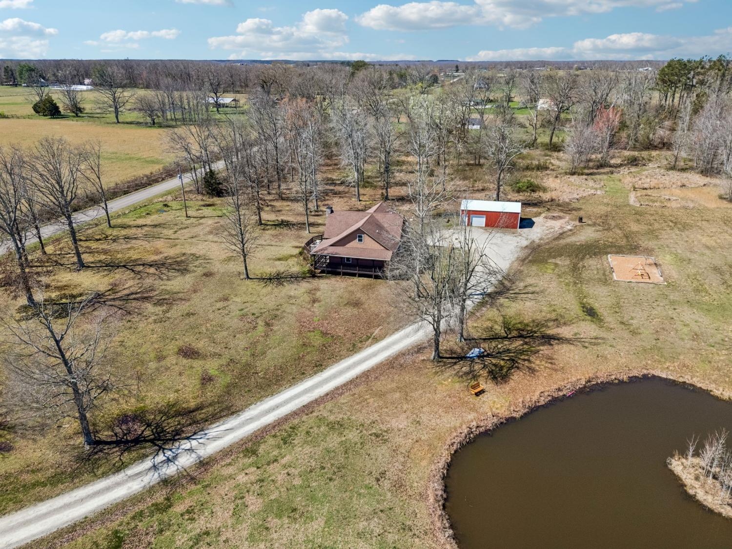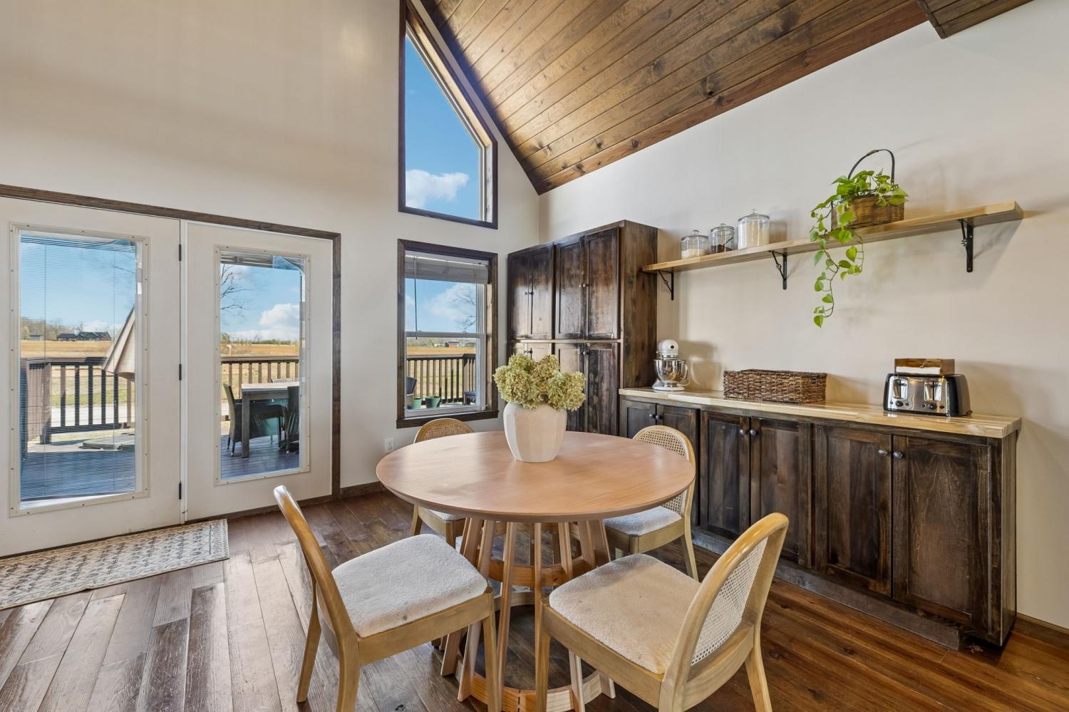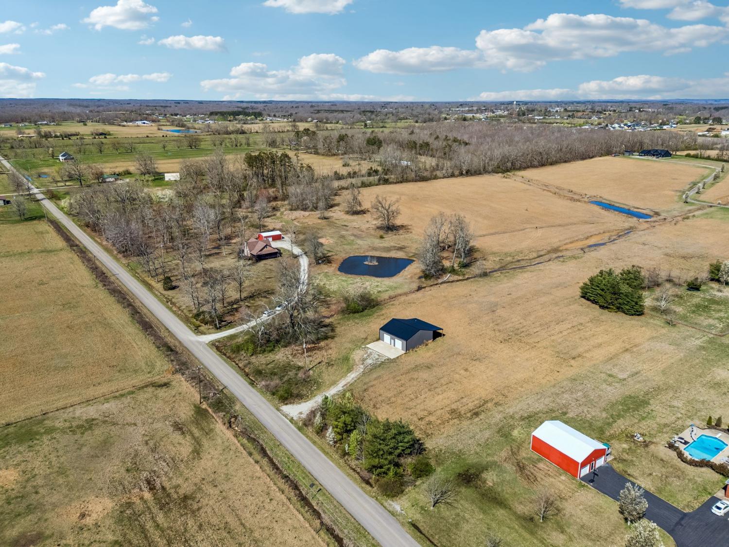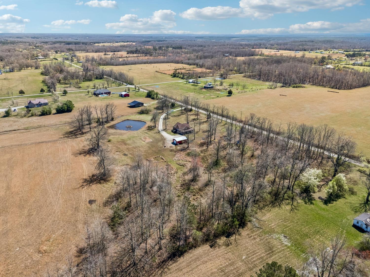 Private retreat with a stocked pond, creek, wraparound porch, and multiple workshop buildings in the desirable High Forest area. This sun filled home offers soaring ceilings and expansive windows that create a bright, open living space with peaceful views of the surrounding trees and countryside. The layout blends comfort and flexibility with four bedrooms and multiple indoor and outdoor gathering spaces. The main level features two bedrooms, including a spacious primary suite with soaking tub, separate shower, and double vanities. A second bedroom with its own en suite bath provides an ideal guest suite or second primary option. Two additional bedrooms upstairs offer great space for family, guests, or home office needs. Outdoor living is a highlight of the property. The large wraparound porch is mostly covered for year round enjoyment, with a portion open for sun and fresh air. A separate deck provides a perfect setting for outdoor dining, entertaining, or relaxing evenings overlooking the property. Nature lovers will appreciate the private stocked pond that belongs entirely to the property, complete with a bench for fishing or enjoying the quiet setting. A creek runs through the land, adding to the scenic beauty and peaceful atmosphere. The property also includes two detached shops, providing exceptional space for hobbies, storage, or business use. A 24 by 30 red garage and a 40 by 40 gray shop with a 16 foot lean to feature 220 volt electric and a two post lift. Inside you will find beautiful wood flooring, custom wainscoting, additional cabinetry, and a built in coffee bar that adds both charm and functionality. Blackberry bushes and open outdoor space complete the setting, offering a wonderful opportunity to enjoy the best of Tennessee countryside living.