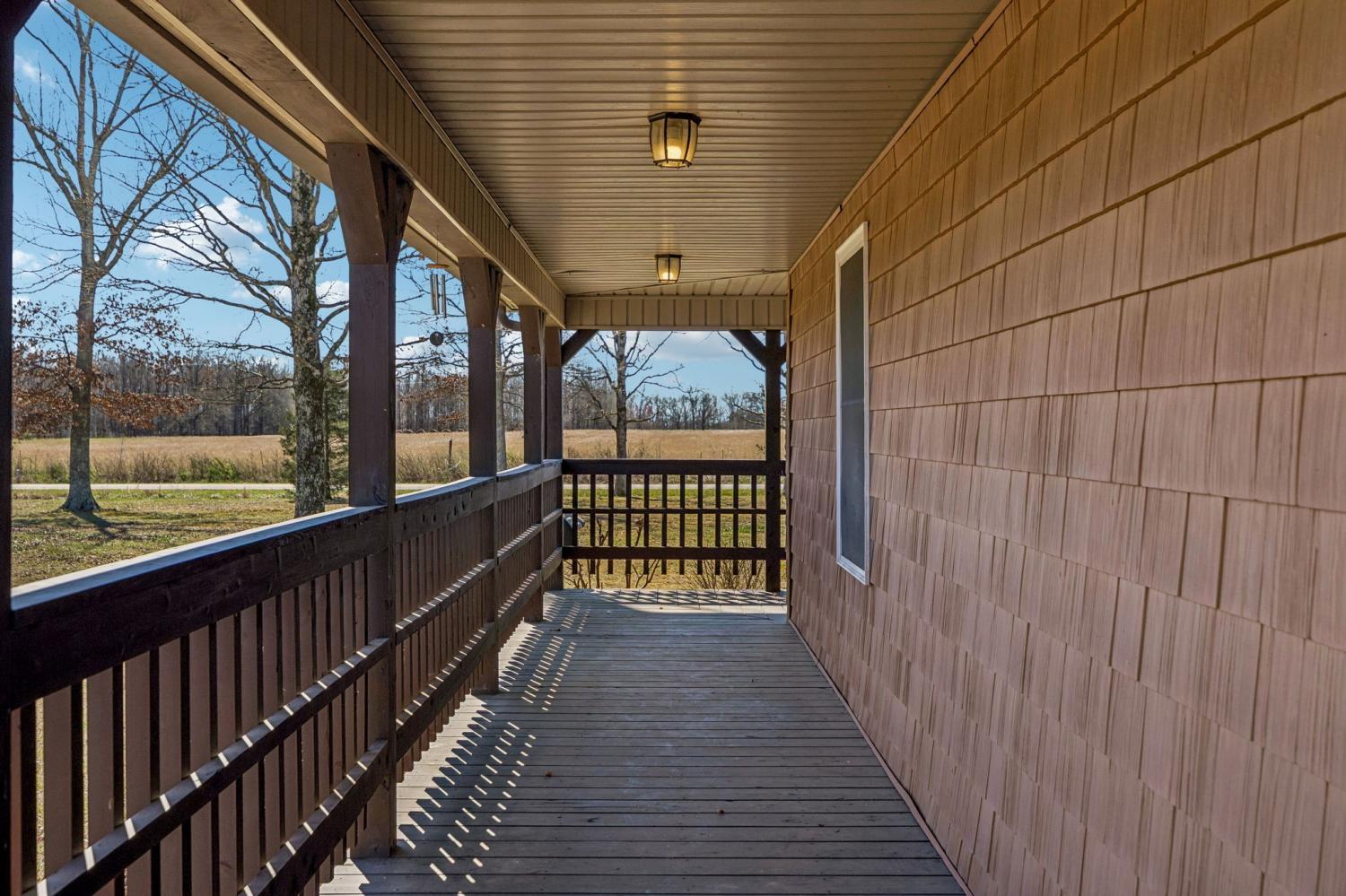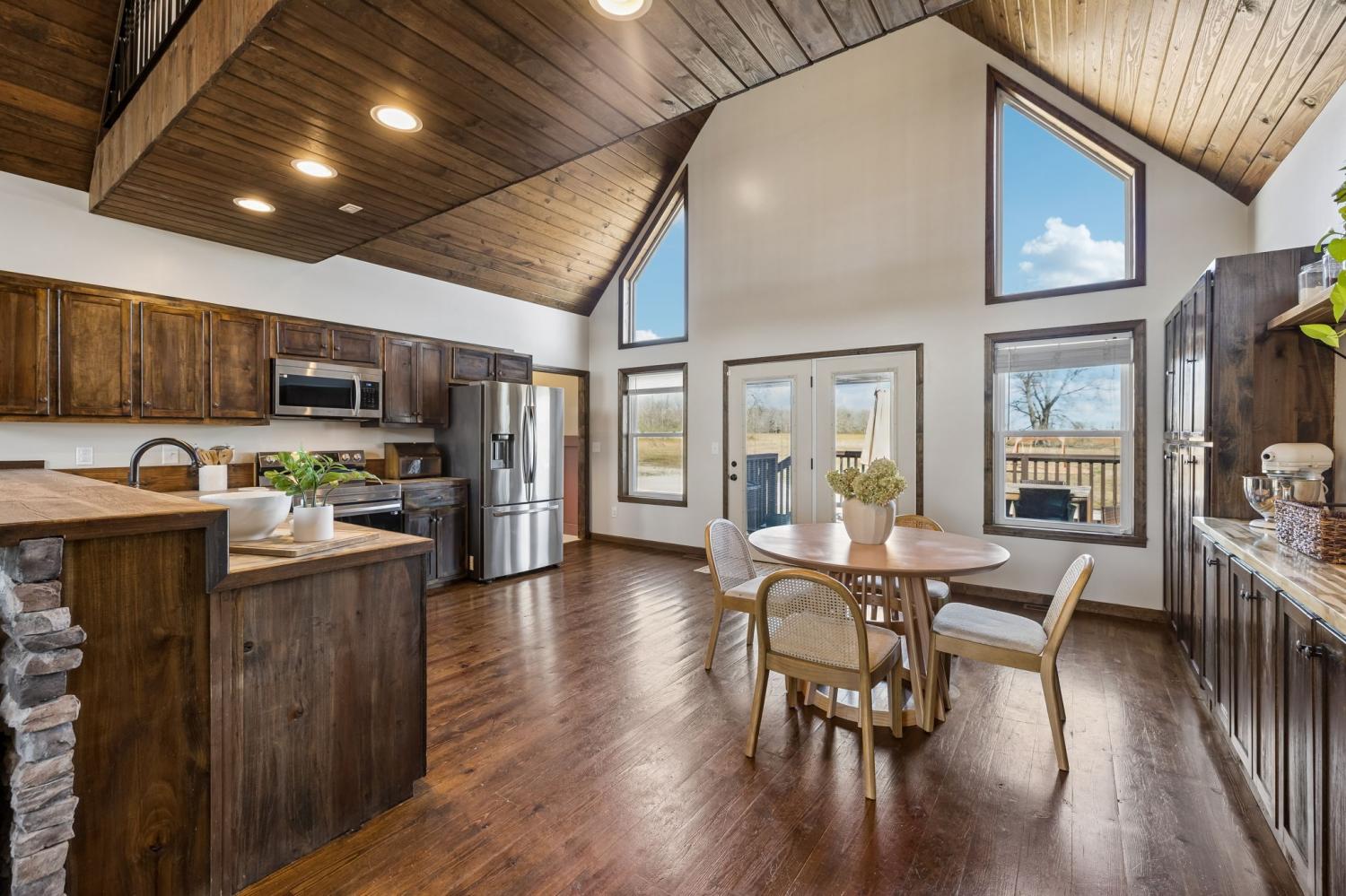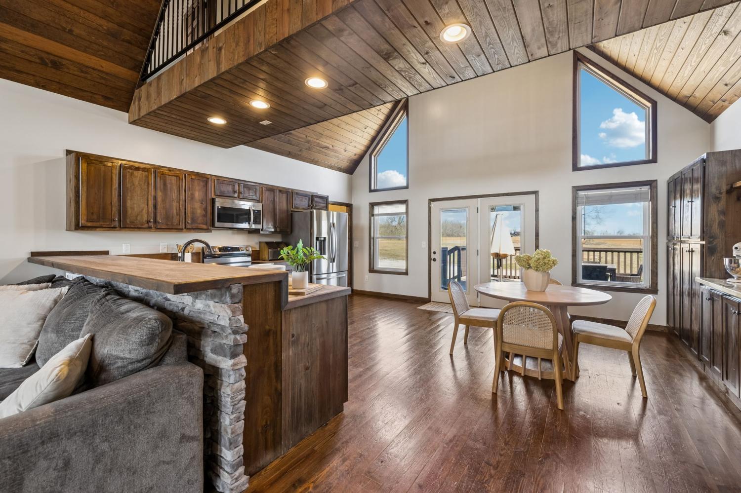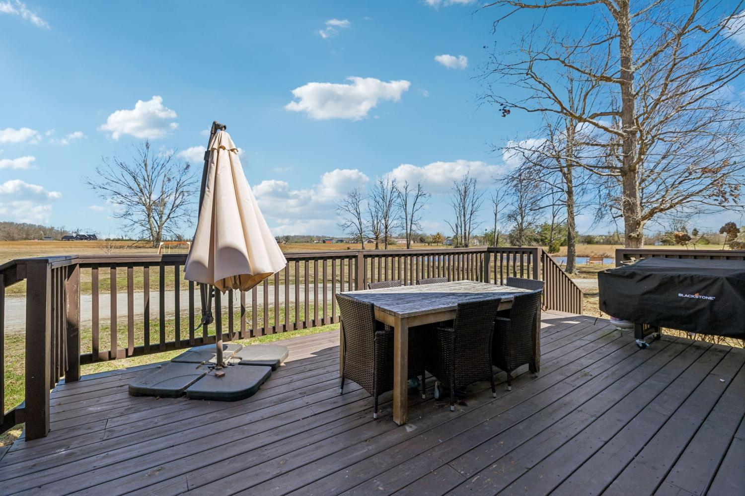 Private retreat with a stocked pond, creek, wraparound porch, and multiple workshop buildings in the desirable High Forest area. This sun filled home offers soaring ceilings and expansive windows that create a bright, open living space with peaceful views of the surrounding trees and countryside. The layout blends comfort and flexibility with four bedrooms and multiple indoor and outdoor gathering spaces. The main level features two bedrooms, including a spacious primary suite with soaking tub, separate shower, and double vanities. A second bedroom with its own en suite bath provides an ideal guest suite or second primary option. Two additional bedrooms upstairs offer great space for family, guests, or home office needs. Outdoor living is a highlight of the property. The large wraparound porch is mostly covered for year round enjoyment, with a portion open for sun and fresh air. A separate deck provides a perfect setting for outdoor dining, entertaining, or relaxing evenings overlooking the property. Nature lovers will appreciate the private stocked pond that belongs entirely to the property, complete with a bench for fishing or enjoying the quiet setting. A creek runs through the land, adding to the scenic beauty and peaceful atmosphere. The property also includes two detached shops, providing exceptional space for hobbies, storage, or business use. A 24 by 30 red garage and a 40 by 40 gray shop with a 16 foot lean to feature 220 volt electric and a two post lift. Inside you will find beautiful wood flooring, custom wainscoting, additional cabinetry, and a built in coffee bar that adds both charm and functionality. Blackberry bushes and open outdoor space complete the setting, offering a wonderful opportunity to enjoy the best of Tennessee countryside living.