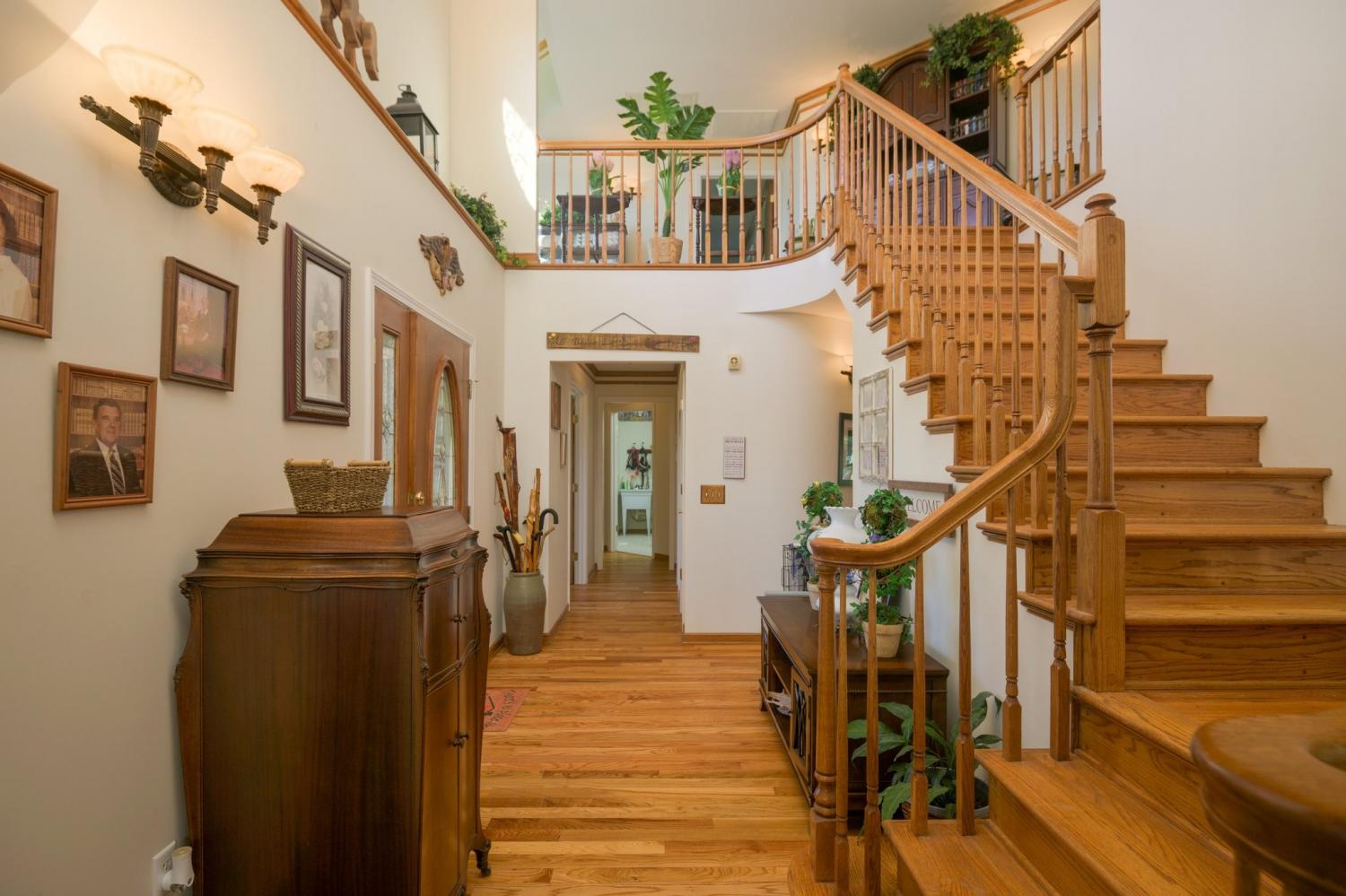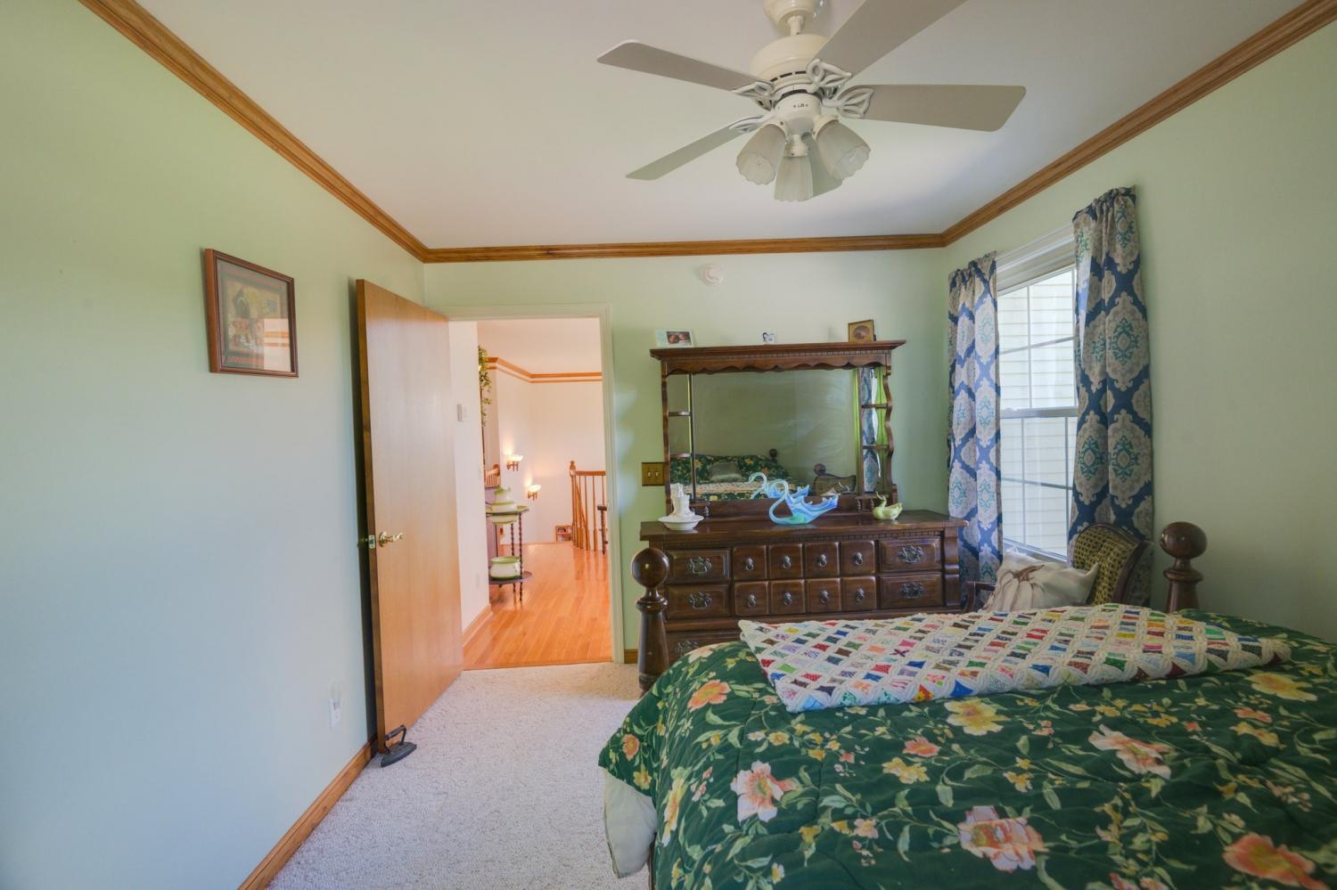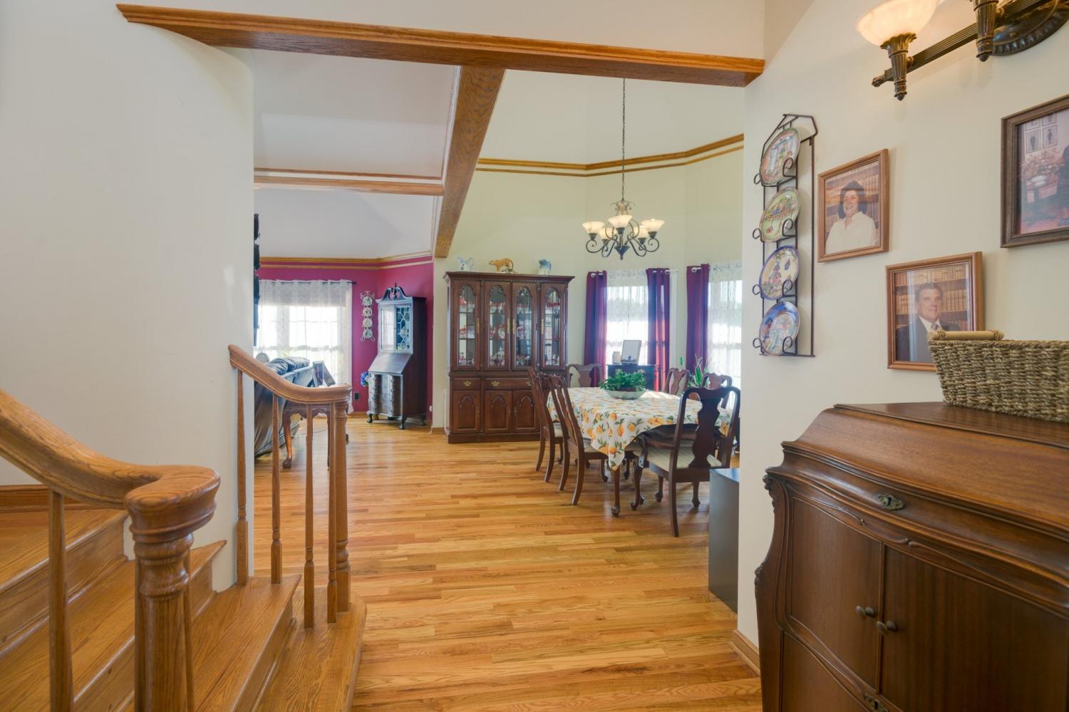 Beautiful 4 bedroom, 4 bathroom custom-built home nestled in a peaceful country setting on approximately 5.04 acres. This spacious home features vaulted ceilings and a blend of hardwood, carpet, and vinyl flooring throughout. All windows have been replaced and have transferrable warranties as well as all new LED lighting and new HVAC. The kitchen includes a new stainless steel refrigerator, dishwasher, and oven, all installed within the last 8 months. The main level offers a spacious kitchen, primary suite, additional bedroom, formal dining room, sunroom or office space, and laundry room. The seller is also leaving the washer and dryer. Upstairs you’ll find two additional bedrooms and a full bath, along with spectacular views from the home’s charming turret. The full basement offers approximately 1,800 square feet of heated and cooled additional space and includes an office and bathroom with a standing shower. A whole-home generator provides added peace of mind.