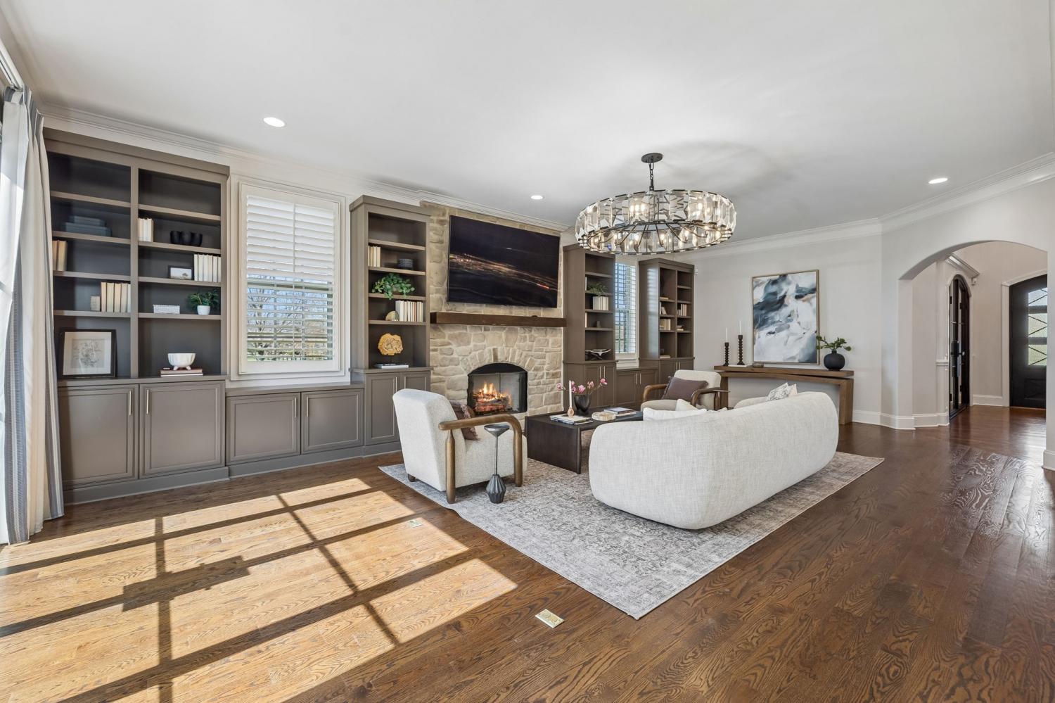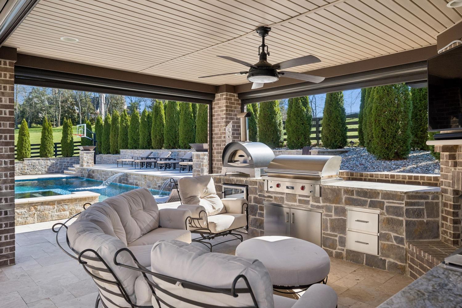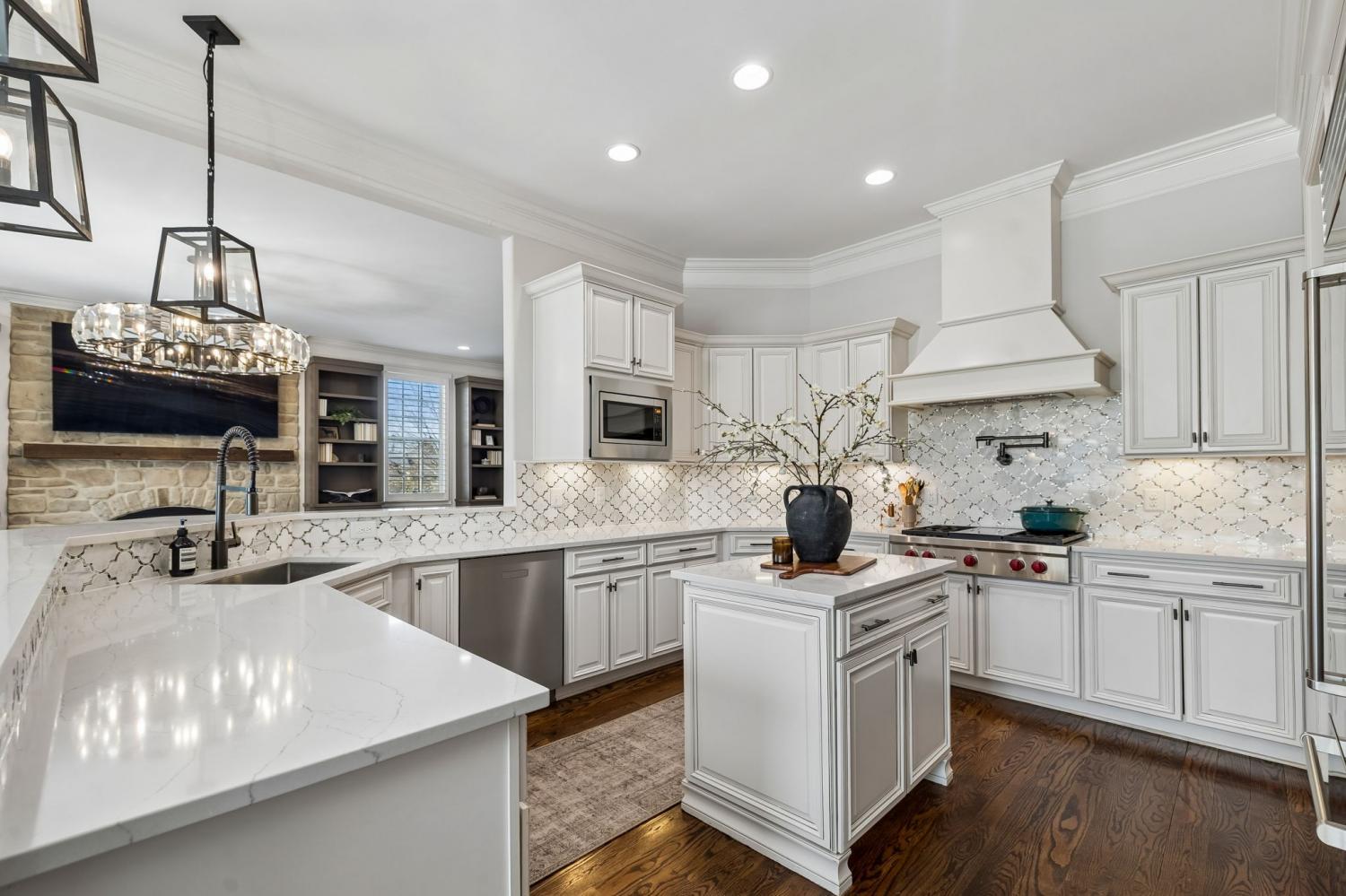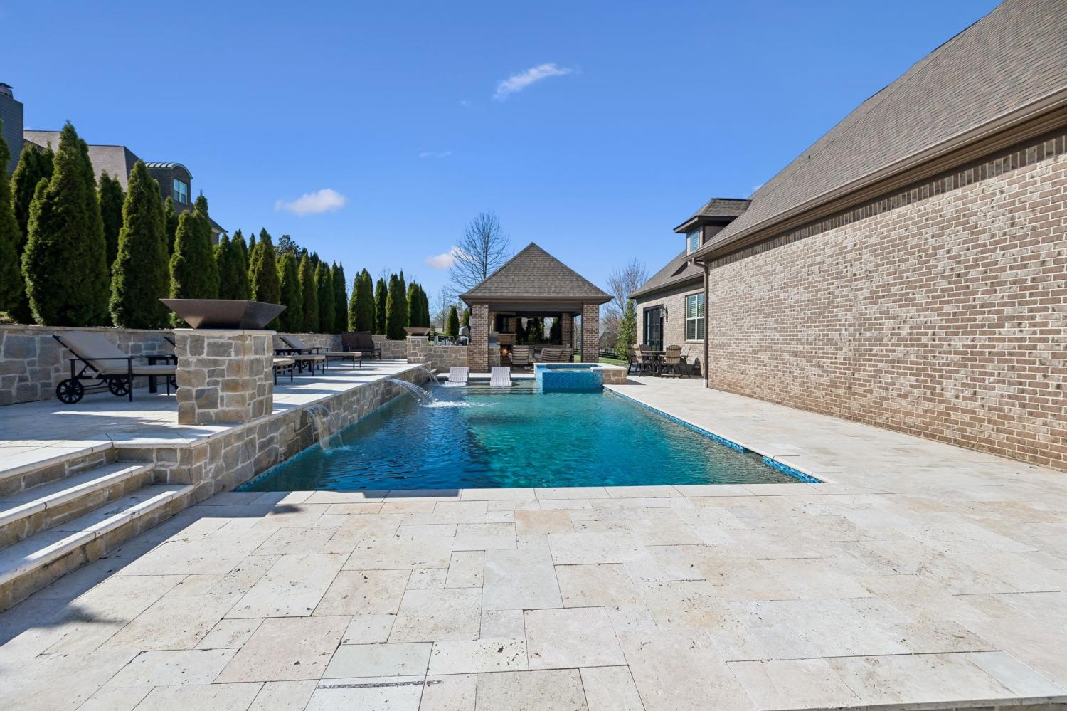 Stunning estate on a private 1-acre lot in the highly sought-after Black Hawk community, where luxury living meets incredible indoor-outdoor entertaining. The gated property offers a truly exceptional backyard oasis featuring a fenced yard, in-ground pool and spa with sun shelf, and gas fire features, along with a covered patio and fully equipped outdoor kitchen. Designed for year-round enjoyment, the outdoor living space includes retractable screens, a gas fireplace, pizza oven, TEC built-in gas grill, Fire Magic hibachi cooktop, honed granite countertops, beverage cooler, ice maker, prep sink, outdoor speaker system, and performance basketball hoop. Inside, the home impresses from the moment you enter the 19’ grand foyer with a striking chandelier. Hardwood floors flow throughout the main level, which features a private study with French doors, tray ceiling, gas fireplace, and herringbone wood accent wall. The open-concept living area offers abundant built-ins and a ventless gas fireplace with stone surround, along with remote-controlled motorized curtains, and flows seamlessly into the breakfast area and chef’s kitchen. The kitchen is beautifully appointed with Wolf double ovens, Wolf 4-burner gas cooktop with griddle, pot filler, and a Sub-Zero refrigerator, plus a convenient wet bar positioned between the kitchen and formal dining room for effortless entertaining. The main-level primary suite offers soaring 14’ ceilings, a cozy seating nook, and French doors leading to the spa-like bath, featuring double vanities, statement tile accents, and dual walk-in closets with custom lighting. A stylish laundry room with shiplap accent wall, utility sink, and cabinetry completes the main level. Upstairs, you’ll find 3 additional bedrooms, including two connected by a Jack-and-Jill bath with private vanities and one with its own ensuite. A spacious rec room with wet bar, beverage cooler and honed granite countertops provides the perfect space for relaxing or entertaining.