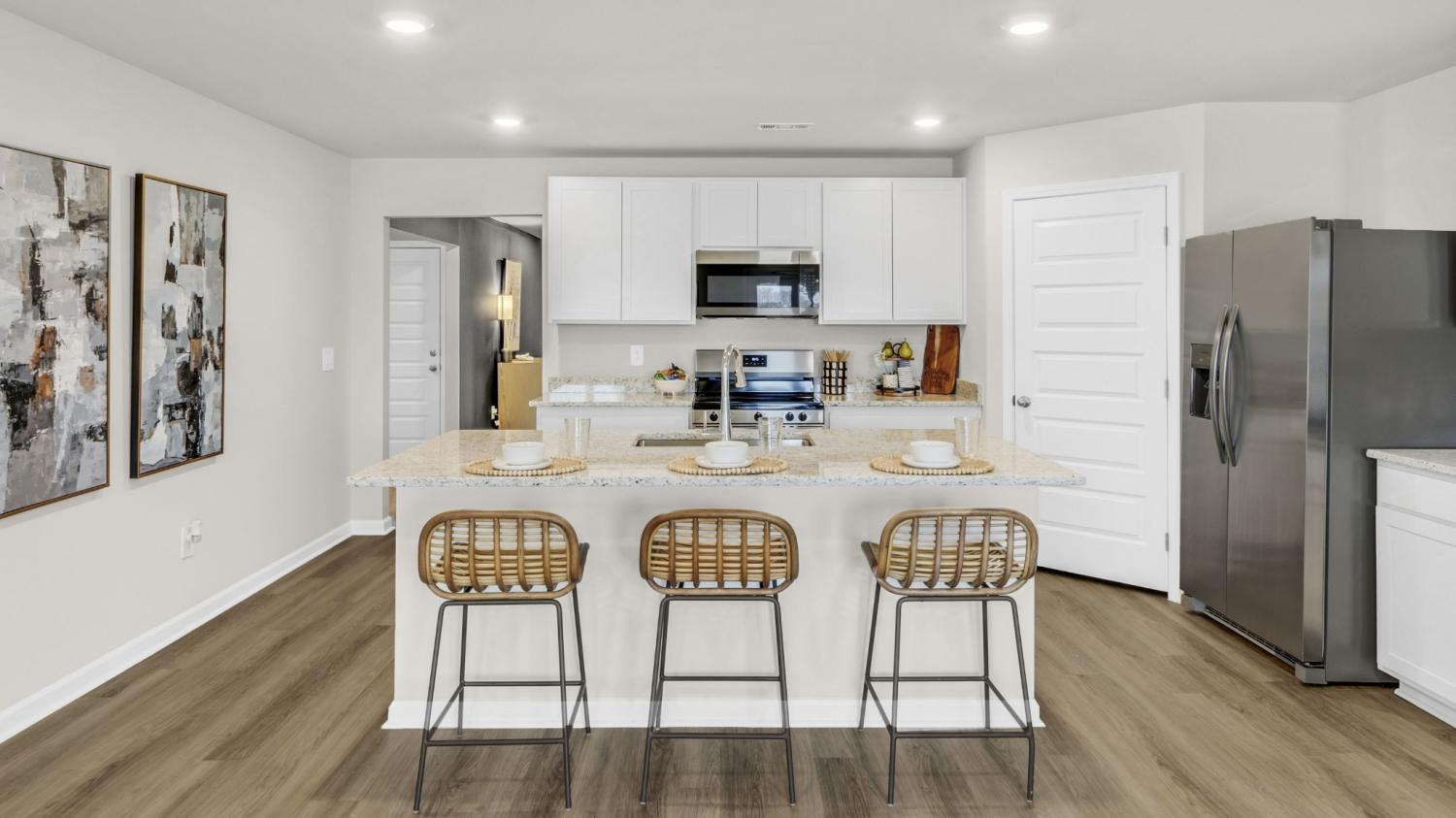 Discover the popular Cali floorplan with 4-bedrooms, 2-bathrooms, and 1,841 sq ft of space. Two front bedrooms share a bath, while another is perfect for guest or an office. Enjoy an open concept kitchen, dining, and great room with granite or quartz counters, stainless appliances, and a corner pantry. Smart home features in the Home is Connected package offer added convenience, This home blends comfort, style, and function - ideal for modern living. Photos are representational.