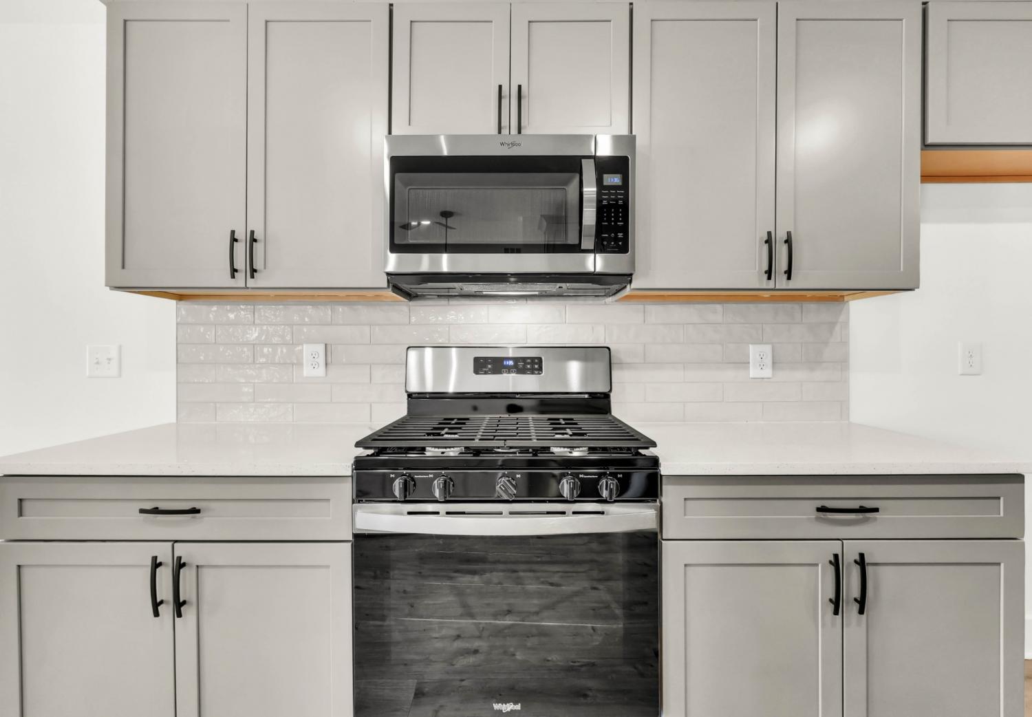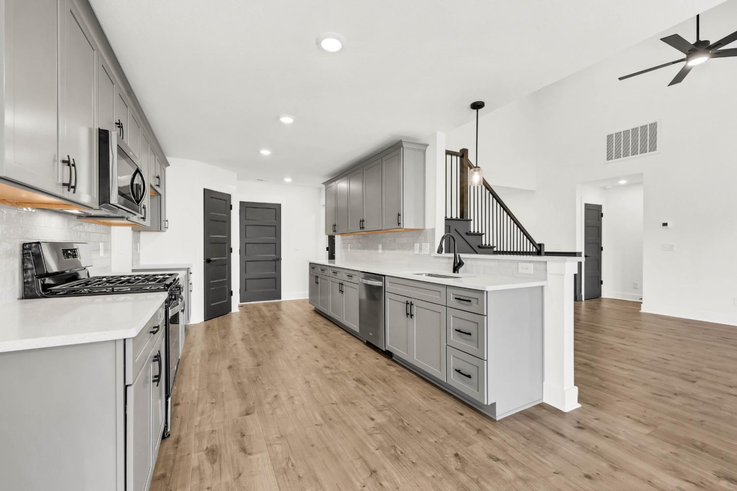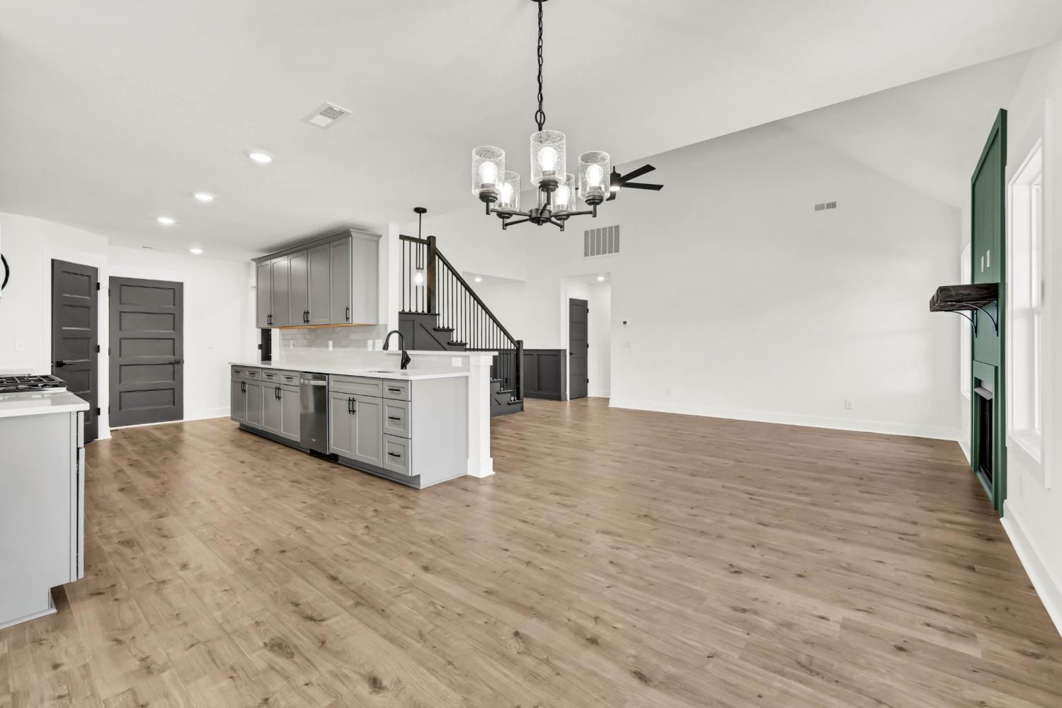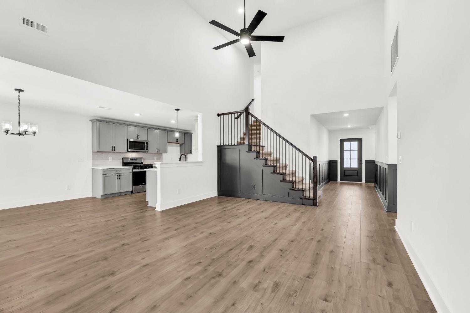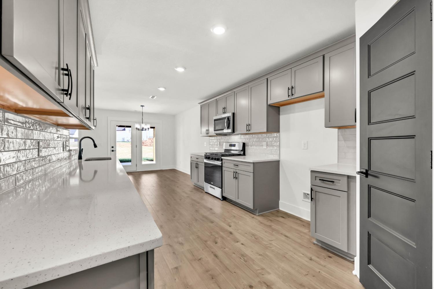 Stunning 4BR/3BA open floor plan with two main level BRs. Vaulted great room with shiplap fireplace opens to the kitchen. Kitchen with tons of cabinets featuring soft close drawers/doors, quartz tops, tiled backsplash and pantry. Gas range/oven is wired for electric as well. Custom trim work in entry foyer and great room. Primary suite plus one additional bedroom (or office) on the main level - and all hard flooring (zero carpet) on this level. Primary suite has full bathroom with double vanity, separate tiled shower, tub and walk-in closet. Upper level features two additional BRs with walk-in closets, a large bonus room (with closet), plus floored attic storage space. Gas heat on main level and electric heat on upper level. Front porch and large covered rear patio.