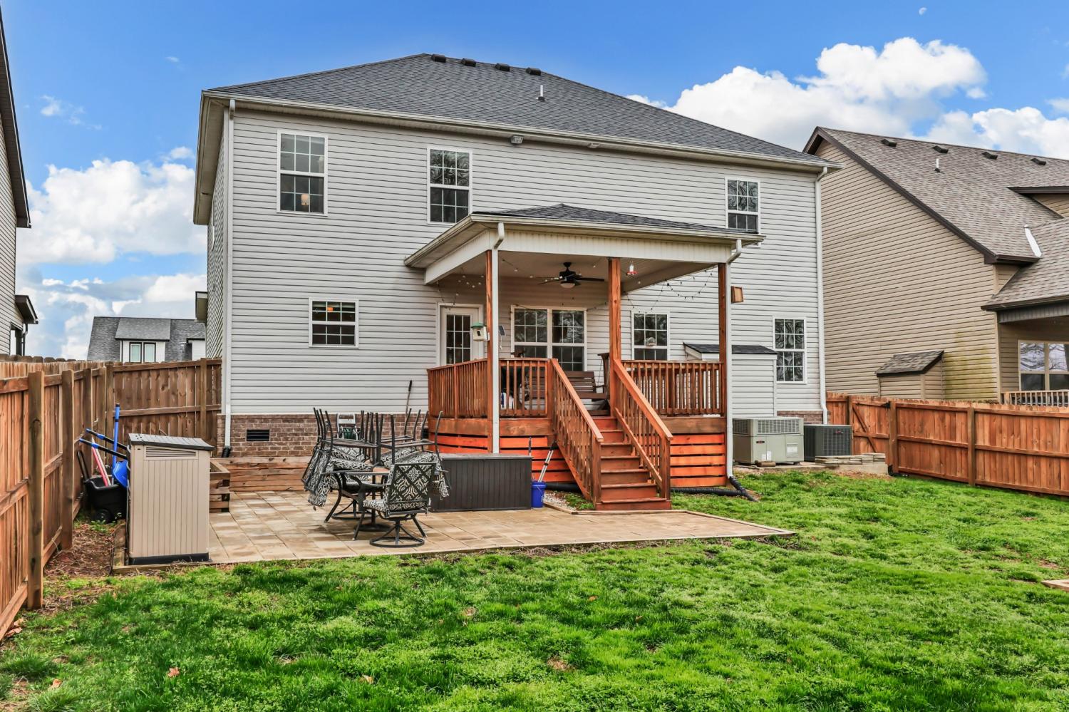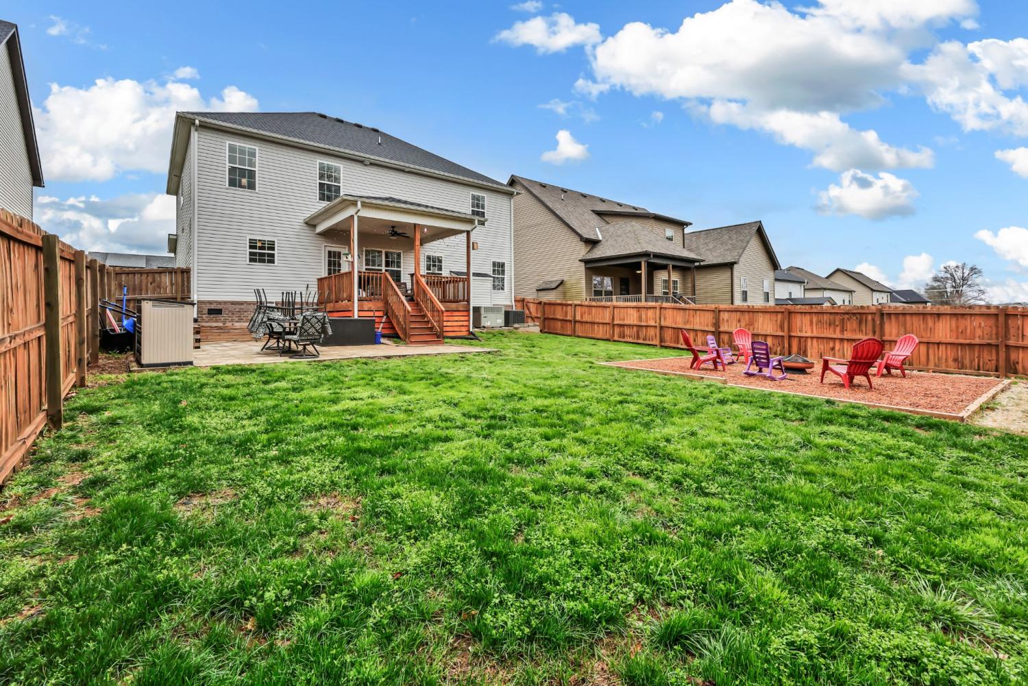 This beautifully designed home offers generous living space paired with modern finishes, creating the perfect balance of comfort and functionality. The kitchen is a standout, featuring stainless steel appliances, including a double oven, making it ideal for both everyday living and entertaining. Flowing seamlessly into the main living areas, the layout is perfect for hosting or simply enjoying time at home. The primary suite is a true retreat, complete with elegant tray ceilings, dual walk-in closets, and a spacious ensuite bath featuring a tiled shower and a relaxing jetted tub, perfect for unwinding at the end of the day. Step outside to enjoy the covered deck overlooking a large, fully fenced backyard, offering the perfect space for gatherings, pets, or peaceful evenings outdoors. With its prime location, thoughtful layout, and inviting features, this home truly offers the best of Clarksville living.