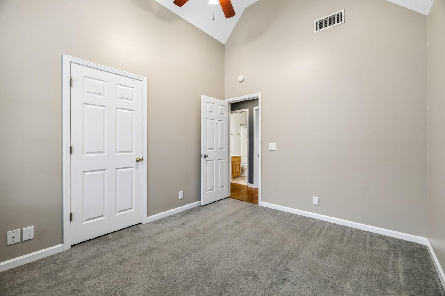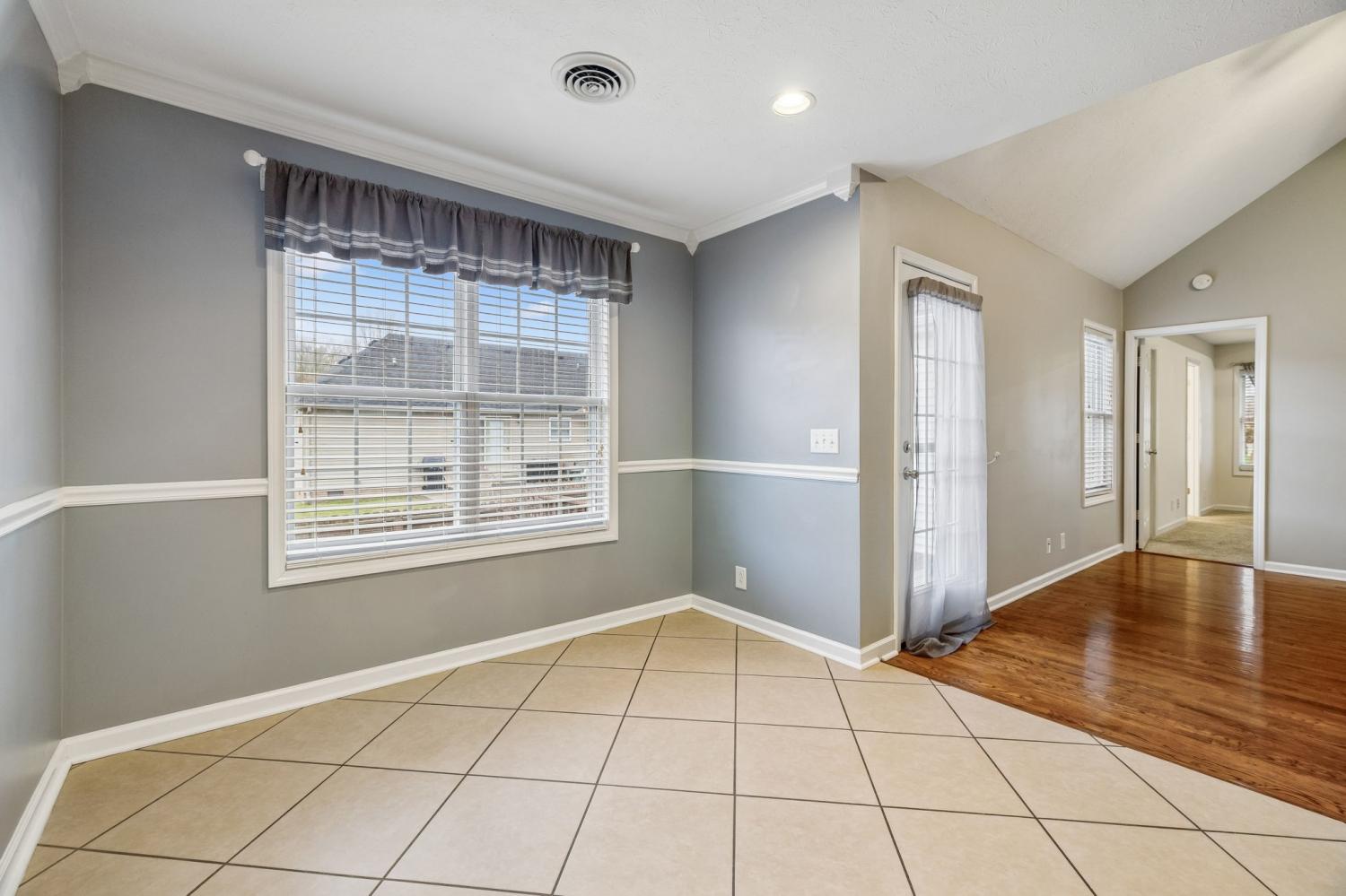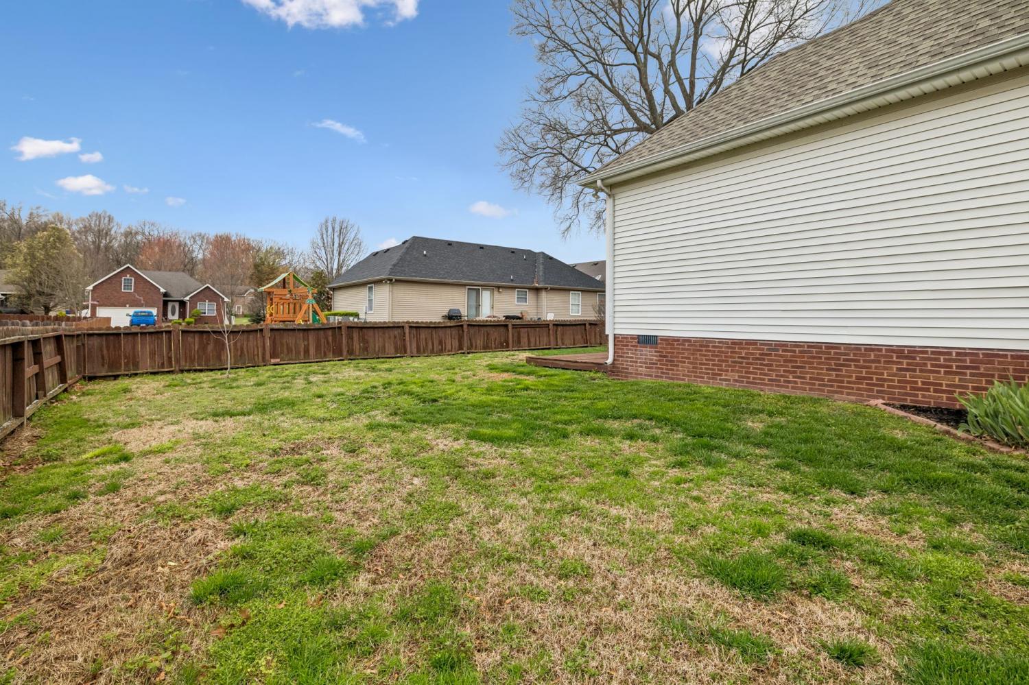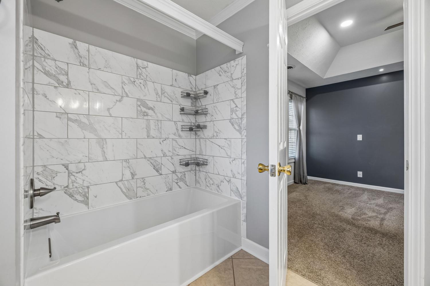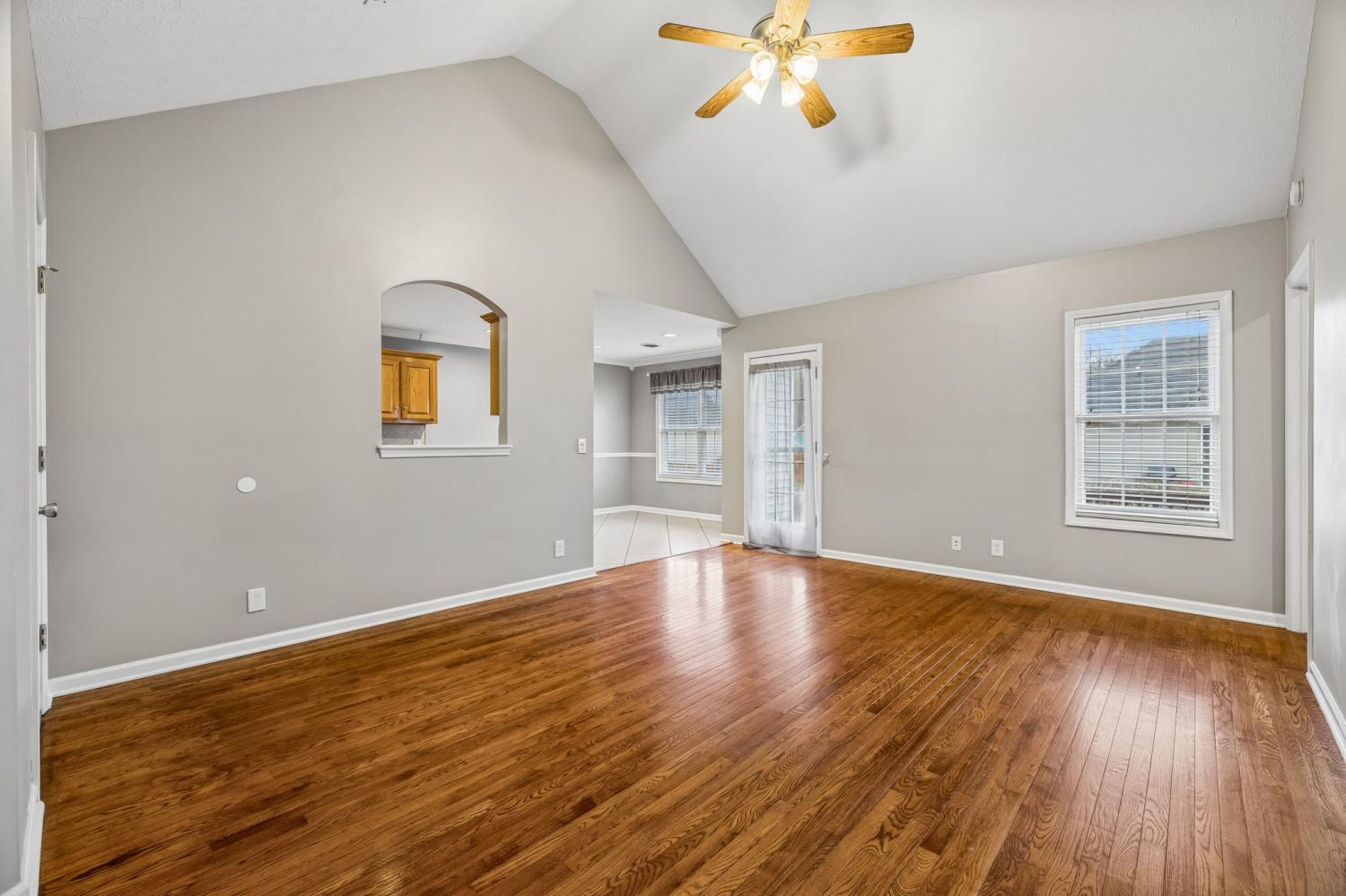 This inviting 3 bedroom, 2 bath home offers comfortable living space and one of the largest fenced backyards in the neighborhood. The living room features beautiful hardwood floors and cathedral ceilings that create an open and airy feel. The kitchen offers tile flooring, a pantry, and an eat-in dining area with newer appliances including the stove, microwave, and dishwasher (approximately 1 year old). The spacious primary suite includes a trey ceiling, large walk-in closet, and a private bath with tile flooring, double vanities, and a soaking tub and shower with tile backsplash. Two additional bedrooms share a full bath with a tub and shower combo.The bonus room above the garage features new carpet and offers versatile space for a home office, playroom, or media room, along with attic storage equipped with lighting. Step outside to enjoy the deck overlooking the fenced backyard, offering plenty of space for relaxing or entertaining.