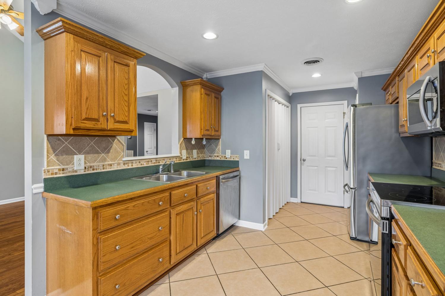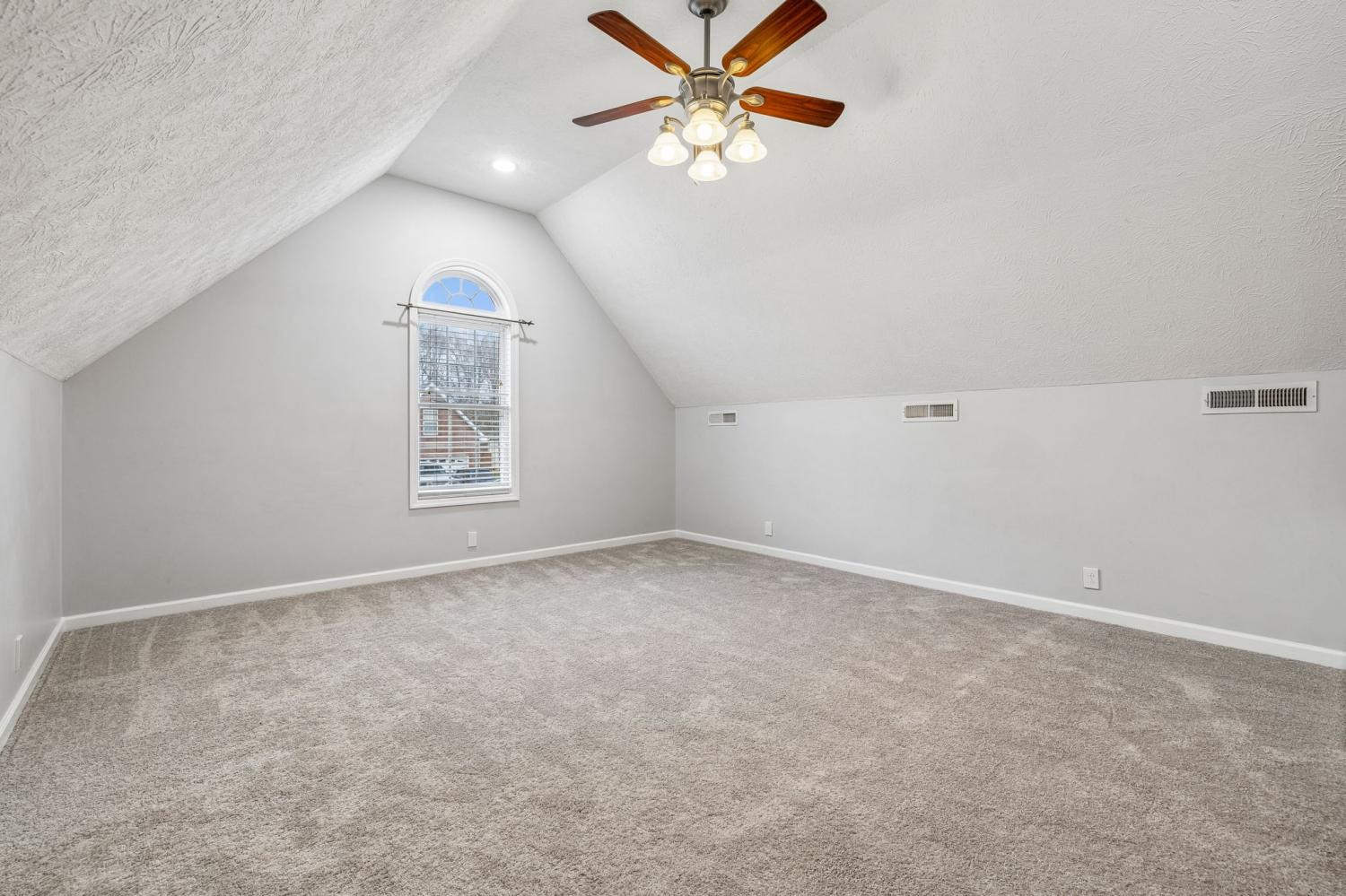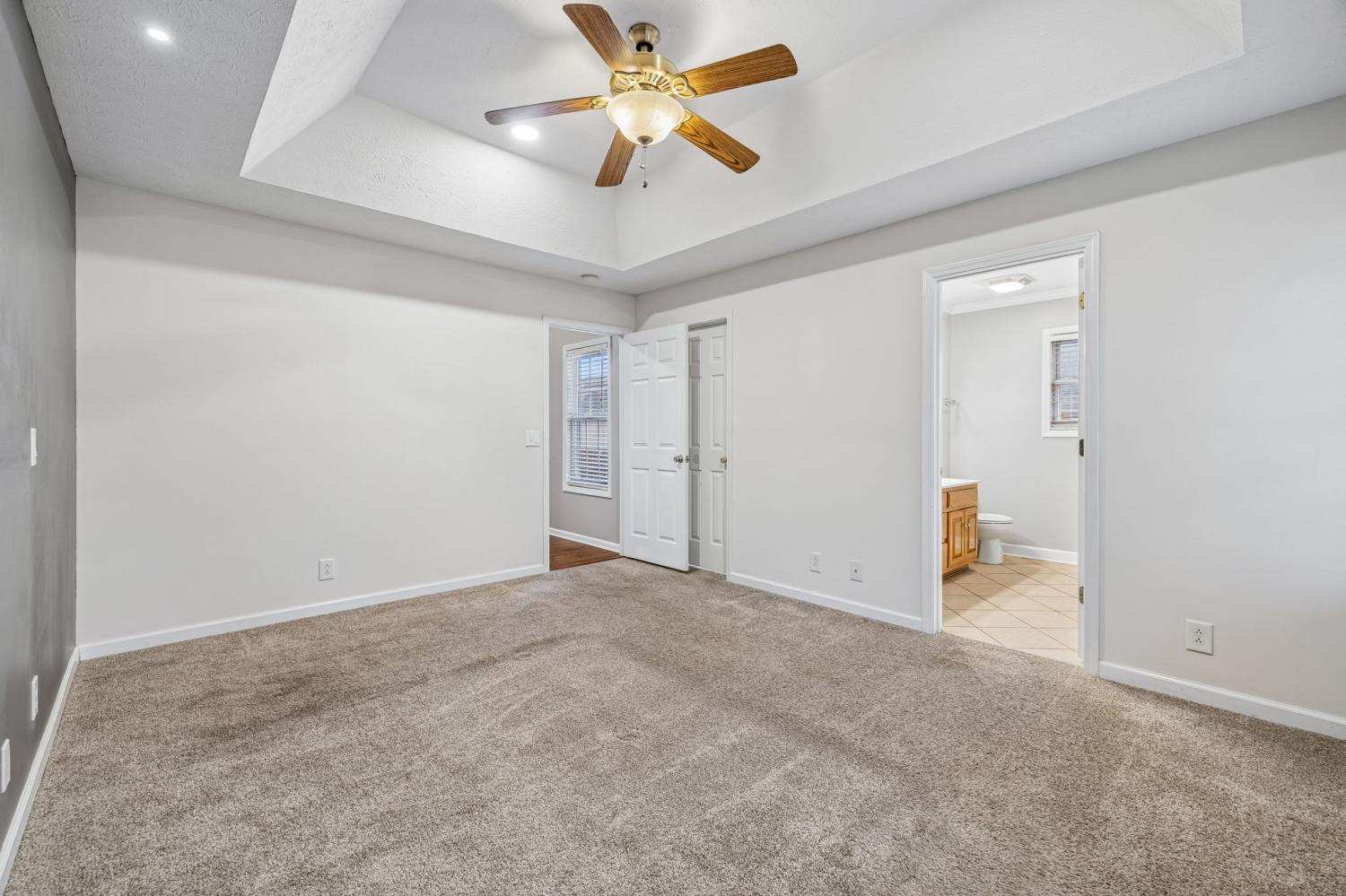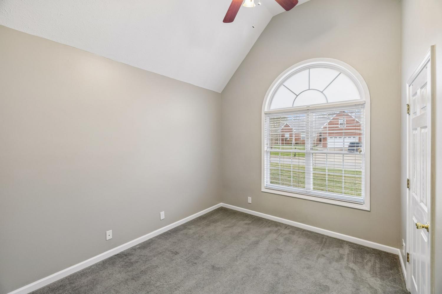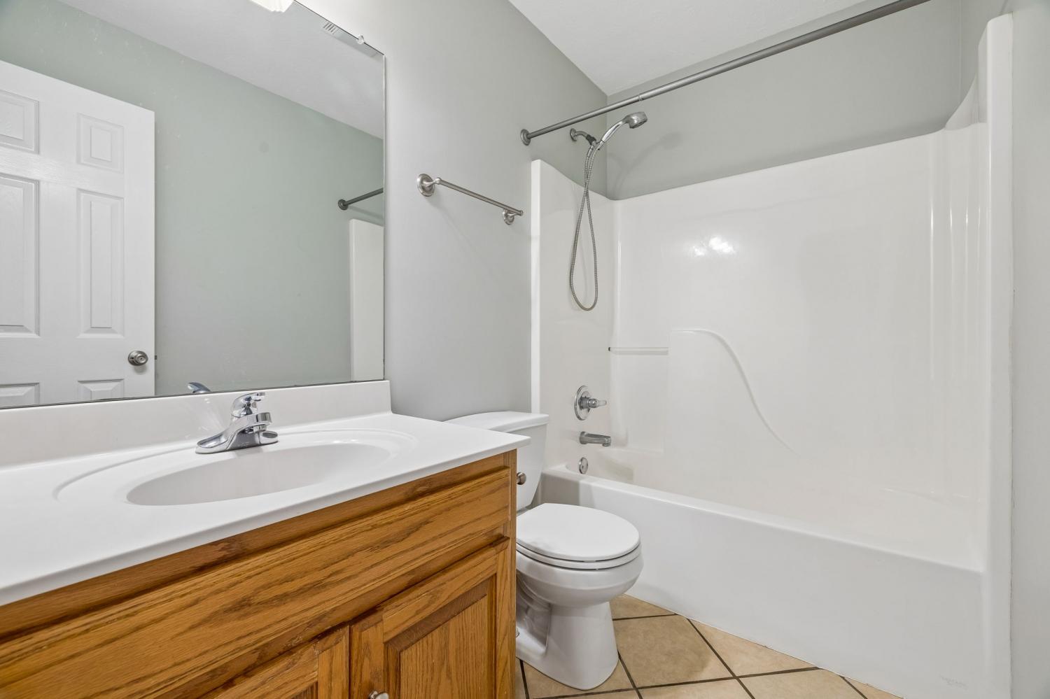 This inviting 3 bedroom, 2 bath home offers comfortable living space and one of the largest fenced backyards in the neighborhood. The living room features beautiful hardwood floors and cathedral ceilings that create an open and airy feel. The kitchen offers tile flooring, a pantry, and an eat-in dining area with newer appliances including the stove, microwave, and dishwasher (approximately 1 year old). The spacious primary suite includes a trey ceiling, large walk-in closet, and a private bath with tile flooring, double vanities, and a soaking tub and shower with tile backsplash. Two additional bedrooms share a full bath with a tub and shower combo.The bonus room above the garage features new carpet and offers versatile space for a home office, playroom, or media room, along with attic storage equipped with lighting. Step outside to enjoy the deck overlooking the fenced backyard, offering plenty of space for relaxing or entertaining.