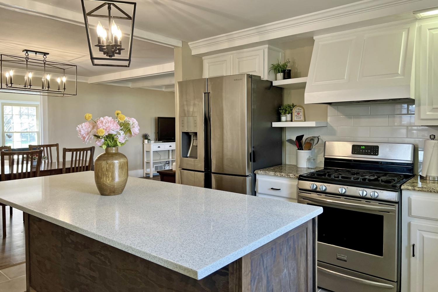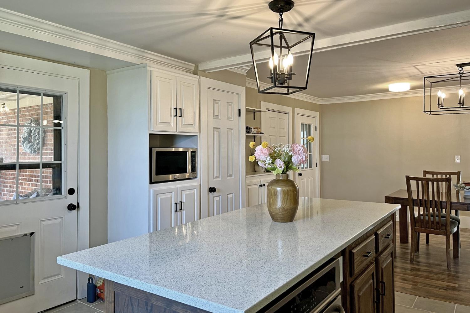 Nestled on nearly one acre, this charming ranch-style home offers the perfect blend of comfort, space, and country charm. Featuring 3 bedrooms and 2 bathrooms, the home boasts a beautifully remodeled kitchen with stunning granite and quartz countertops, a built-in oven, gas range, dishwasher, microwave, and refrigerator. The washer and dryer are also included, making this home truly move-in ready. A large hobby room provides endless possibilities- perfect for crafts, homeschooling, or a second den. Step outside and enjoy the beauty of mature trees and vibrant spring flowers that create a peaceful setting where you'll want to kick off your shoes and relax in the yard. Additional features include a spacious workshop and storage building, ideal for projects or extra storage, as well as an unfinished basement accessible through the garage that offers even more potential for expansion or storage. With its spacious lot, versatile living areas, and thoughtful updates, this property offers the perfect place to call home.