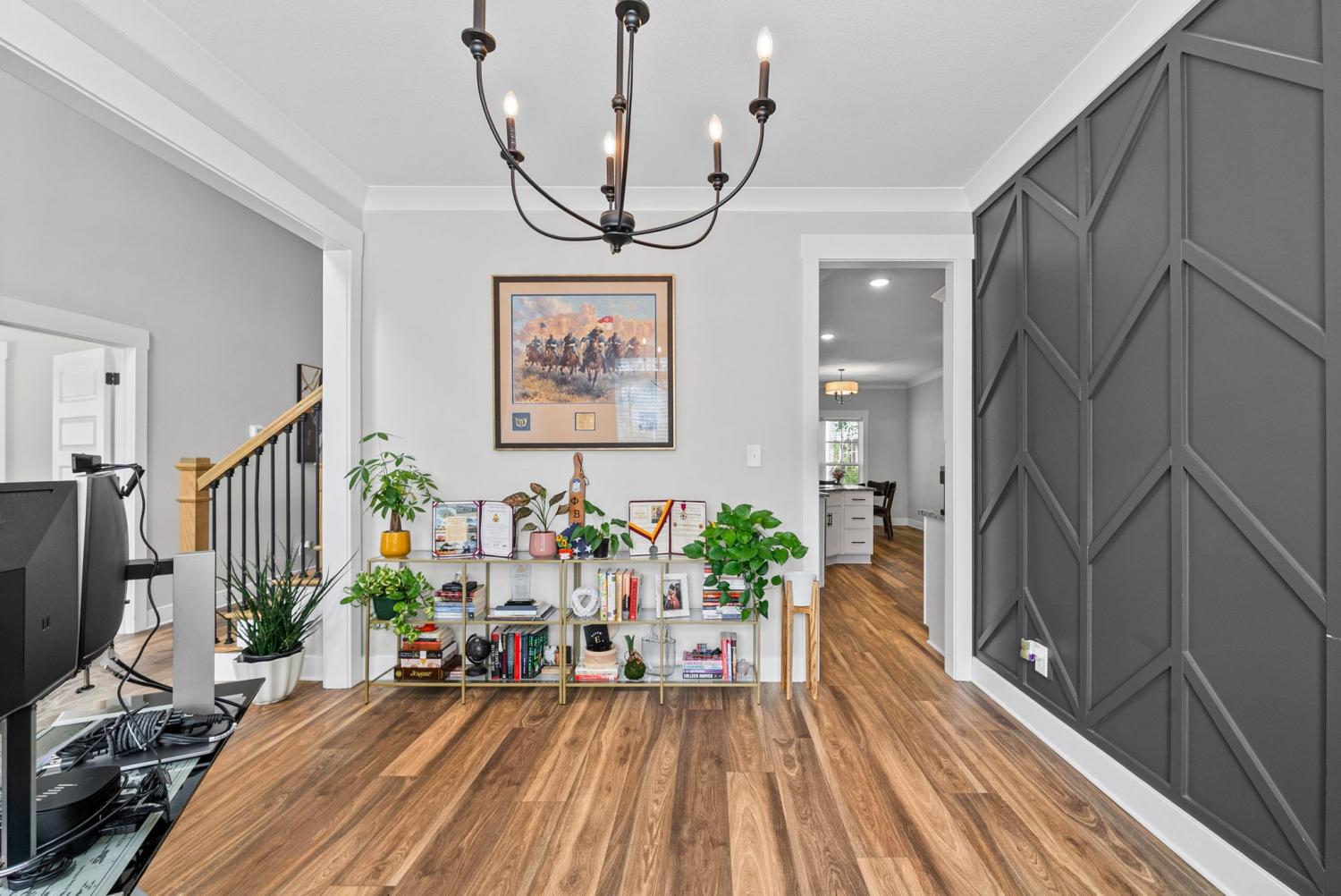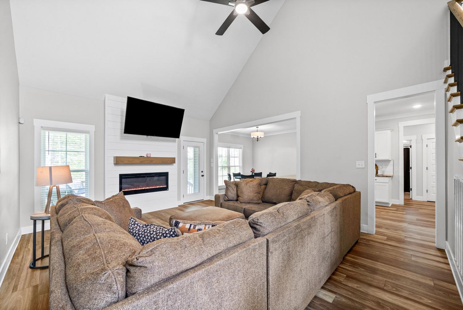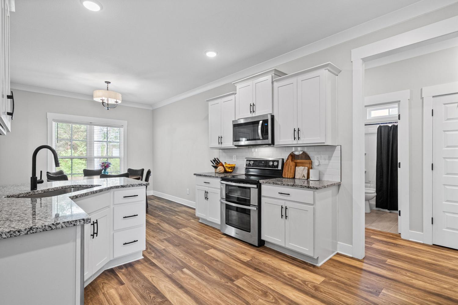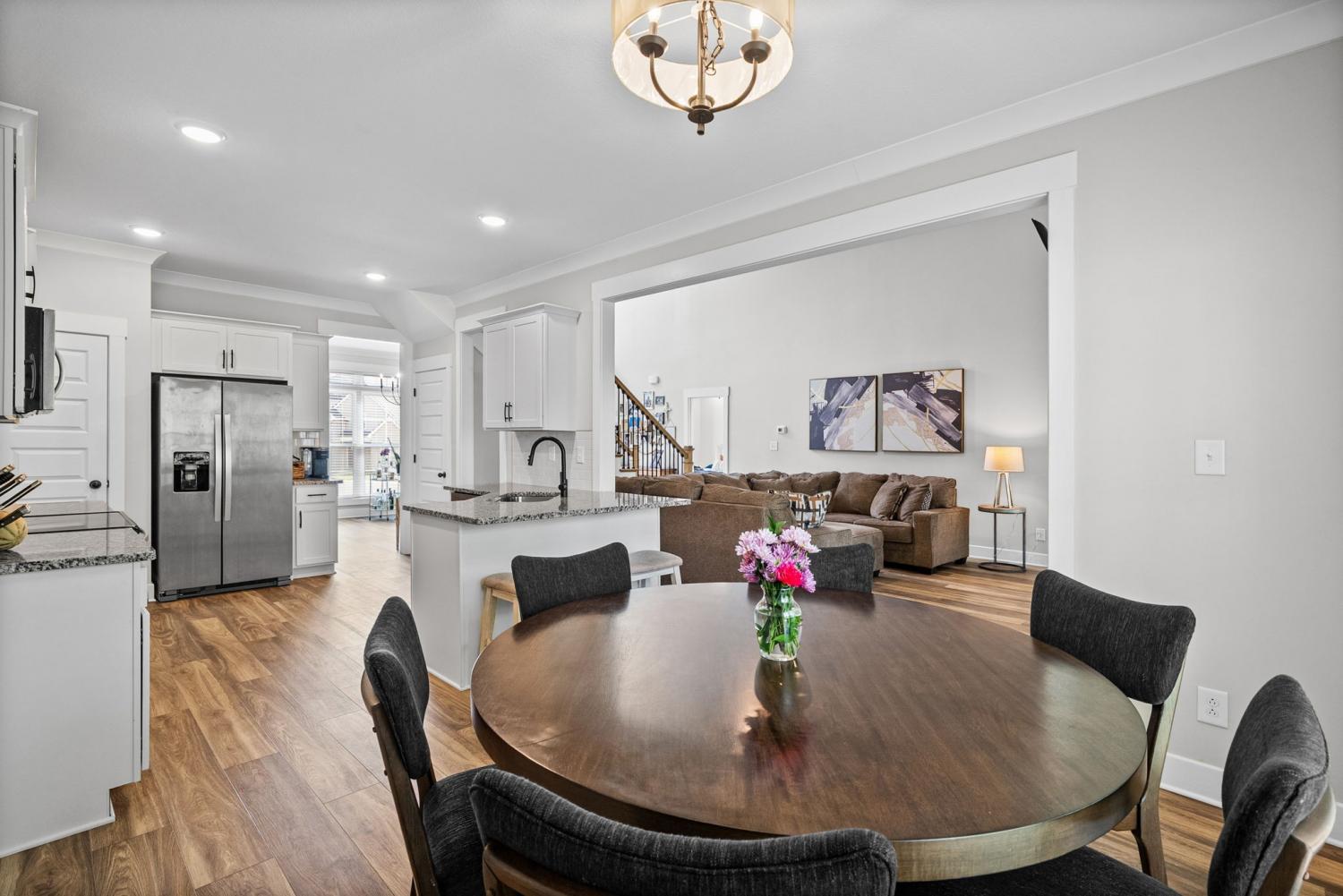 Don't miss out on this show stopper! Stunning vaulted foyer, grand staircase, decorative shiplap details, modern fixtures & desirable LED fireplace. The open kitchen is complete with an eat-in area, serving bar, tile backsplash, stainless appliances & upgraded cabinets. Separate formal dining room. The primary suite and an additional second bedroom with a bathroom are located on the main level. The primary suite boasts TWO walk-in closets, a free-standing tub, and a full tile shower with a glass enclosure. Located on the second level are two additional bedrooms with a shared bathroom along with a large versatile bonus room. Covered deck, treed lot and situated in a cul-de-sac.