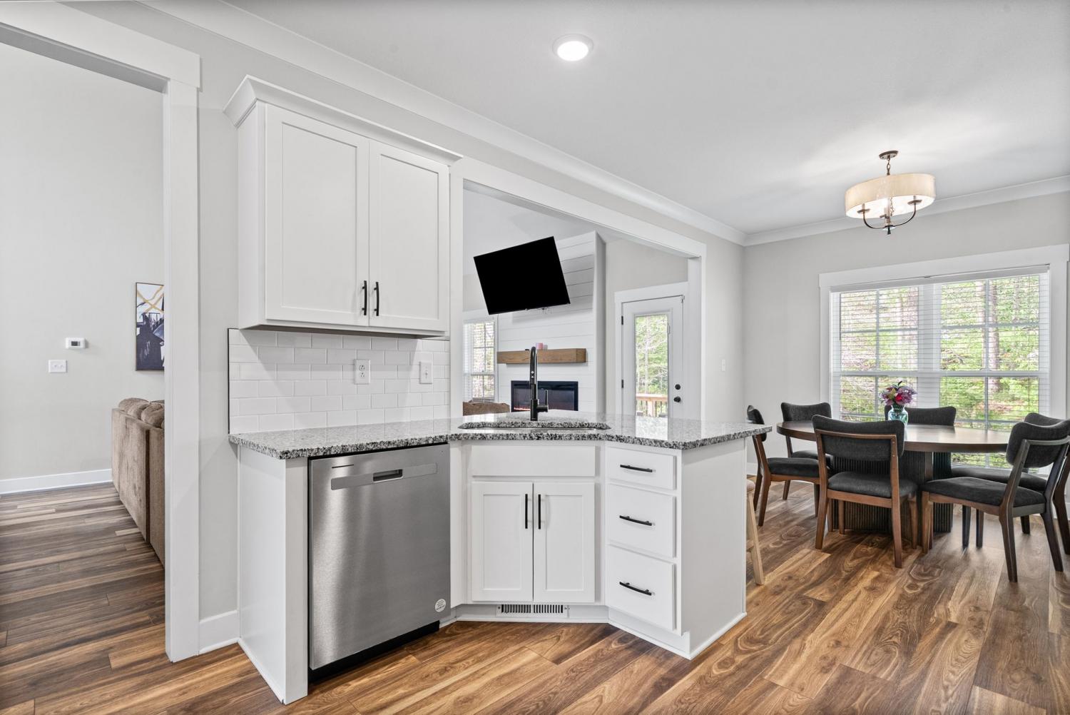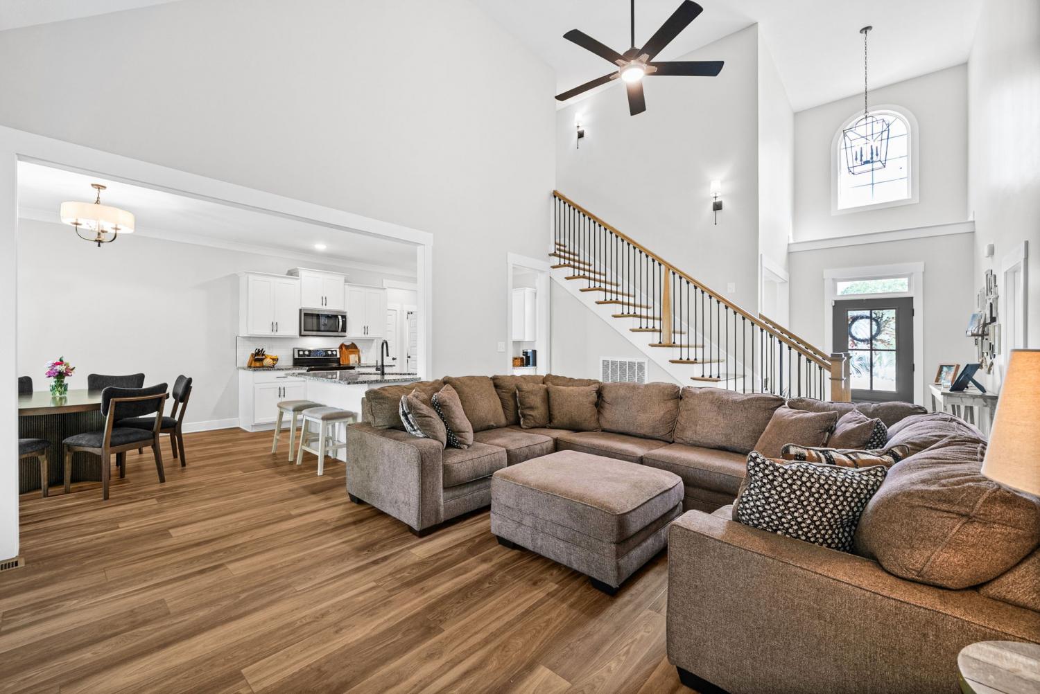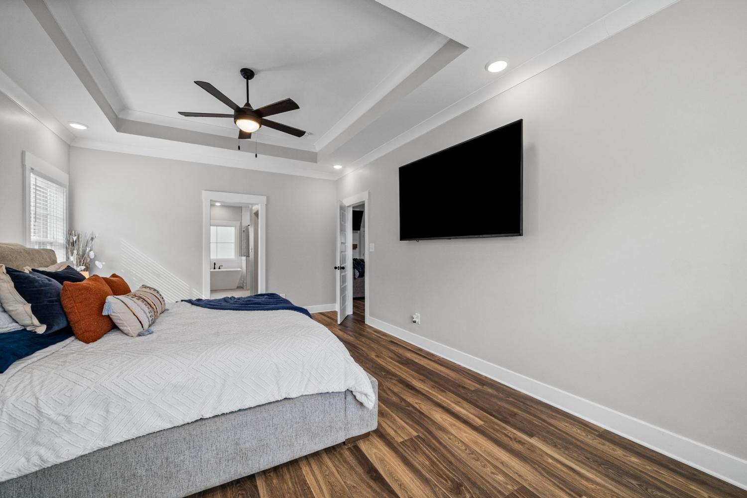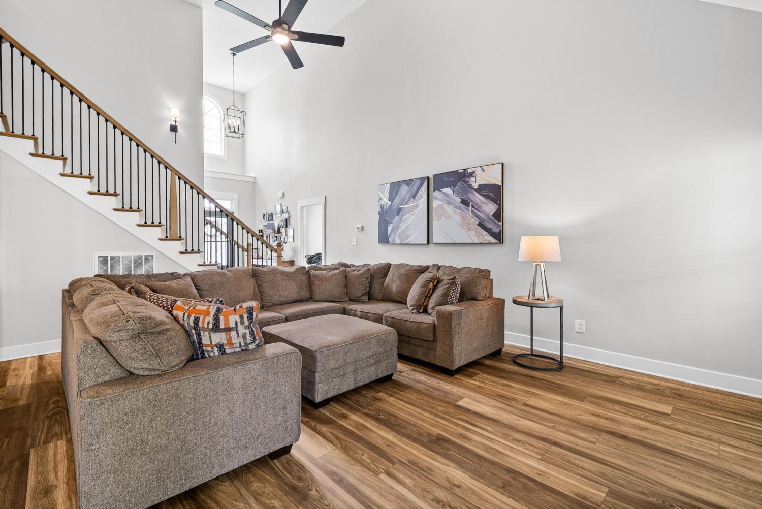 Don't miss out on this show stopper! Stunning vaulted foyer, grand staircase, decorative shiplap details, modern fixtures & desirable LED fireplace. The open kitchen is complete with an eat-in area, serving bar, tile backsplash, stainless appliances & upgraded cabinets. Separate formal dining room. The primary suite and an additional second bedroom with a bathroom are located on the main level. The primary suite boasts TWO walk-in closets, a free-standing tub, and a full tile shower with a glass enclosure. Located on the second level are two additional bedrooms with a shared bathroom along with a large versatile bonus room. Covered deck, treed lot and situated in a cul-de-sac.
