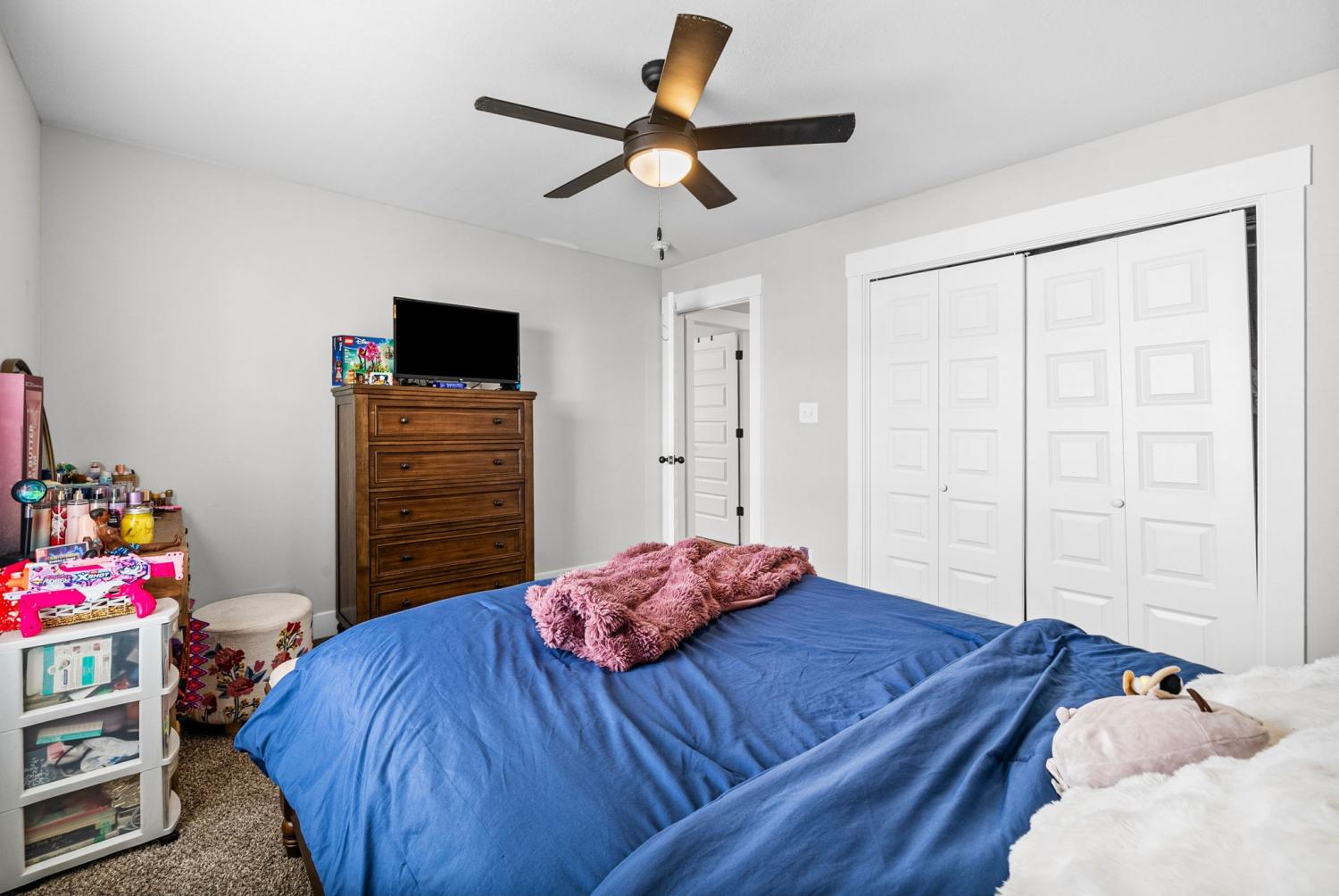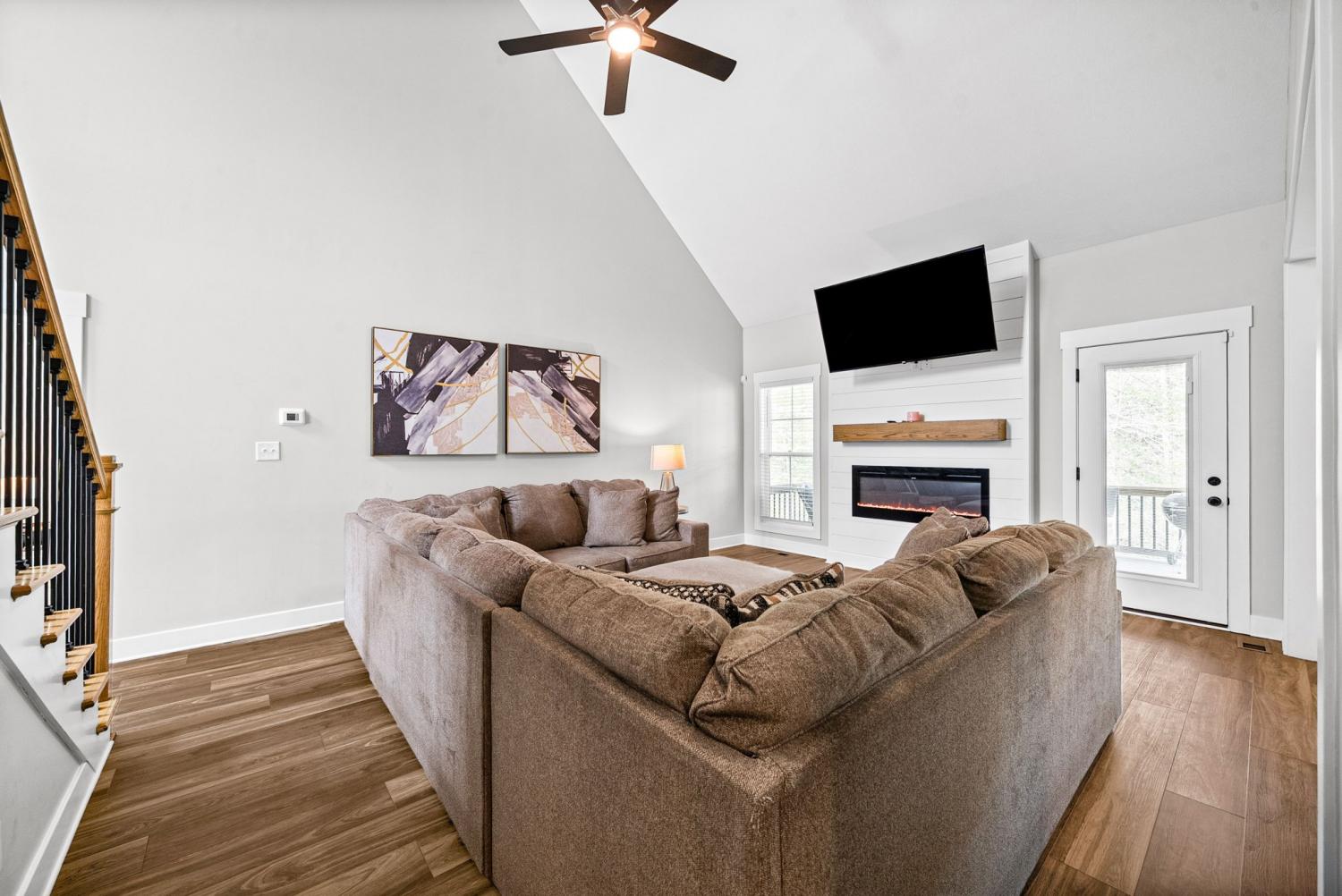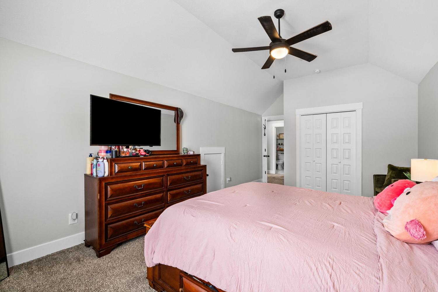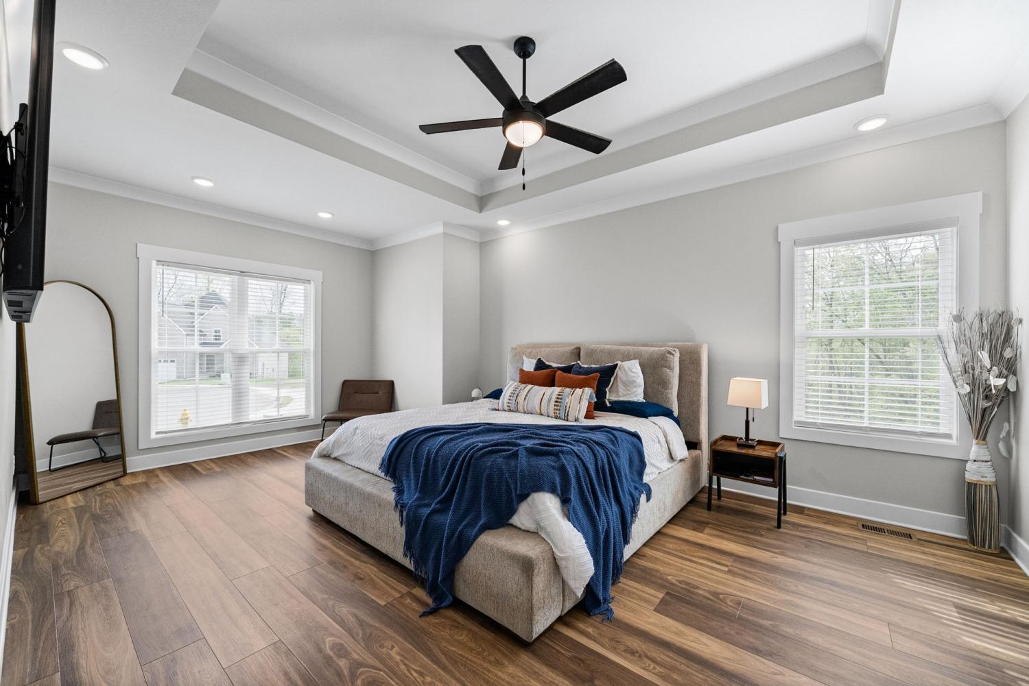 Don't miss out on this show stopper! Stunning vaulted foyer, grand staircase, decorative shiplap details, modern fixtures & desirable LED fireplace. The open kitchen is complete with an eat-in area, serving bar, tile backsplash, stainless appliances & upgraded cabinets. Separate formal dining room. The primary suite and an additional second bedroom with a bathroom are located on the main level. The primary suite boasts TWO walk-in closets, a free-standing tub, and a full tile shower with a glass enclosure. Located on the second level are two additional bedrooms with a shared bathroom along with a large versatile bonus room. Covered deck, treed lot and situated in a cul-de-sac.