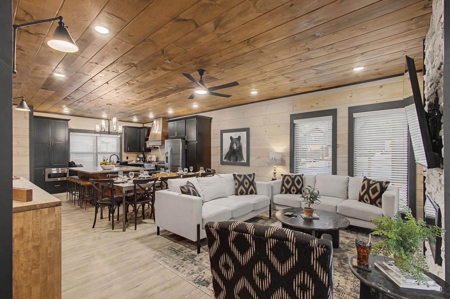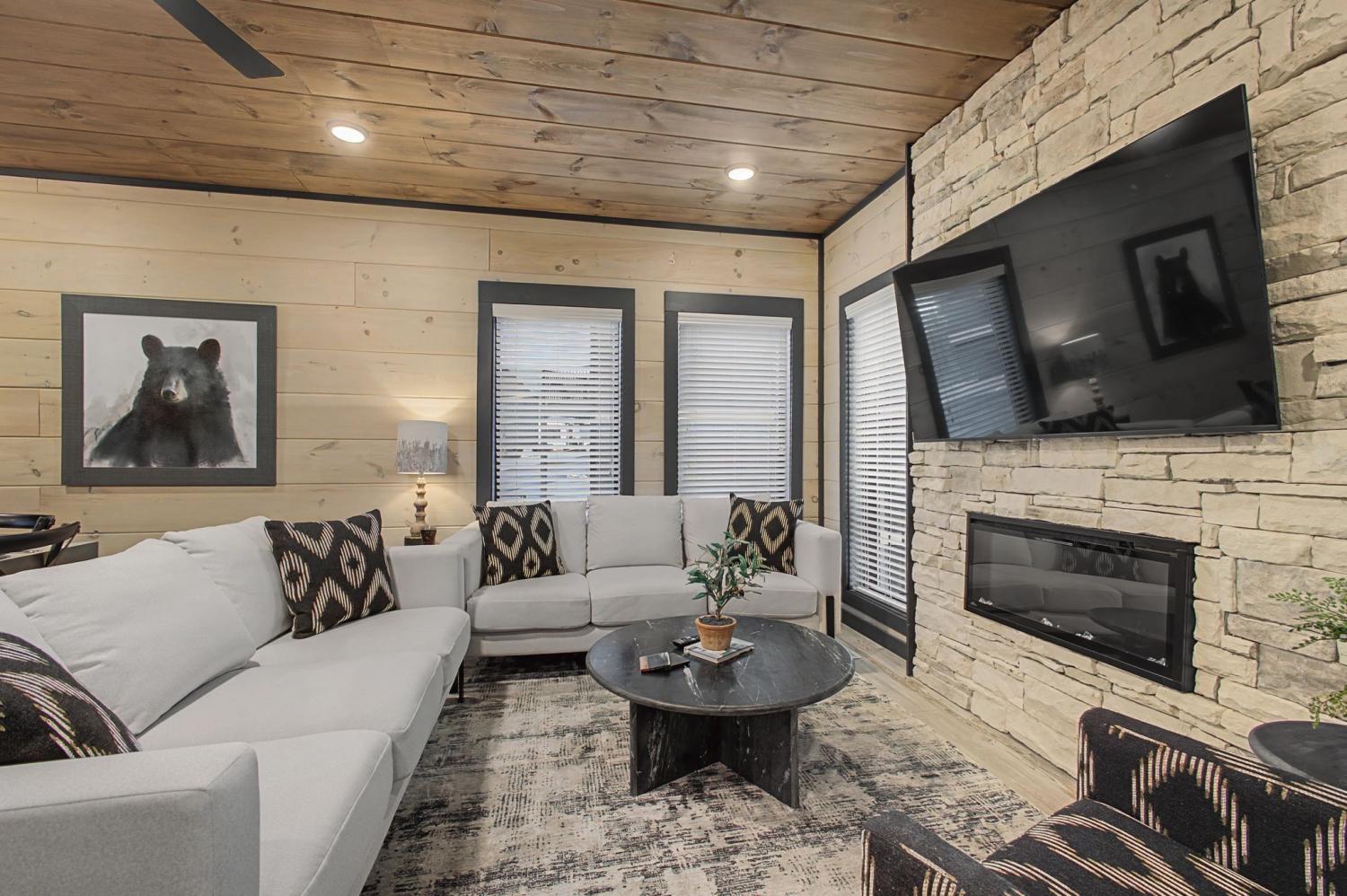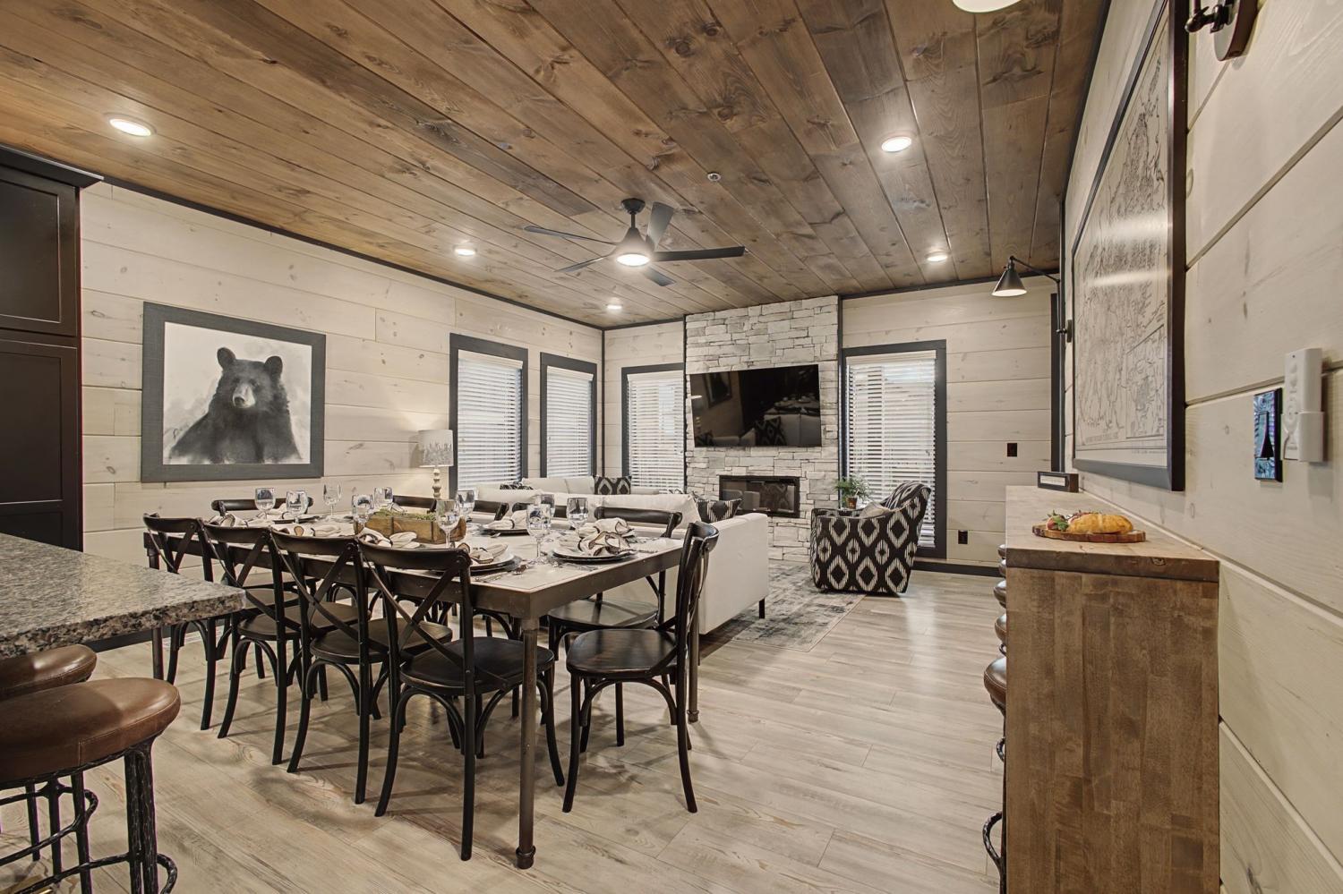 Exclusive, multi-million-dollar WATER PARK within the community—privately owned by HOA members and INCLUDED in the cabin purchase. No admission fees for overnight rental guests. This stunning 5-bedroom cabin features a PRIVATE INDOOR POOL, private movie theatre, and game room, all wrapped in contemporary styling with high-end designer finishes throughout. The cabin conveys fully furnished, including a fully stocked kitchen and all appliances, making it truly turn-key. Outdoor living is equally impressive with a dedicated gathering space and firepit, ideal for entertaining and guest enjoyment. Built with safety and peace of mind in mind, the home is fully sprinklered and equipped with a central fire-station monitored alarm system. ABSOLUTE MUST-SEE. Located just 1 mile from the Parkway, with NO restrictions on self-management or third-party cabin management—a rare opportunity for both owners and investors.