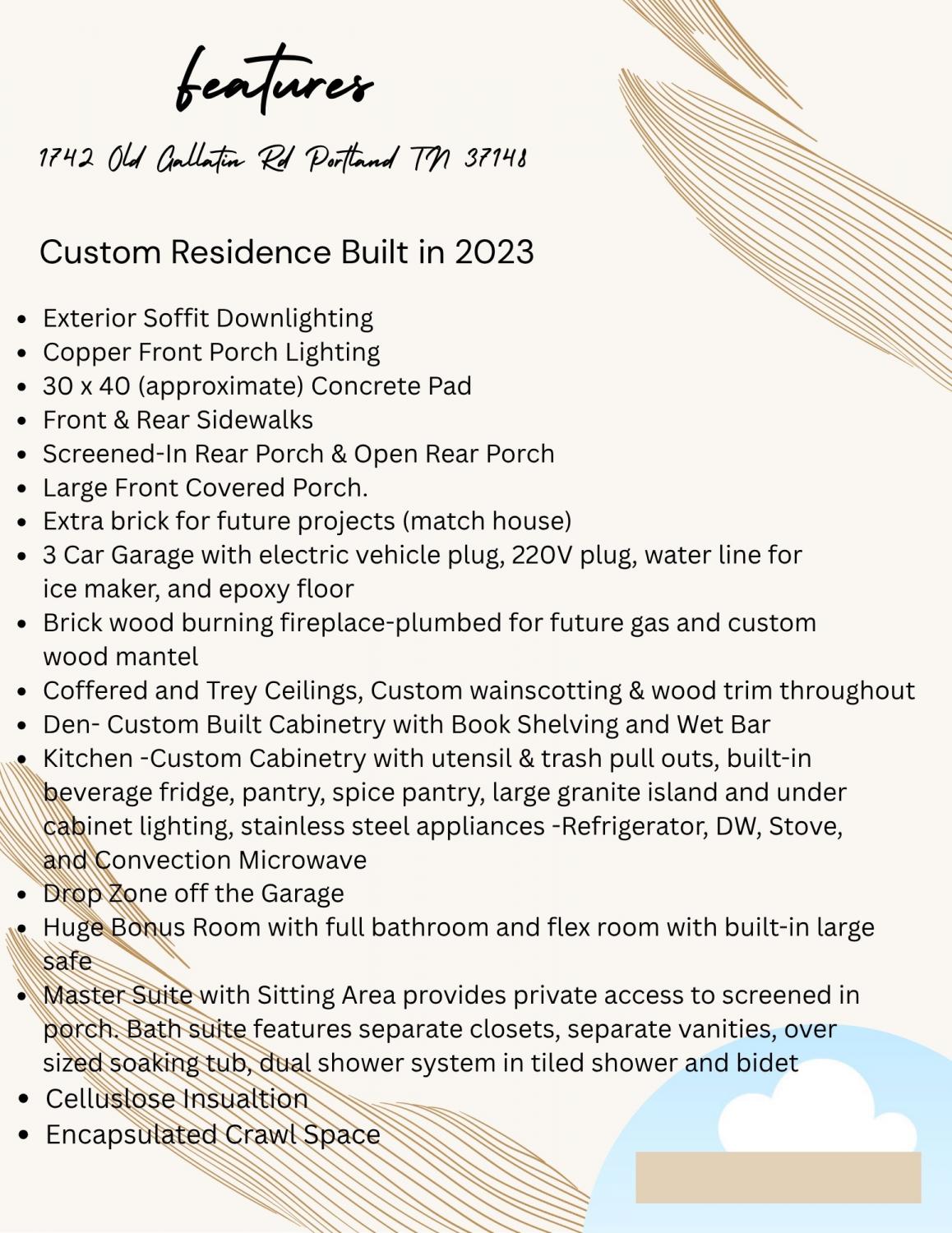 Welcome to this Exceptional 2023 Custom Built Home offering the perfect location to all things! Only 45 minutes to Nashville or Bowling Green,KY and minutes to all things local in Hendersonville & Gallatin... Boat Ramps, Golf Courses, Restaurants, Shopping & Entertainment! Situated on 1.89 Acres this meticulously designed property features high level craftsmanship, custom cabinetry and exquisite trim work throughout. Step inside to discover soaring ceilings and an elegant coffered ceiling that add character to the open-concept living spaces. The gourmet kitchen is complete with custom cabinetry, a dedicated pantry, spice pantry, custom pull-outs, beverage refrigerator and expansive granite island for your prepping needs. Enjoy seamless indoor-outdoor living with a screened-in porch, accessible directly from the living space and master suite. The luxurious primary suite includes a sitting area, separate closets and vanities, oversized soaking tub, a spa-like tiled shower and private access to the screened porch. Entertain with ease in one of the three living spaces this home offers. The living room boasts an abundance of natural light, soaring ceilings and a wood burning fireplace which is also plumbed for future gas. The cozy den provides built-in cabinetry/open shelving and a wet bar. The expansive recreational room over the garage features a full bathroom and a flex room (perfect office) with endless potential. Outside, the home impresses with copper light fixtures, impressive downlighting, front and rear sidewalks, 900sf 3 car garage, electric car plug, 30x40 concrete pad ideal for adding a large workshop/garage. This one of a kind property blends upscale finishes with functionality, making it the perfect place to call home. No HOA. So many more property details -view the Feature Sheet provided with the photos.